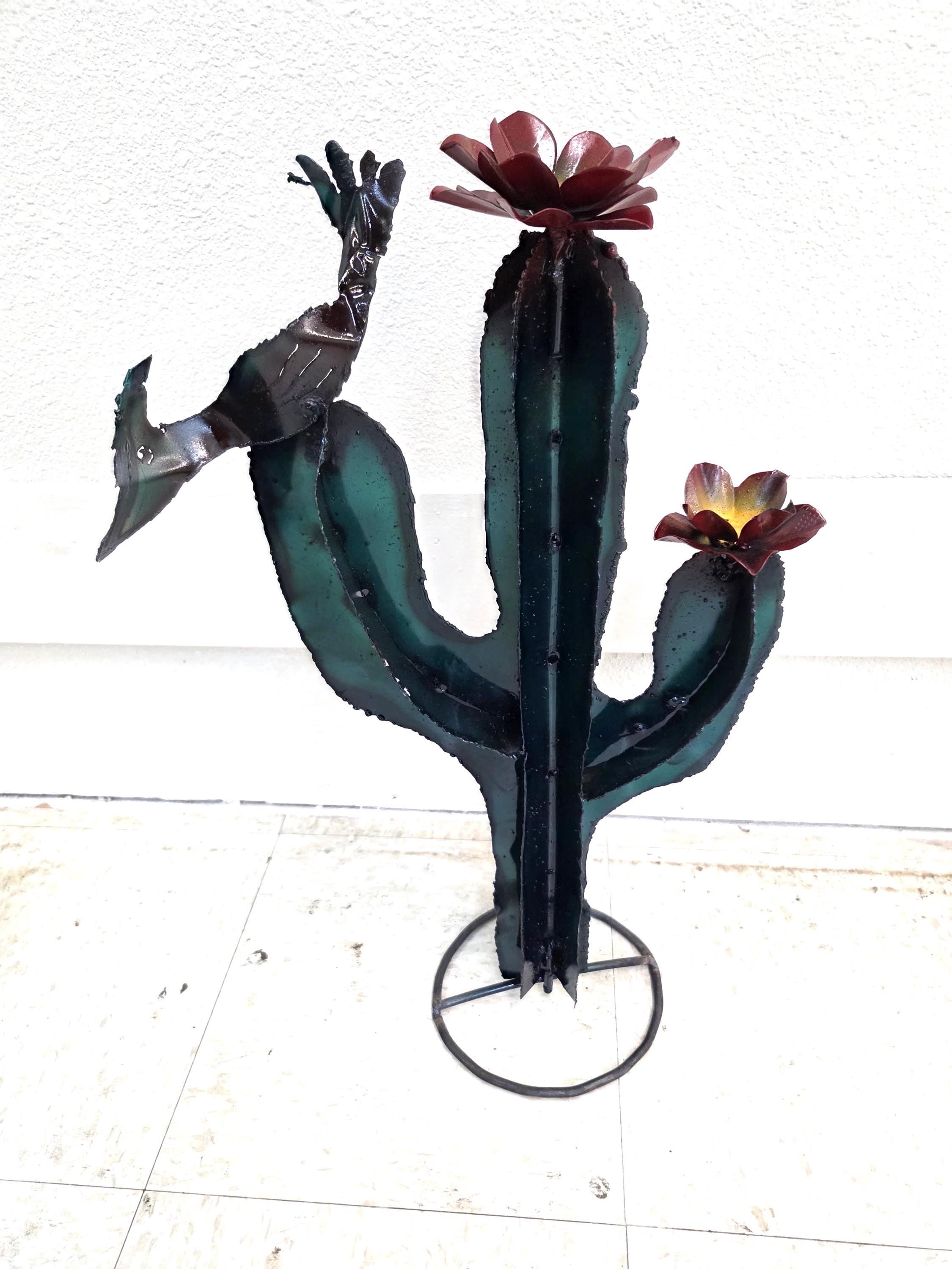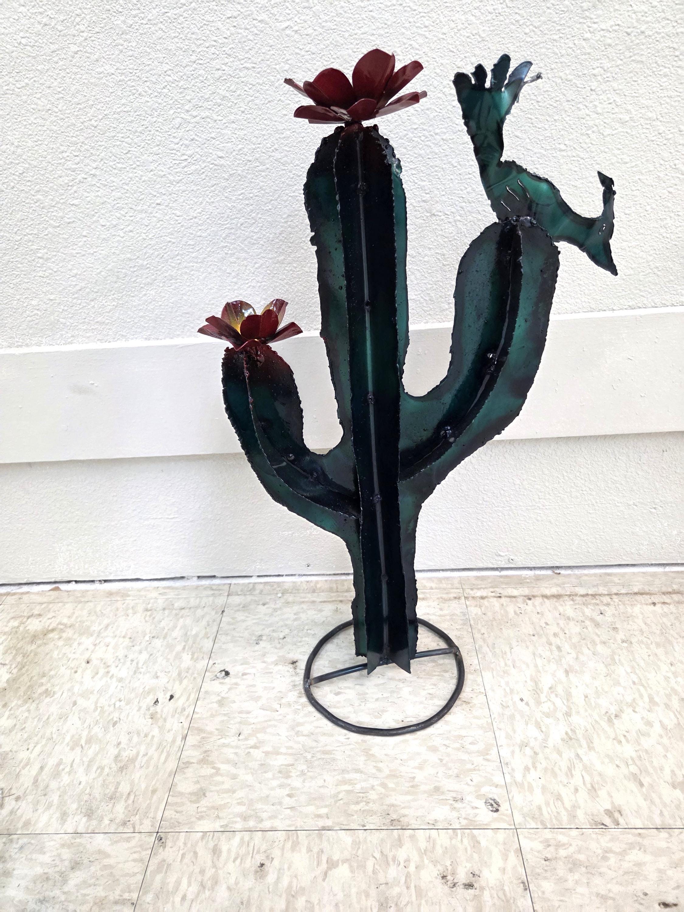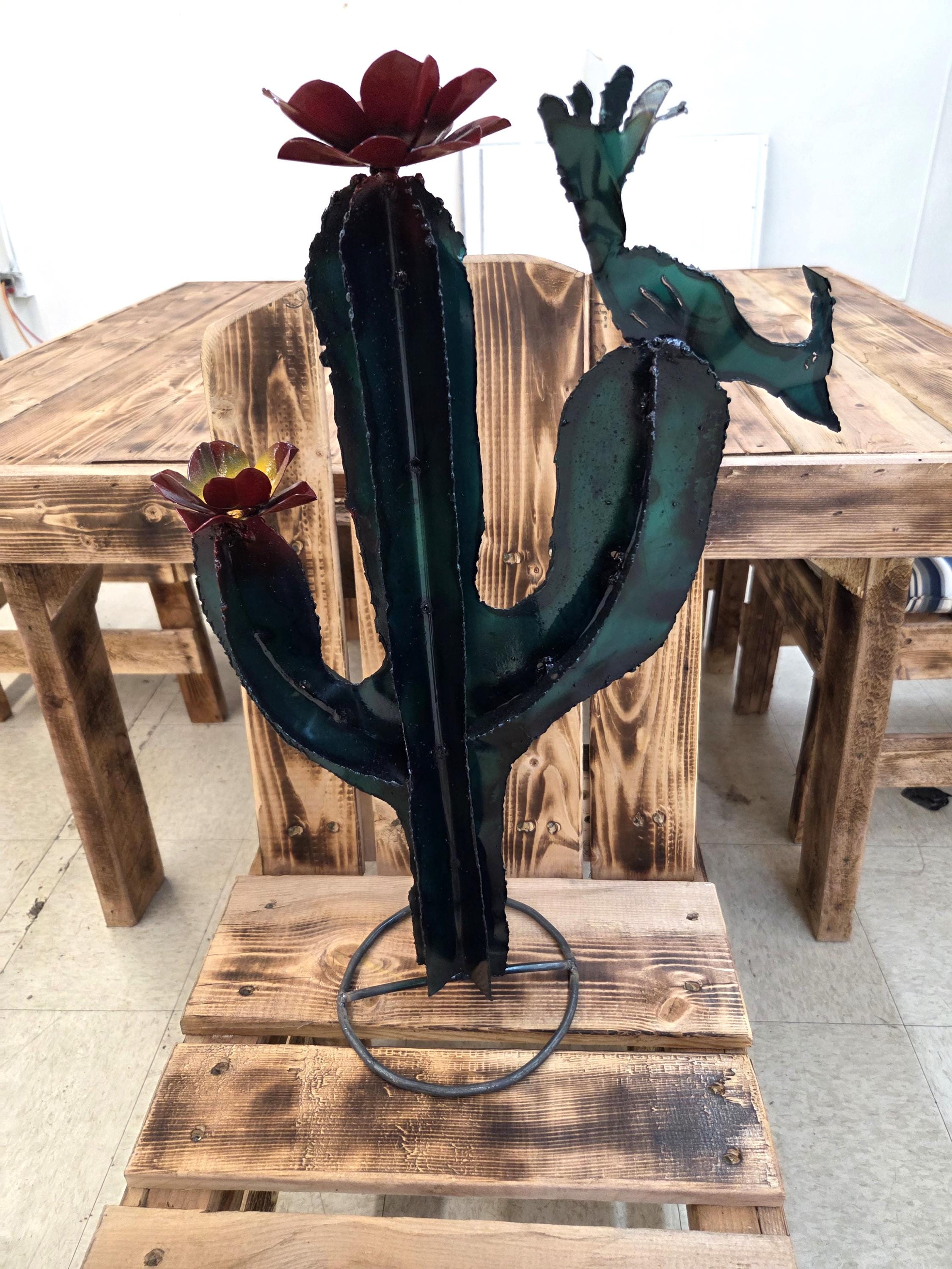 This handmade metal saguaro brings the warmth of the Southwest into any space, featuring a 22-inch-tall rustic cactus silhouette accented with a charming quail and two hand‑formed flowers. Each piece is cut, shaped, and finished by hand, giving it a naturally weathered texture and unique character that feels authentically desert‑inspired. Its sturdy metal construction makes it suitable for both indoor display and outdoor garden décor, where it catches light beautifully and adds a touch of desert whimsy. Whether used as a focal point on a patio wall, part of a gallery arrangement, or a thoughtful gift for someone who loves the Sonoran landscape, it offers a blend of artistry and nature that feels warm, inviting, and distinctly Southwestern.