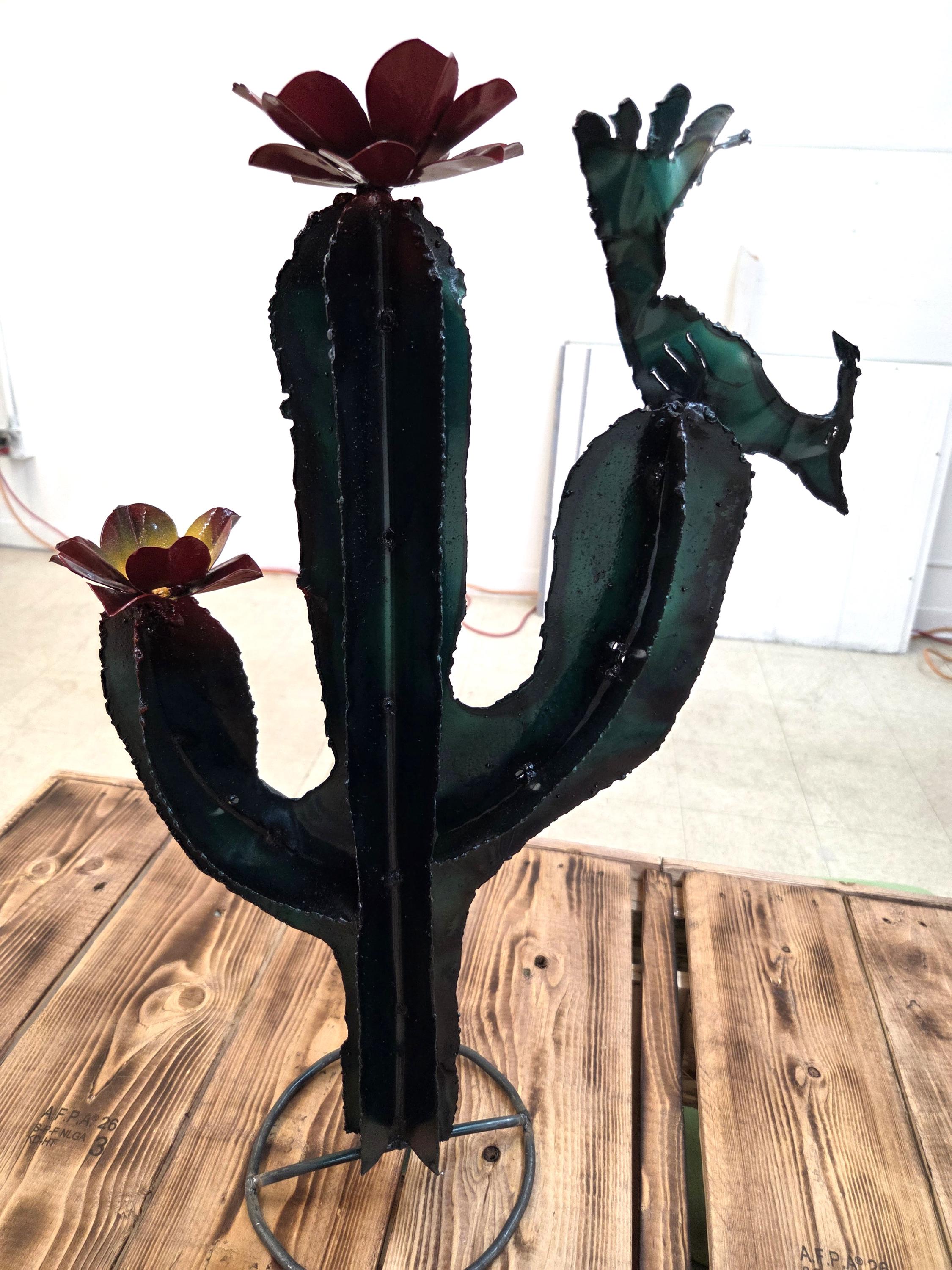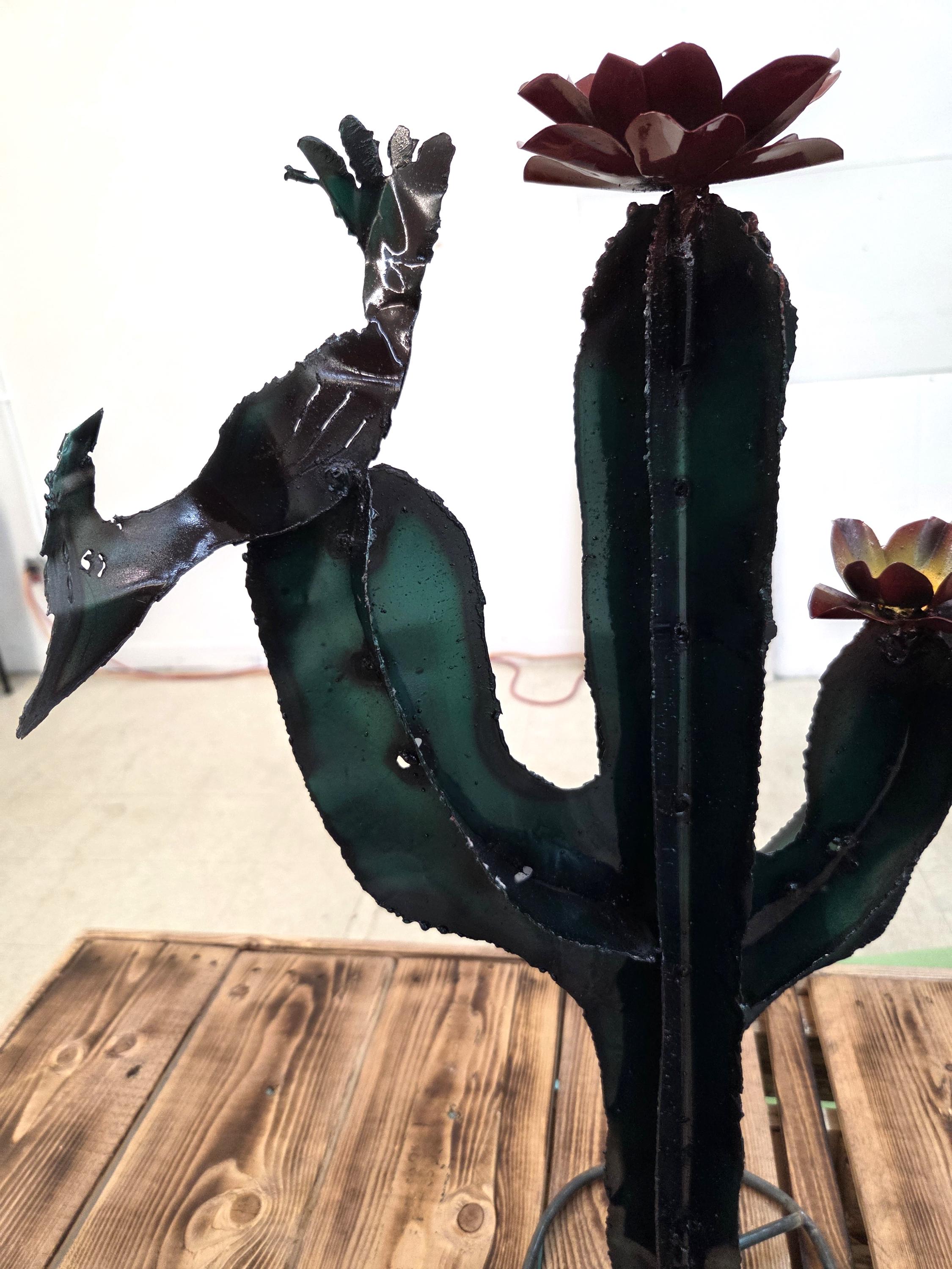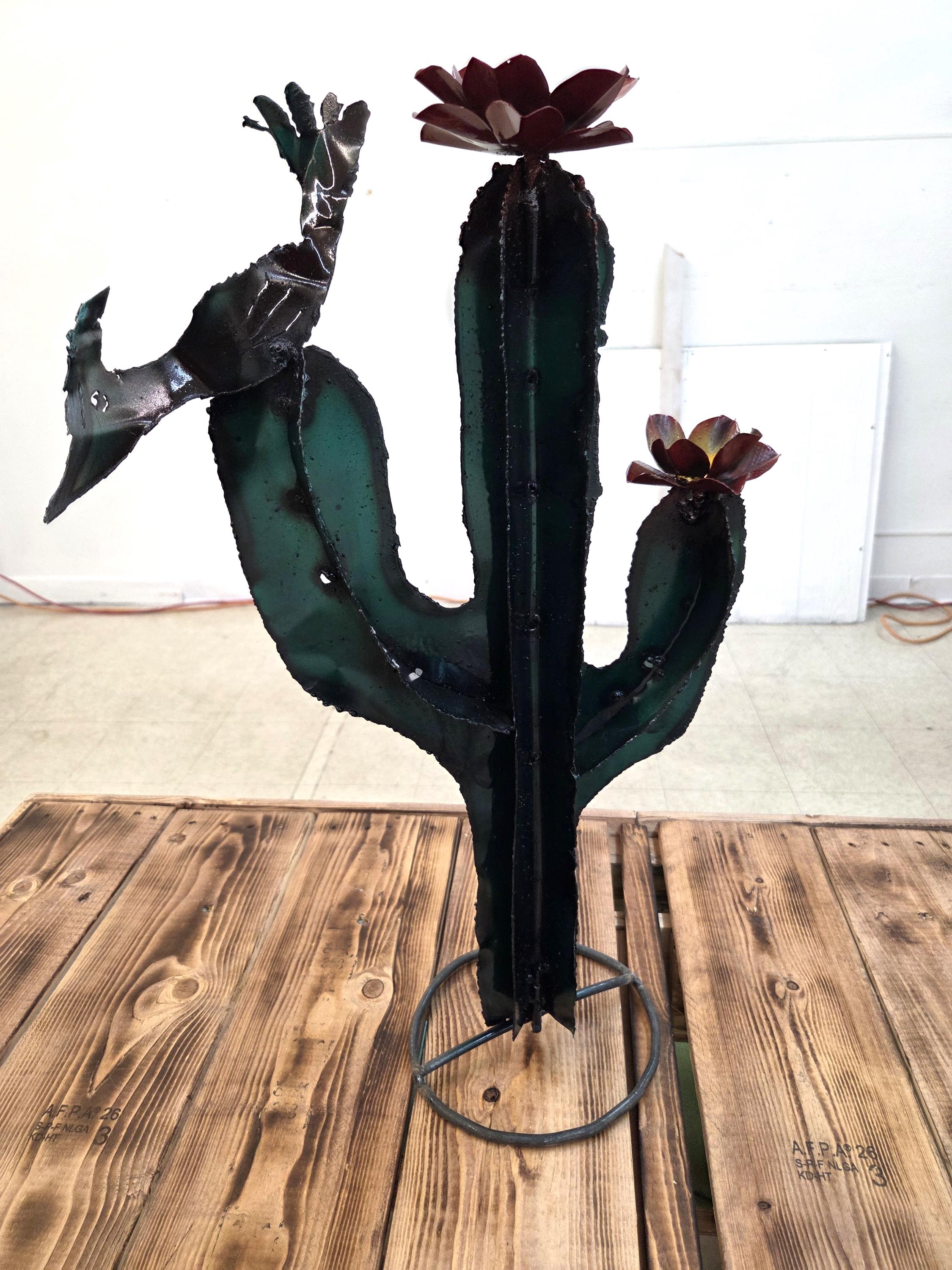 This handmade metal saguaro brings the warmth of the Southwest into any space, featuring a 22-inch-tall rustic cactus silhouette accented with a charming quail and two hand‑formed flowers. Each piece is cut, shaped, and finished by hand, giving it a naturally weathered texture and unique character that feels authentically desert‑inspired. Its sturdy metal construction makes it suitable for both indoor display and outdoor garden décor, where it catches light beautifully and adds a touch of desert whimsy. Whether used as a focal point on a patio wall, part of a gallery arrangement, or a thoughtful gift for someone who loves the Sonoran landscape, it offers a blend of artistry and nature that feels warm, inviting, and distinctly Southwestern.