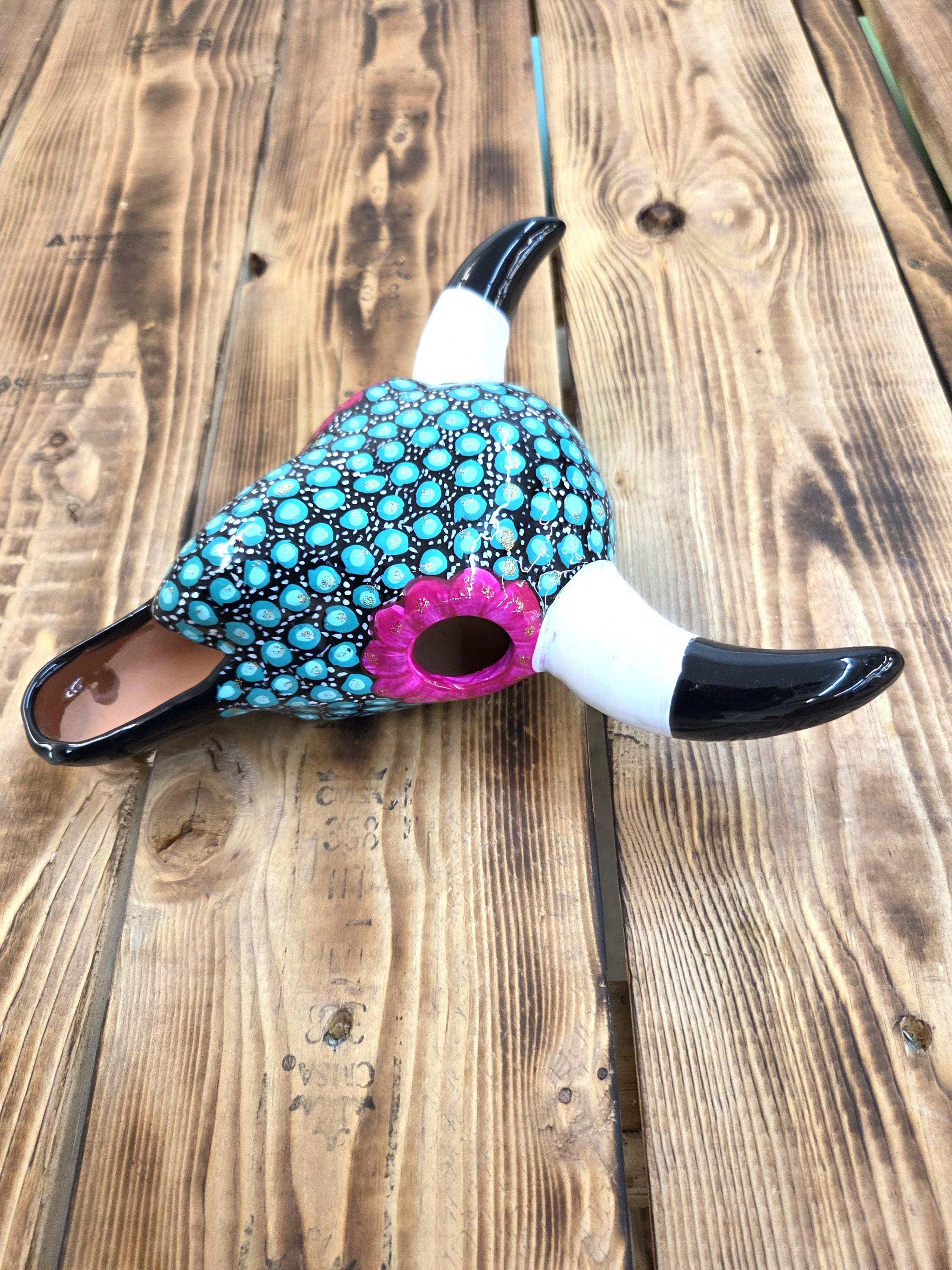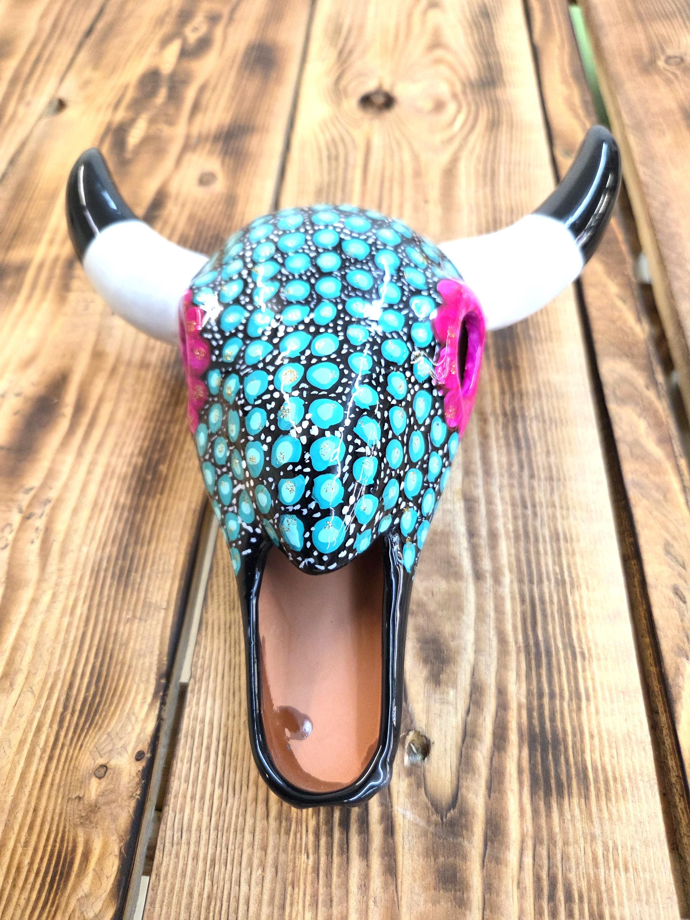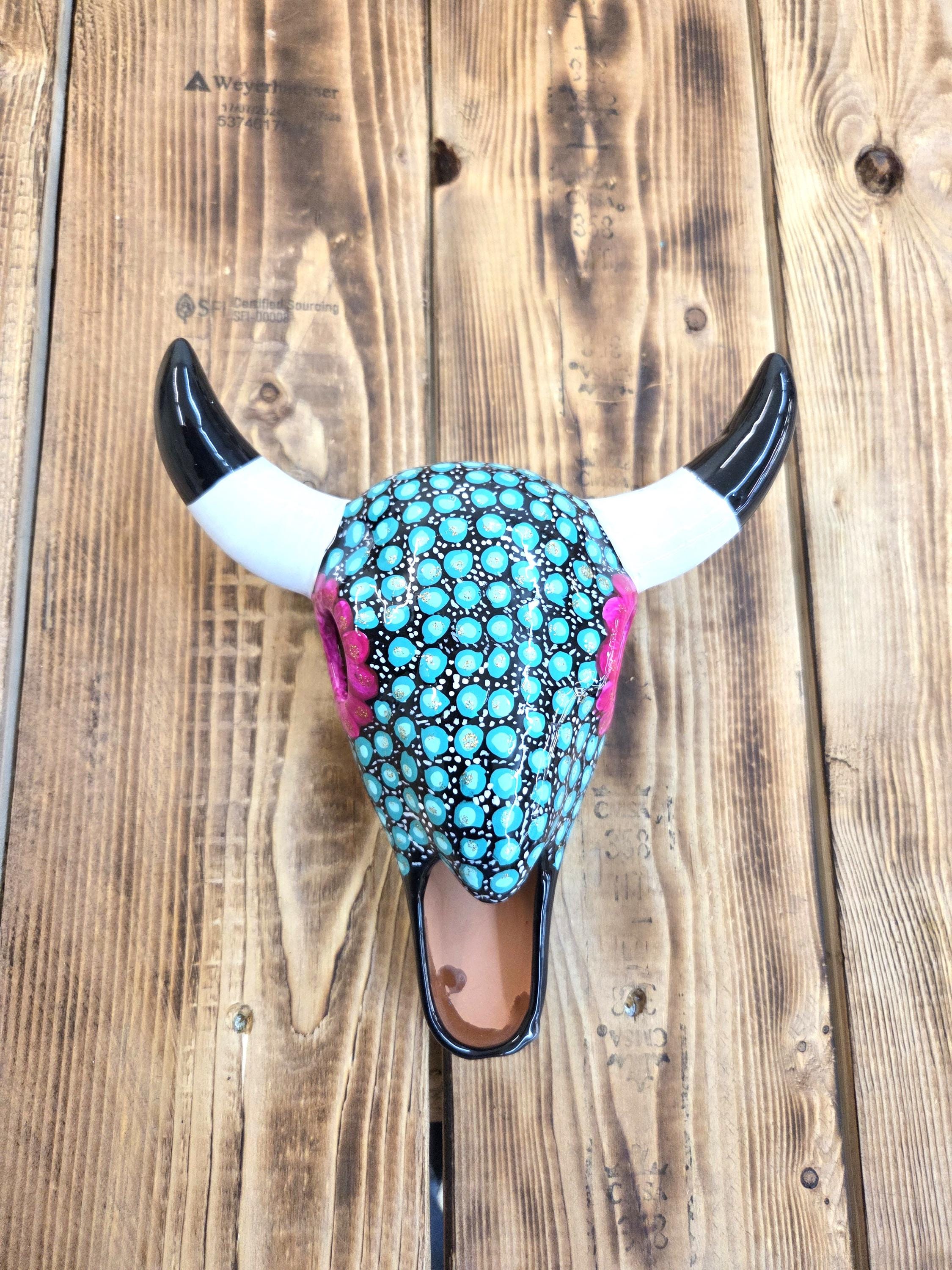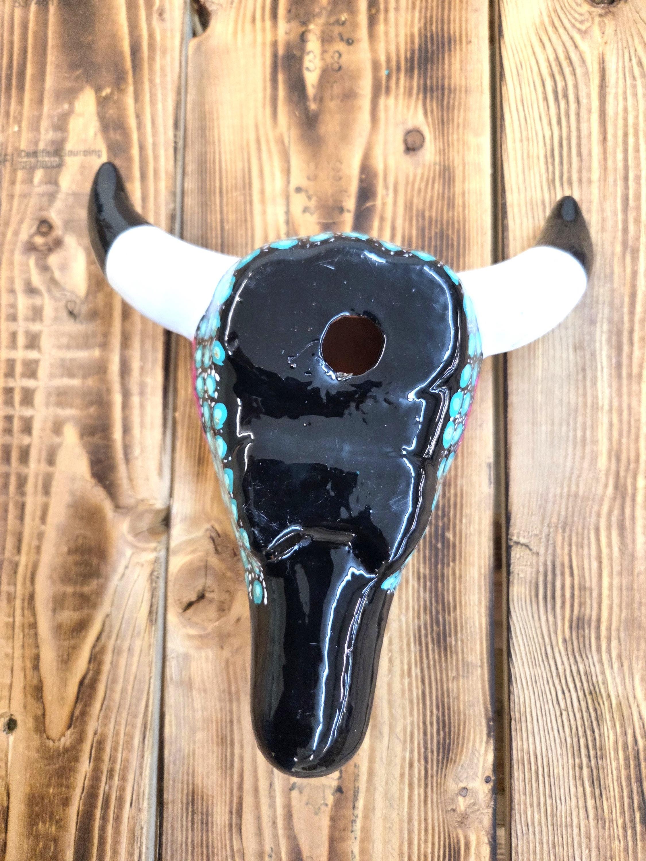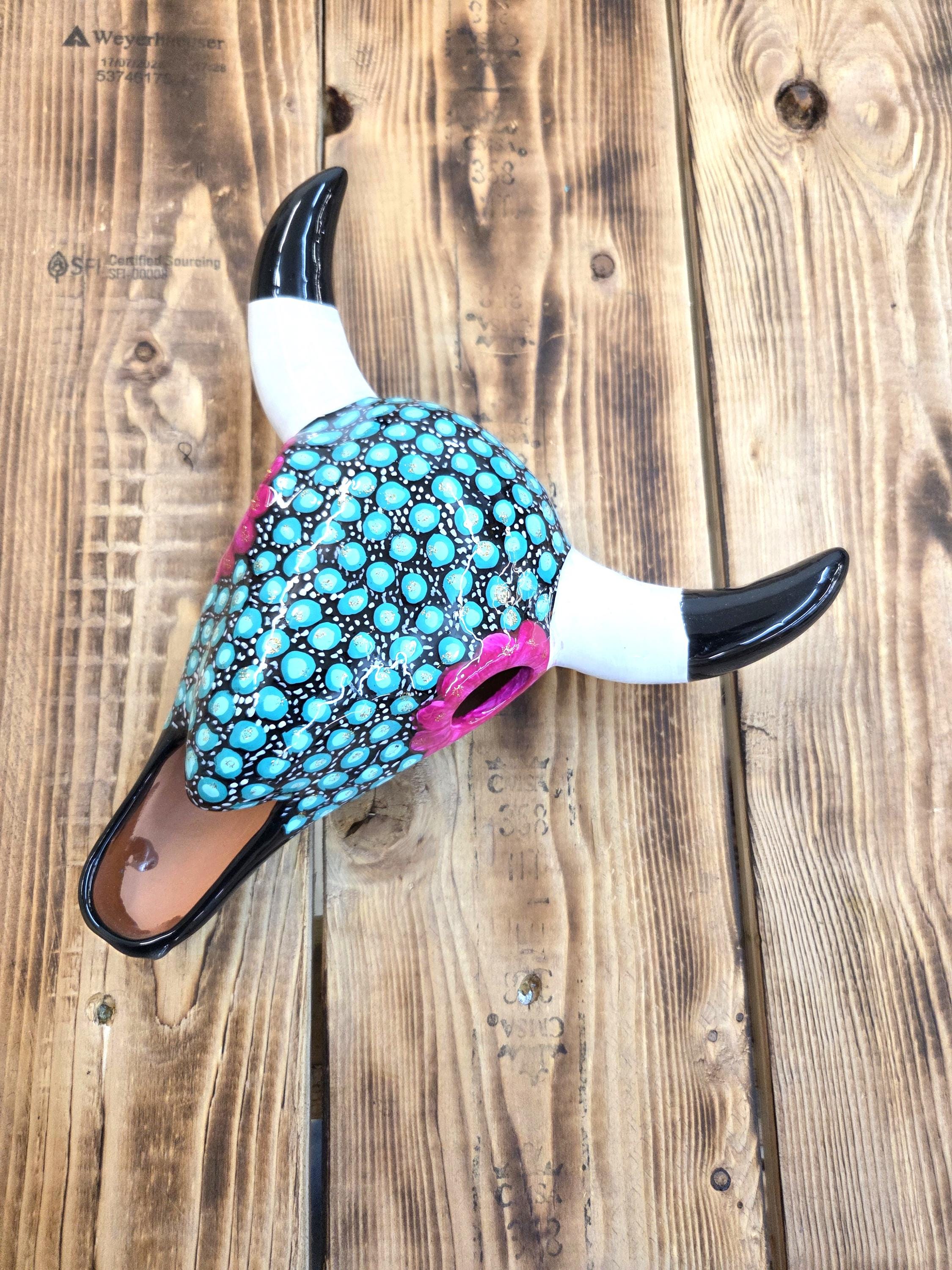 This 9" hand‑painted ceramic cow steer skull brings a touch of rustic Western charm to any space, blending artisan craftsmanship with bold, boho‑inspired detail. Each piece is carefully handmade and uniquely painted, making it a one‑of‑a‑kind accent perfect for hanging on the wall or displaying on a shelf. Its compact size makes it easy to style in entryways, living rooms, offices, or gallery walls, adding a Southwestern flair that feels both modern and timeless. A beautiful statement piece for anyone who loves handcrafted décor with personality.