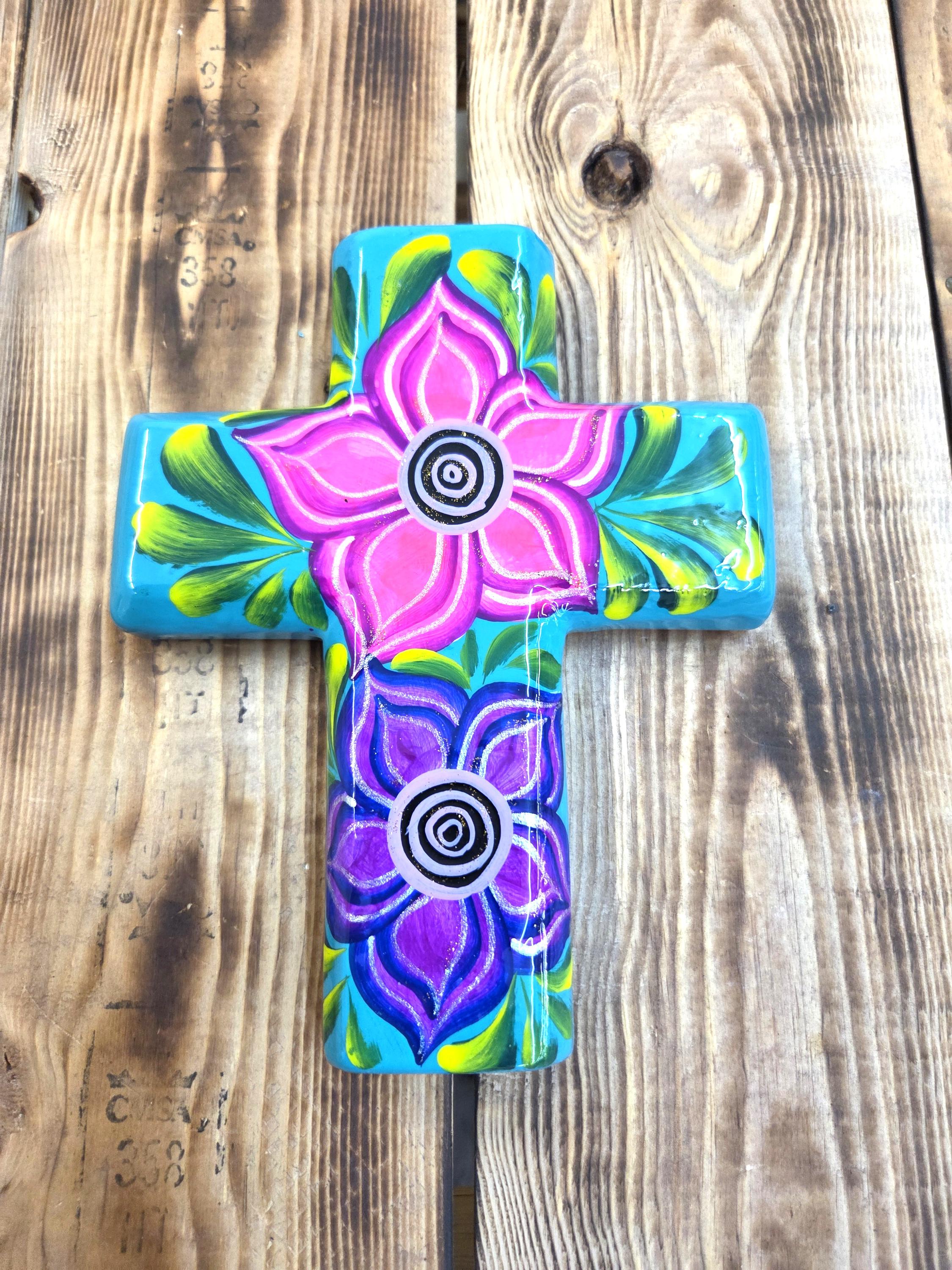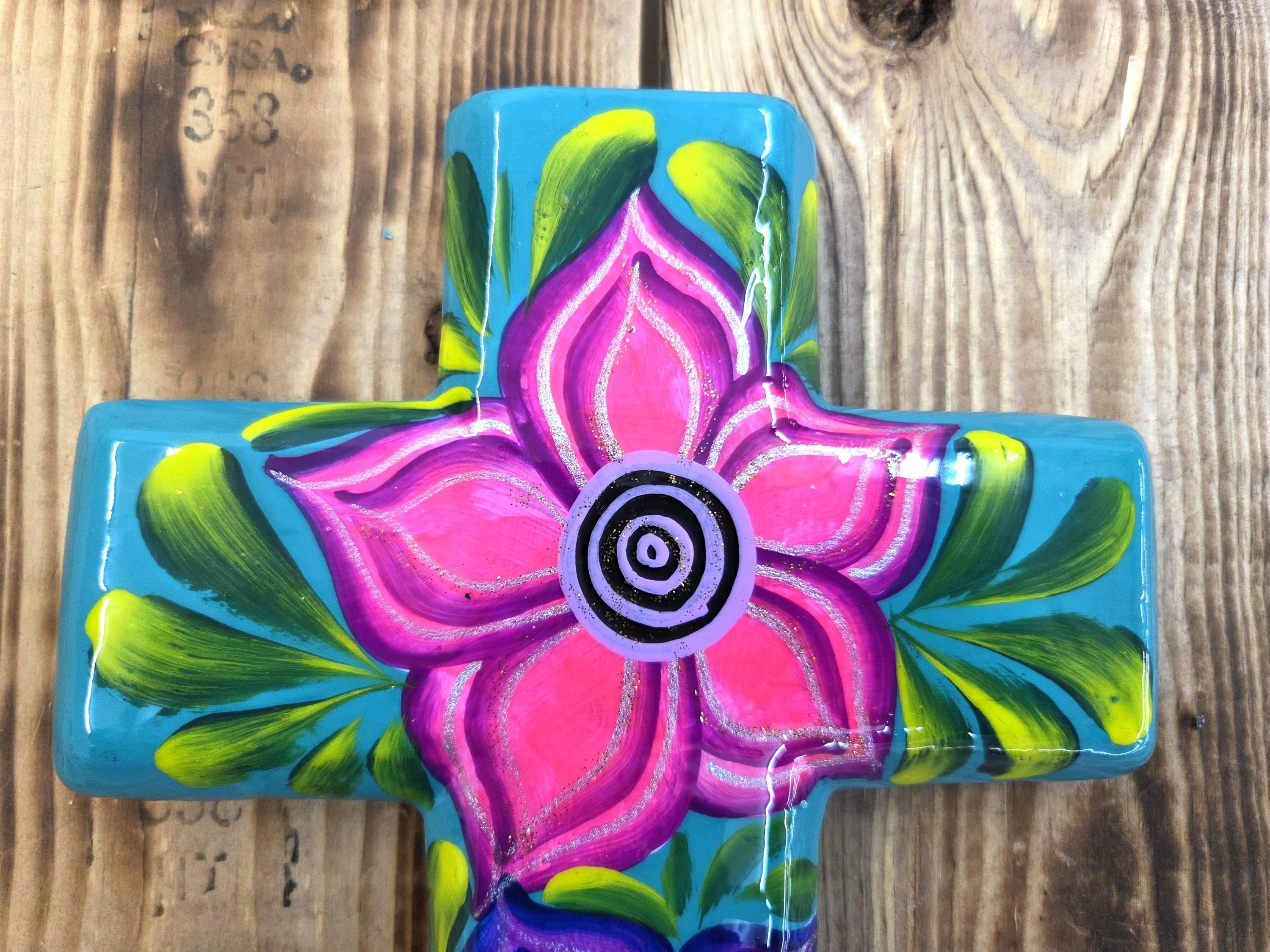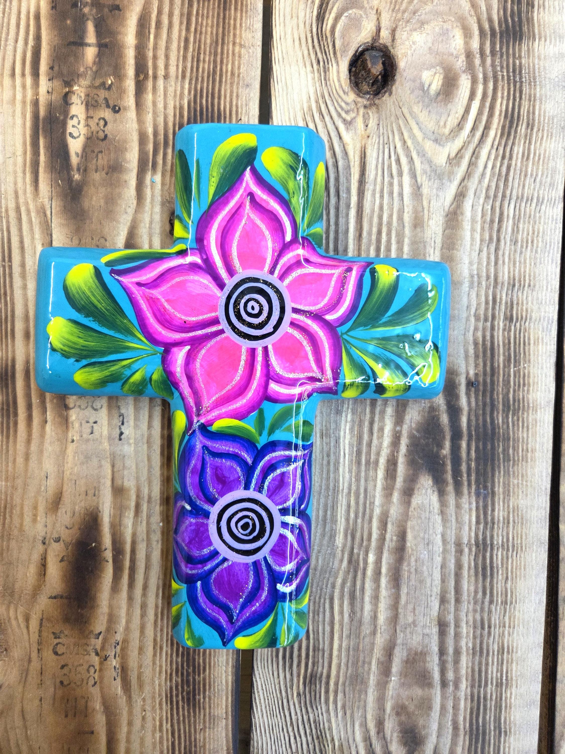 Add a touch of authentic Mexican artistry to your home with this one‑of‑a‑kind hand‑painted cross, crafted by skilled artisans in Mexico. Standing approximately 8¼" tall and 6½" wide, each piece features unique, irregular shaping and beautifully detailed hand‑painted designs that celebrate traditional craftsmanship. Because every cross is handmade rather than machine‑produced, slight imperfections may appear—these natural variations are part of its charm and ensure that no two pieces are ever alike. The cross includes a convenient hole on the back for easy wall hanging, making it a meaningful and eye‑catching addition to any room or a thoughtful gift for someone special.
