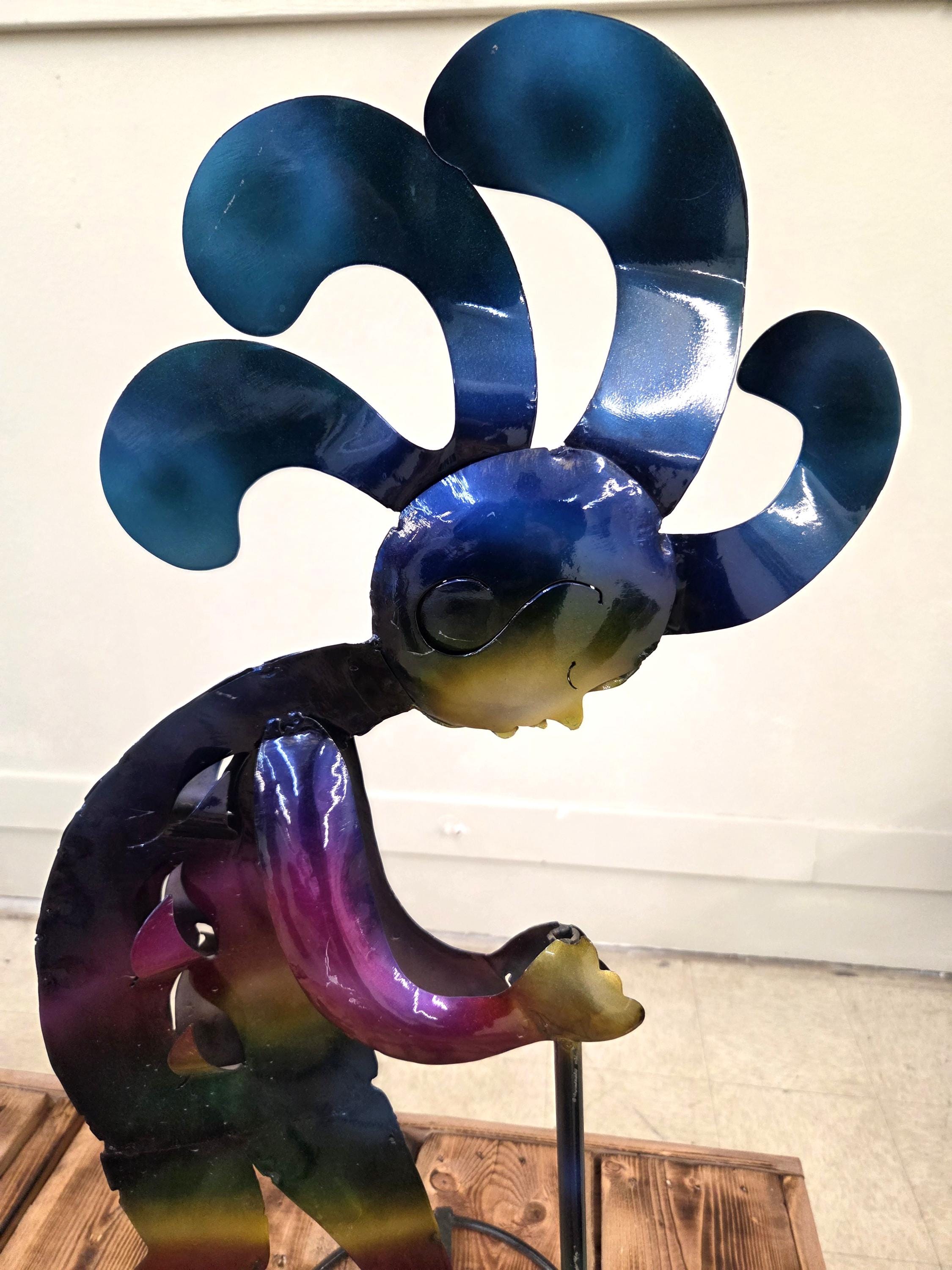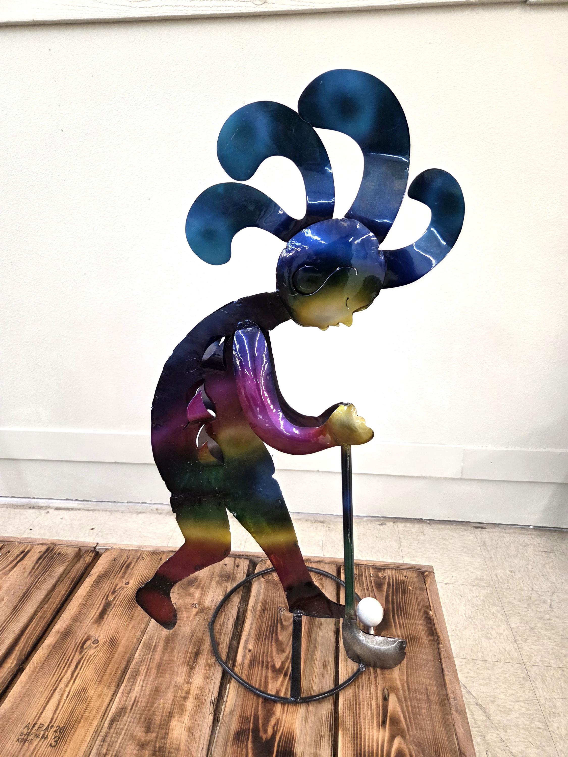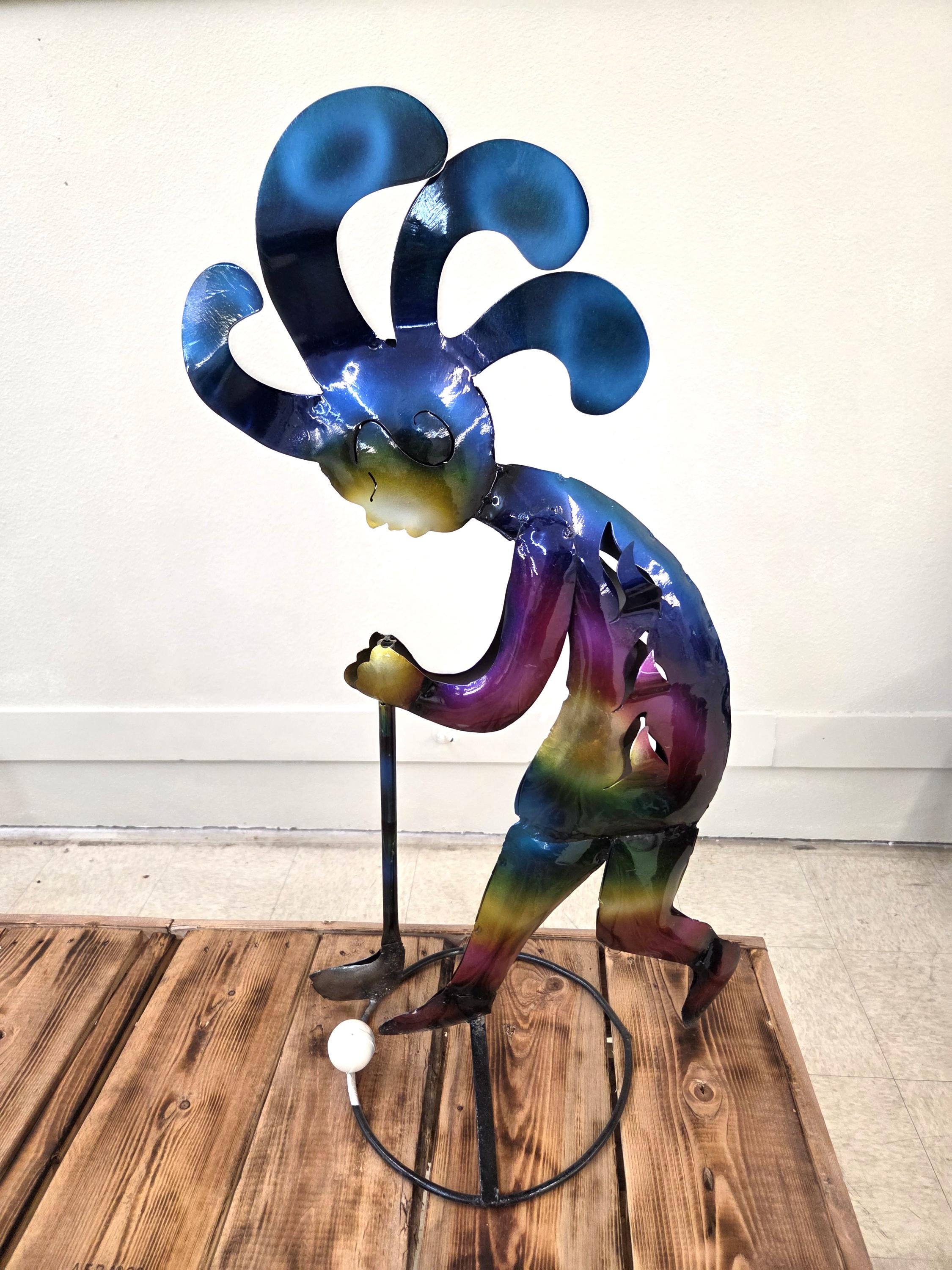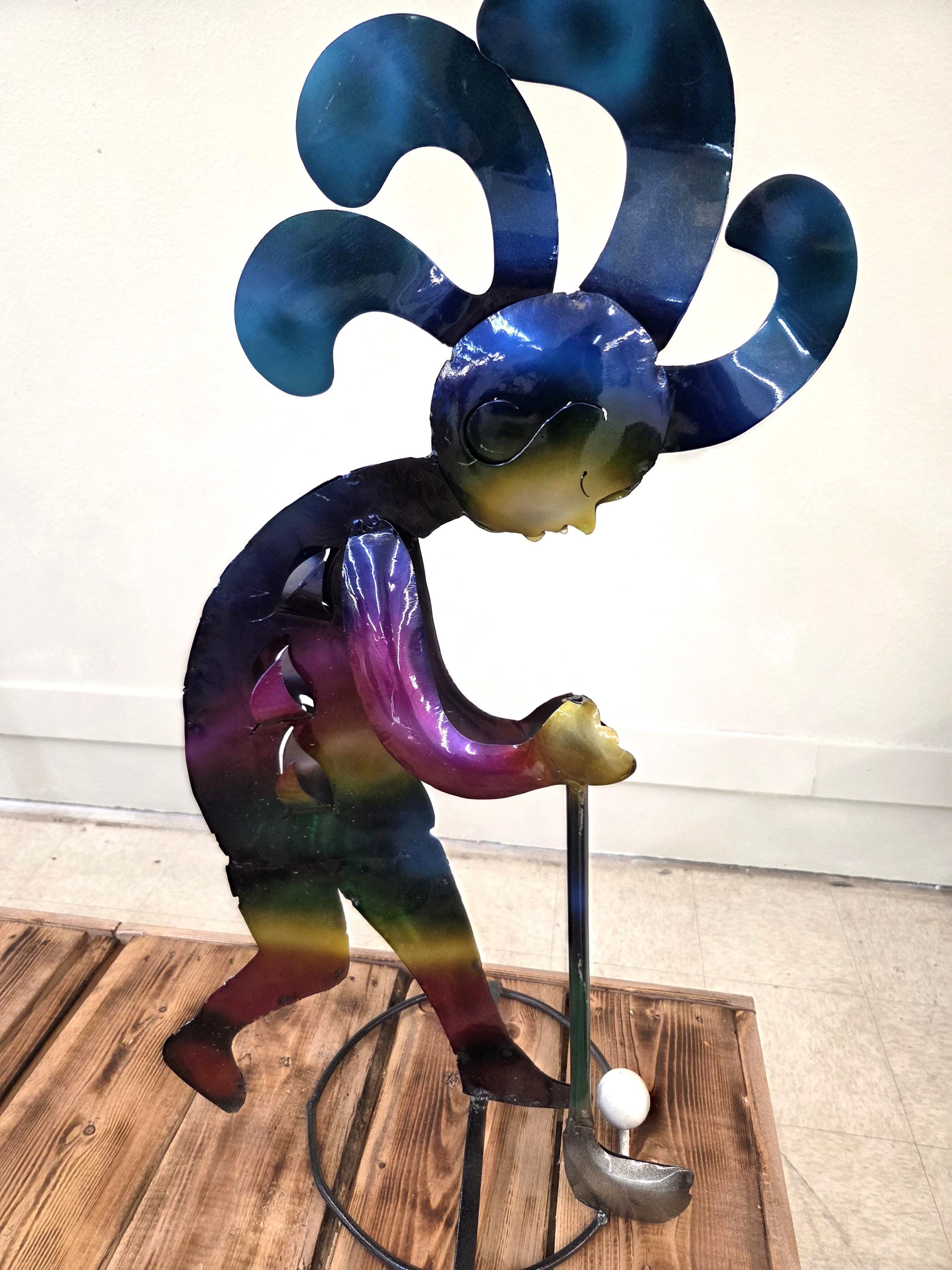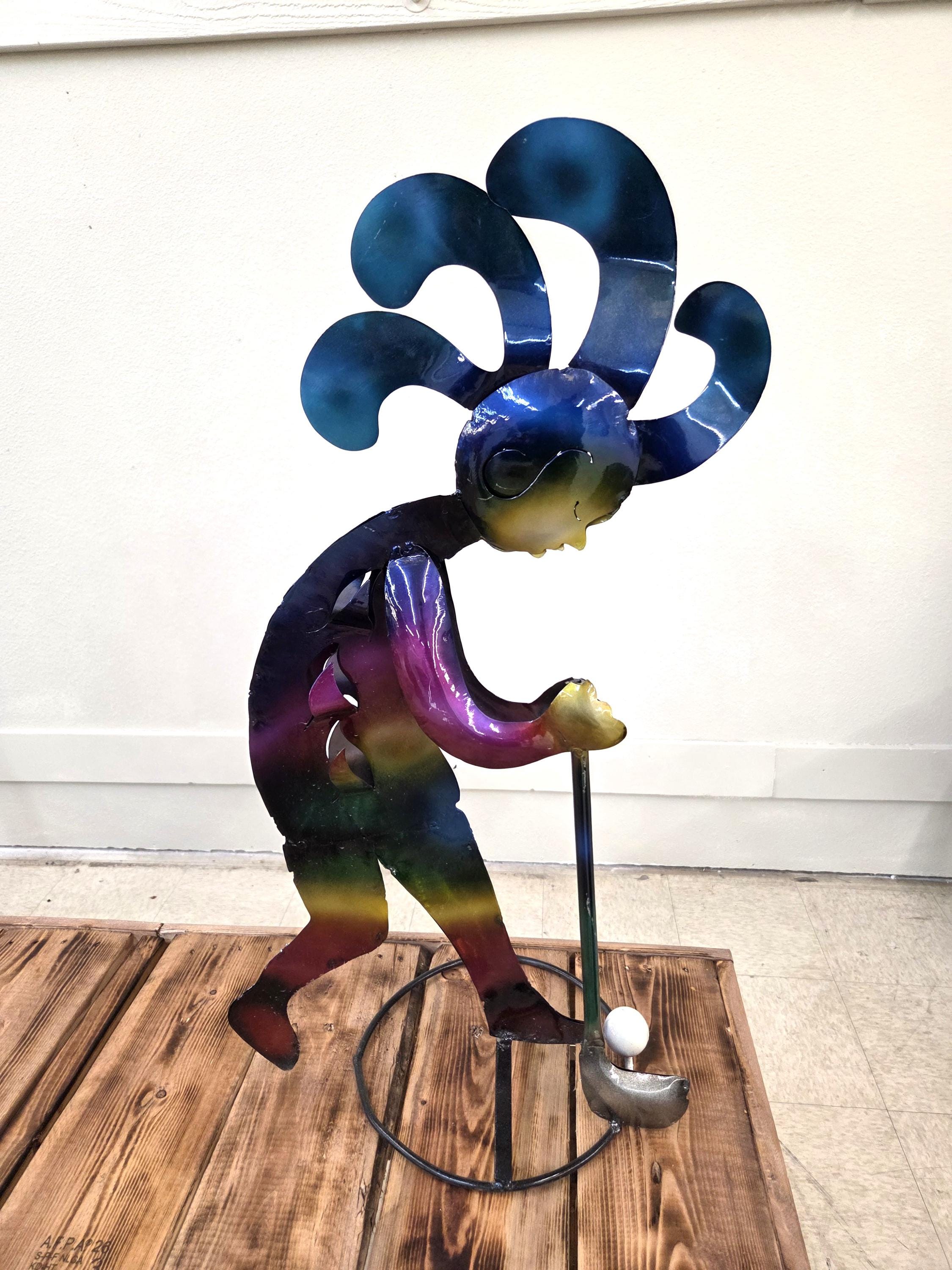Bring a burst of Southwest spirit to your home or garden with this handmade 28" metal Kokopelli golf sculpture, painted in rich, vibrant colors that catch the eye from every angle. Each piece is carefully cut, shaped, and hand‑painted, giving it a lively personality and a one‑of‑a‑kind finish. Whether displayed on a patio, near a flower bed, or indoors as unique wall art, this joyful Kokopelli adds movement, color, and playful charm to any space. A perfect gift for golf lovers, desert‑style décor fans, or anyone who appreciates handcrafted metal art. Handmade items may at times have minor flaws but the overall look is always quite beautiful.