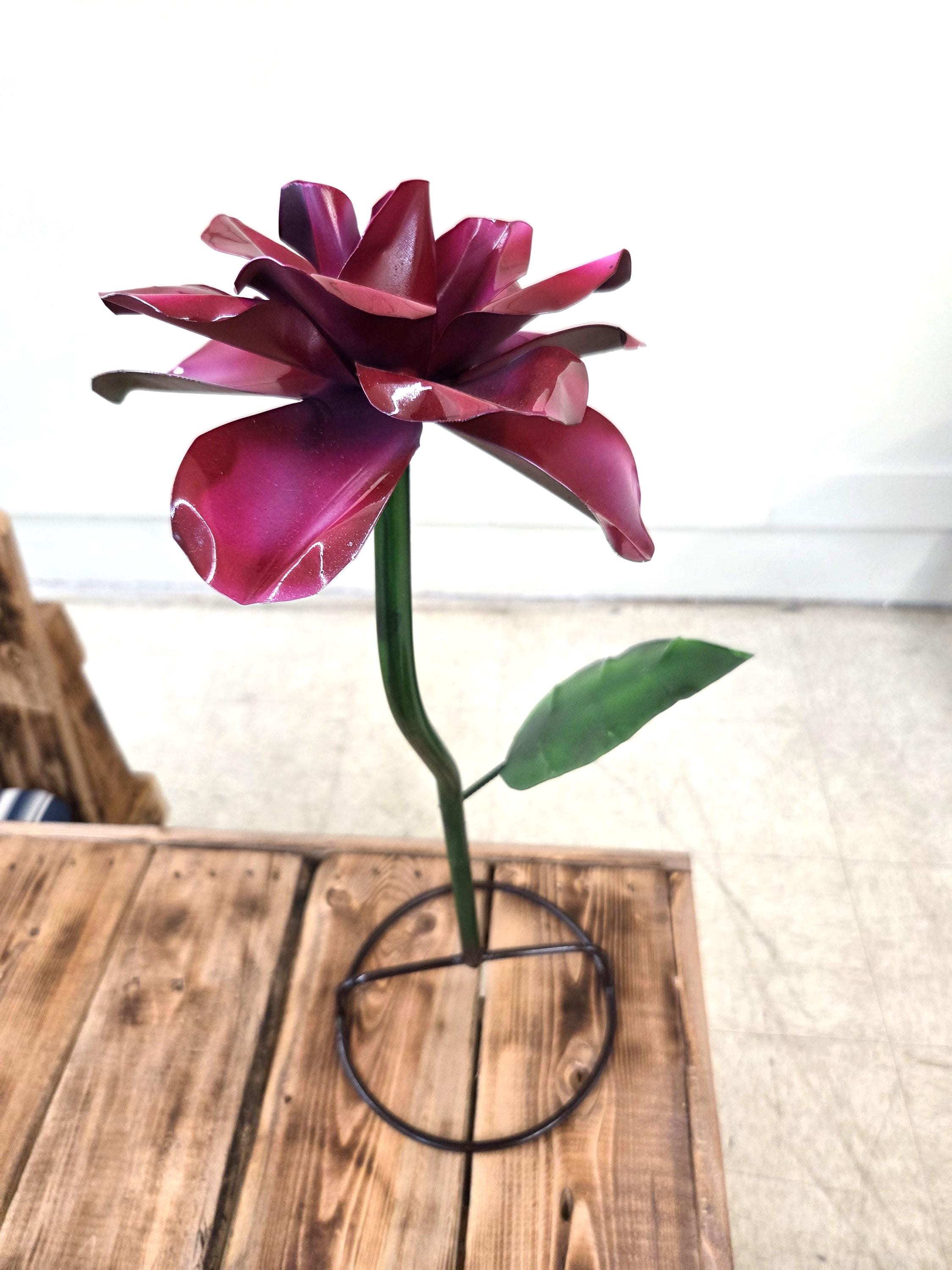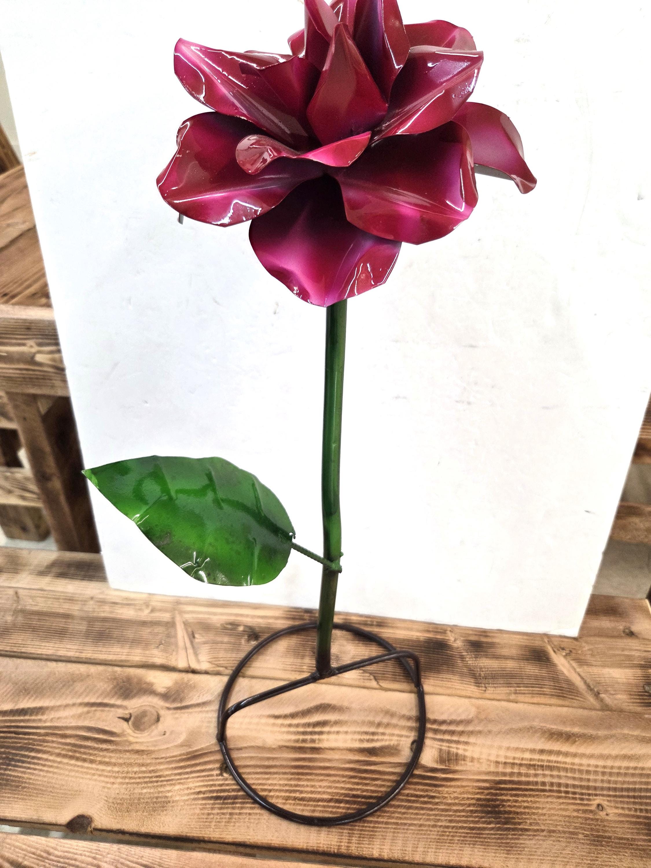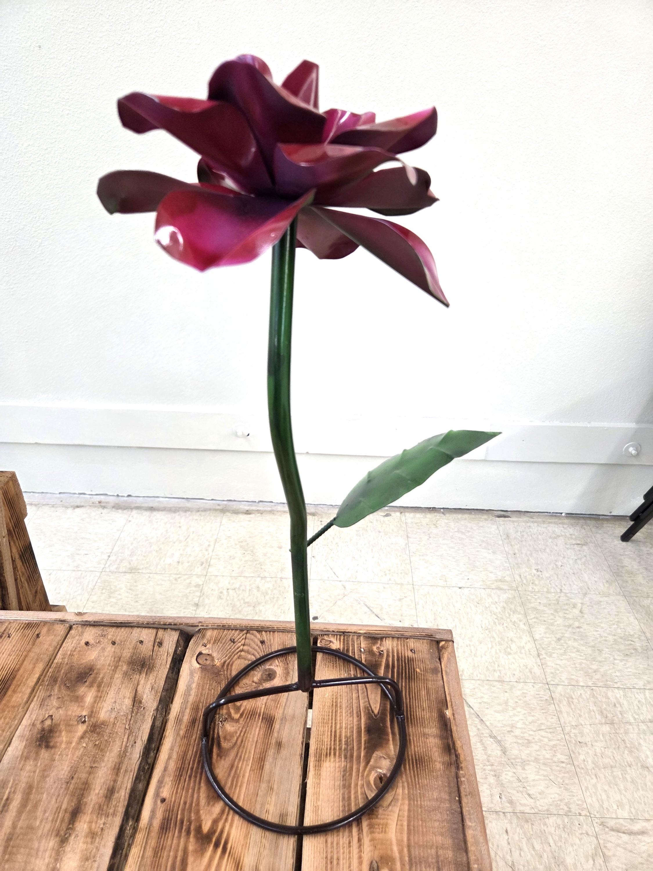 Handmade 22” Metal Flower Yard Art – Vibrant Painted Garden Sculpture – Burgundy Flower Outdoor Decor