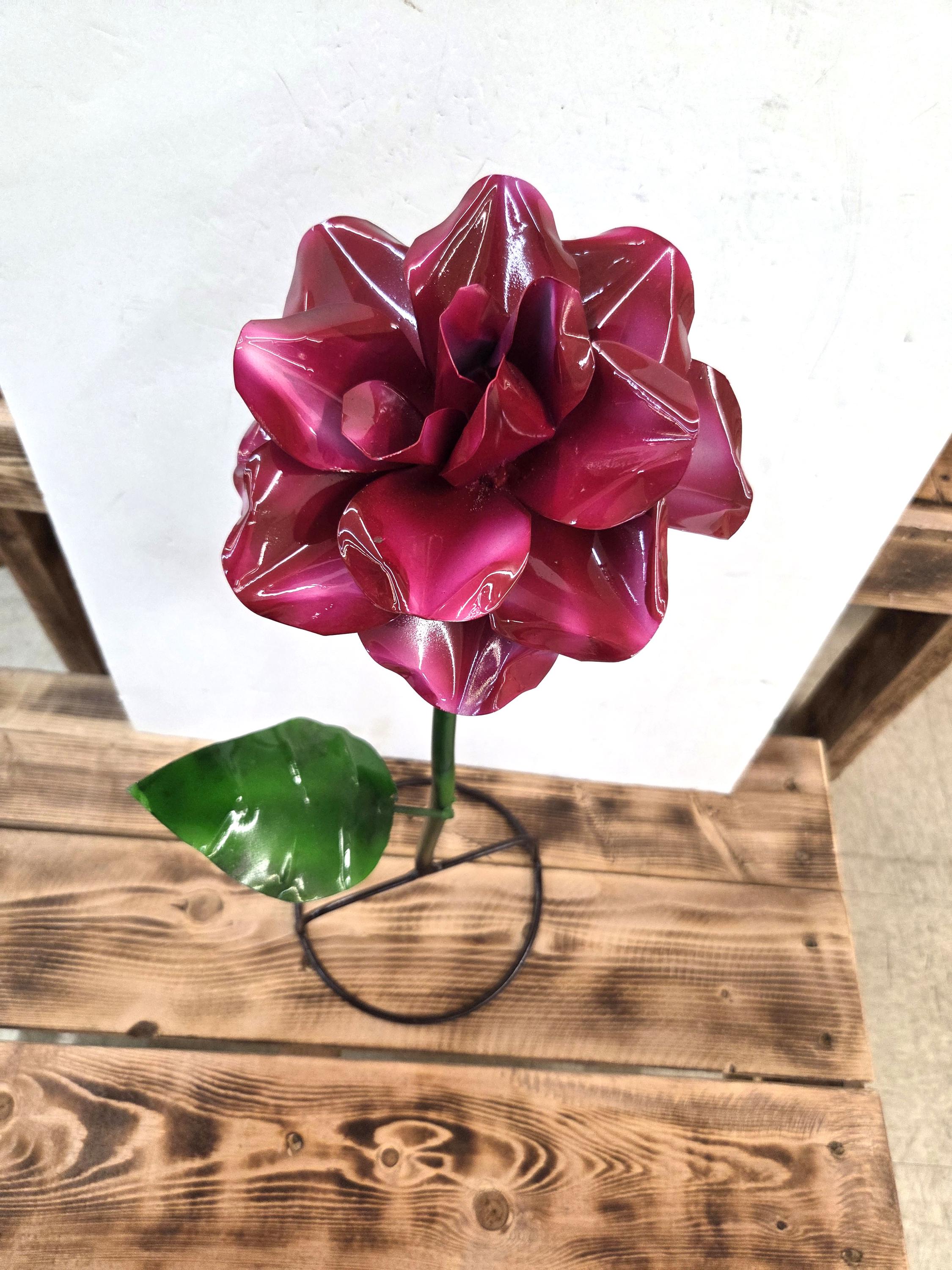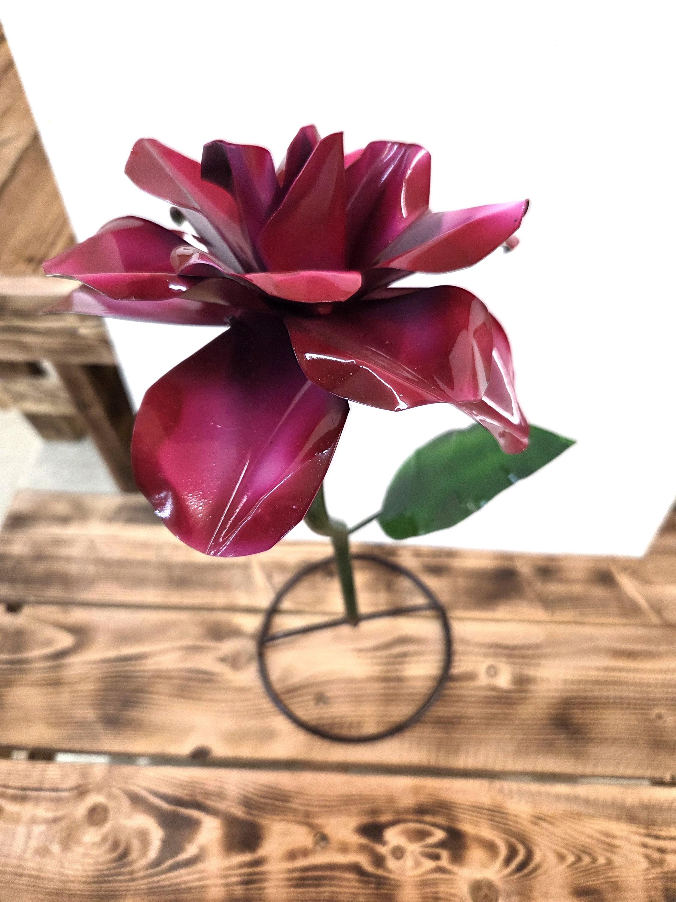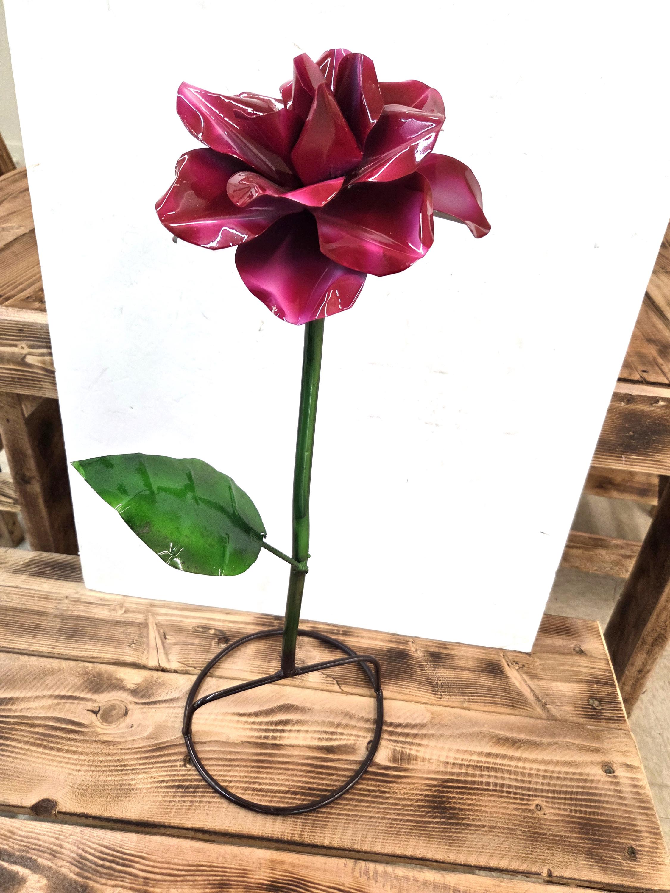 Handmade 22” Metal Flower Yard Art – Vibrant Painted Garden Sculpture – Burgundy Flower Outdoor Decor