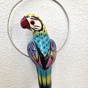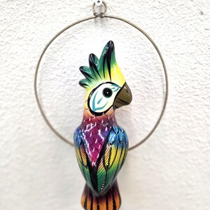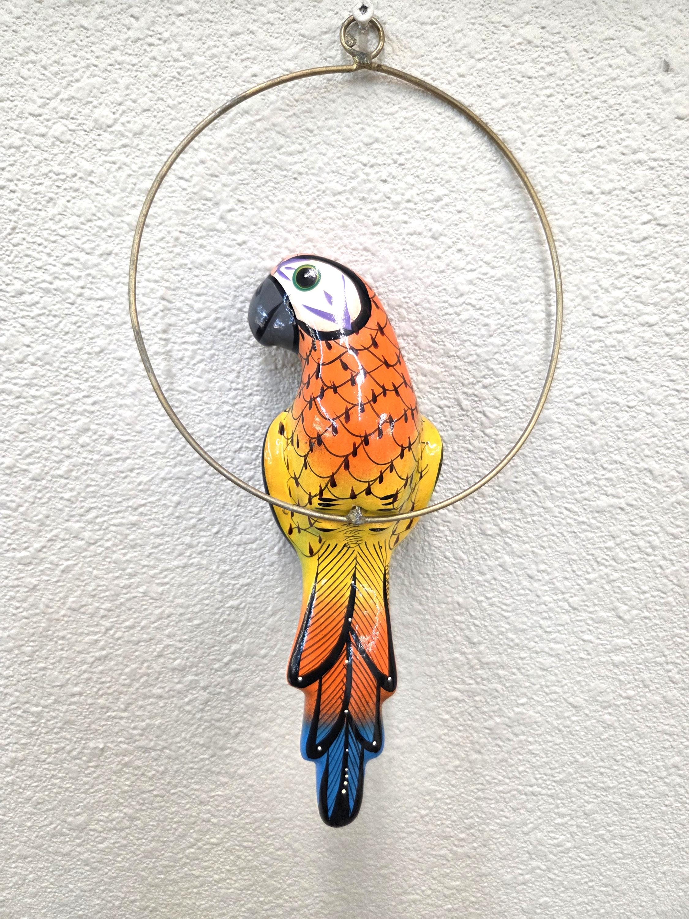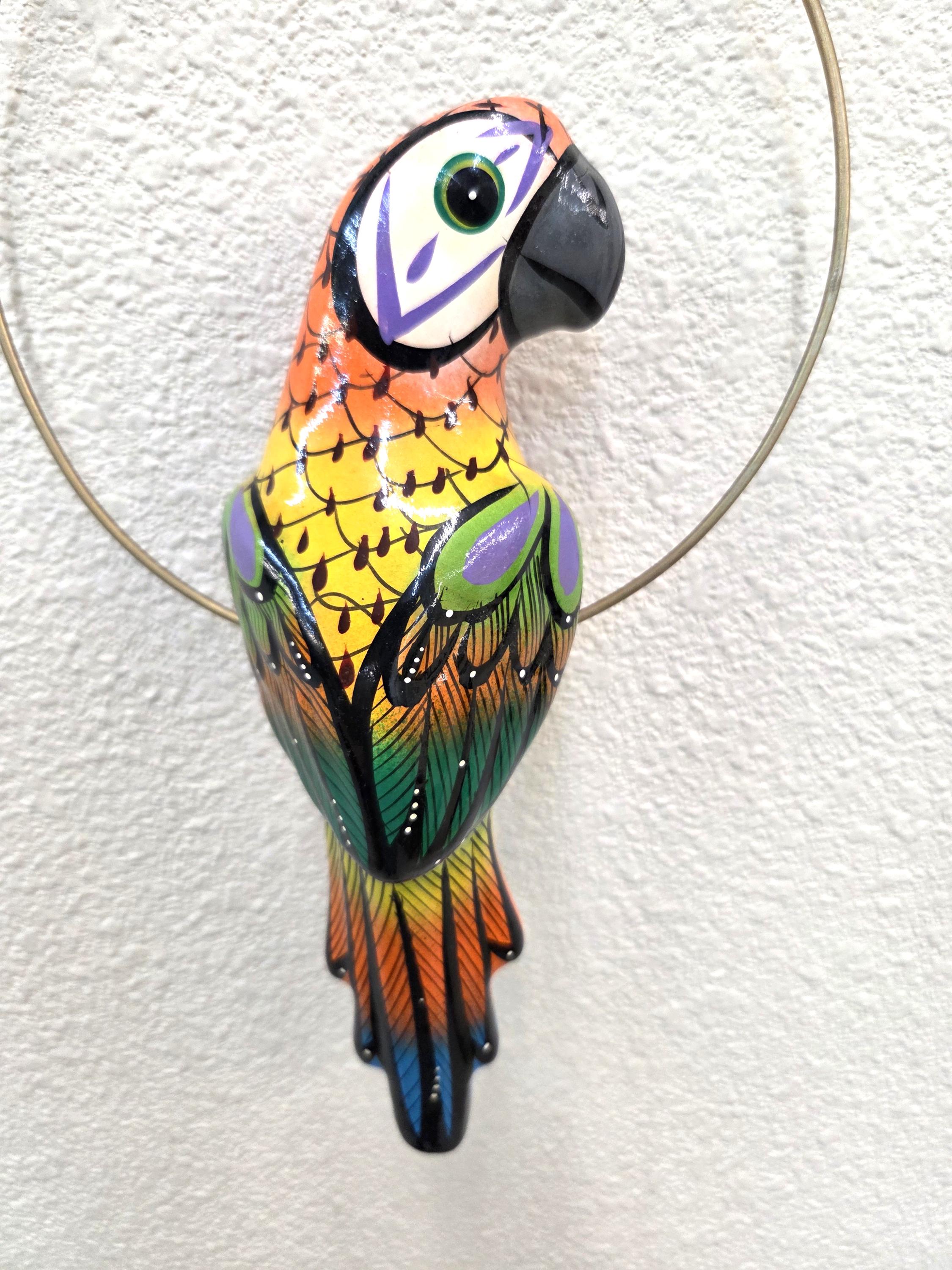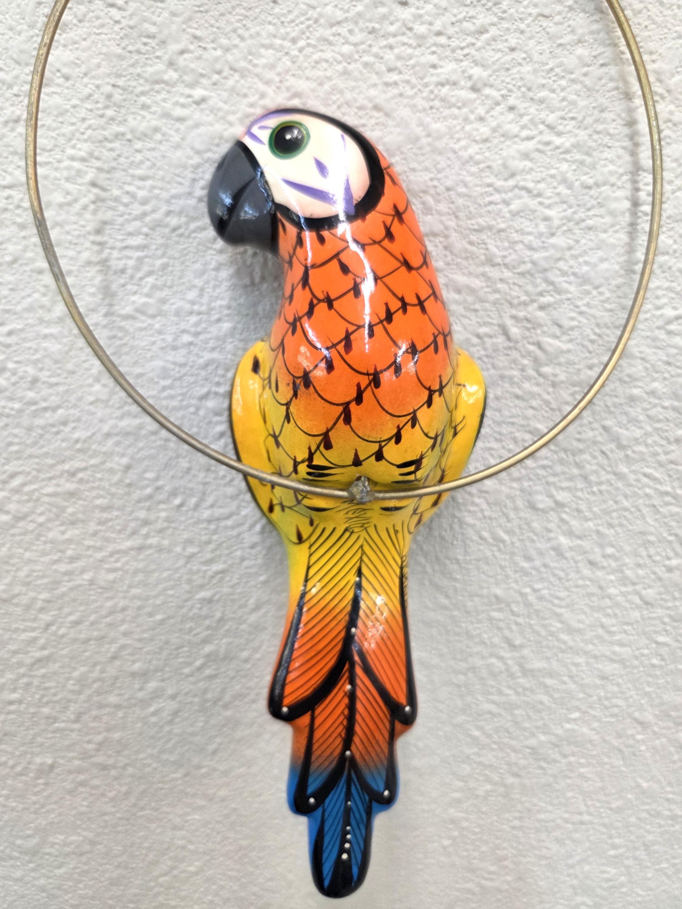 Handmade 9” Hanging Ceramic Parrot on Metal Perch • Hand‑Painted Mexican Folk Art Bird Decor