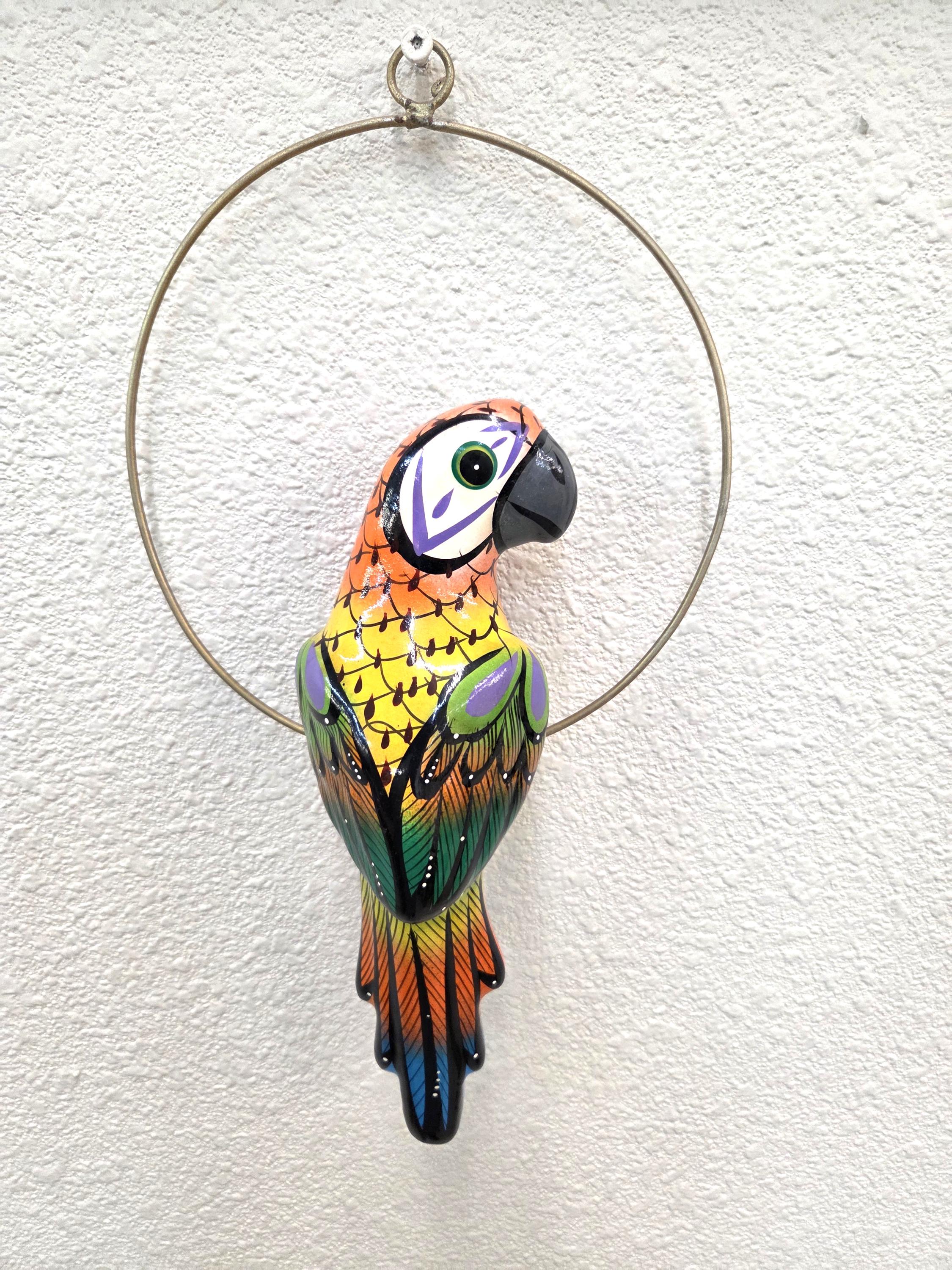 Bring vibrant charm and authentic craftsmanship into your home with this beautiful 9" hanging ceramic parrot, lovingly handmade and hand‑painted by skilled Mexican artisans. Each bird is shaped and painted by hand, giving it unique personality, rich color, and the lively folk‑art style Mexico is known for. The parrot sits gracefully on a sturdy metal perch, ready to brighten any indoor or outdoor space—perfect for patios, sunrooms, kitchens, or tropical‑themed décor. Whether you're a collector of artisan pottery or simply love colorful statement pieces, this hanging parrot adds warmth, culture, and artistry to any setting. A wonderful gift for bird lovers, décor enthusiasts, or anyone who appreciates true handcrafted beauty.