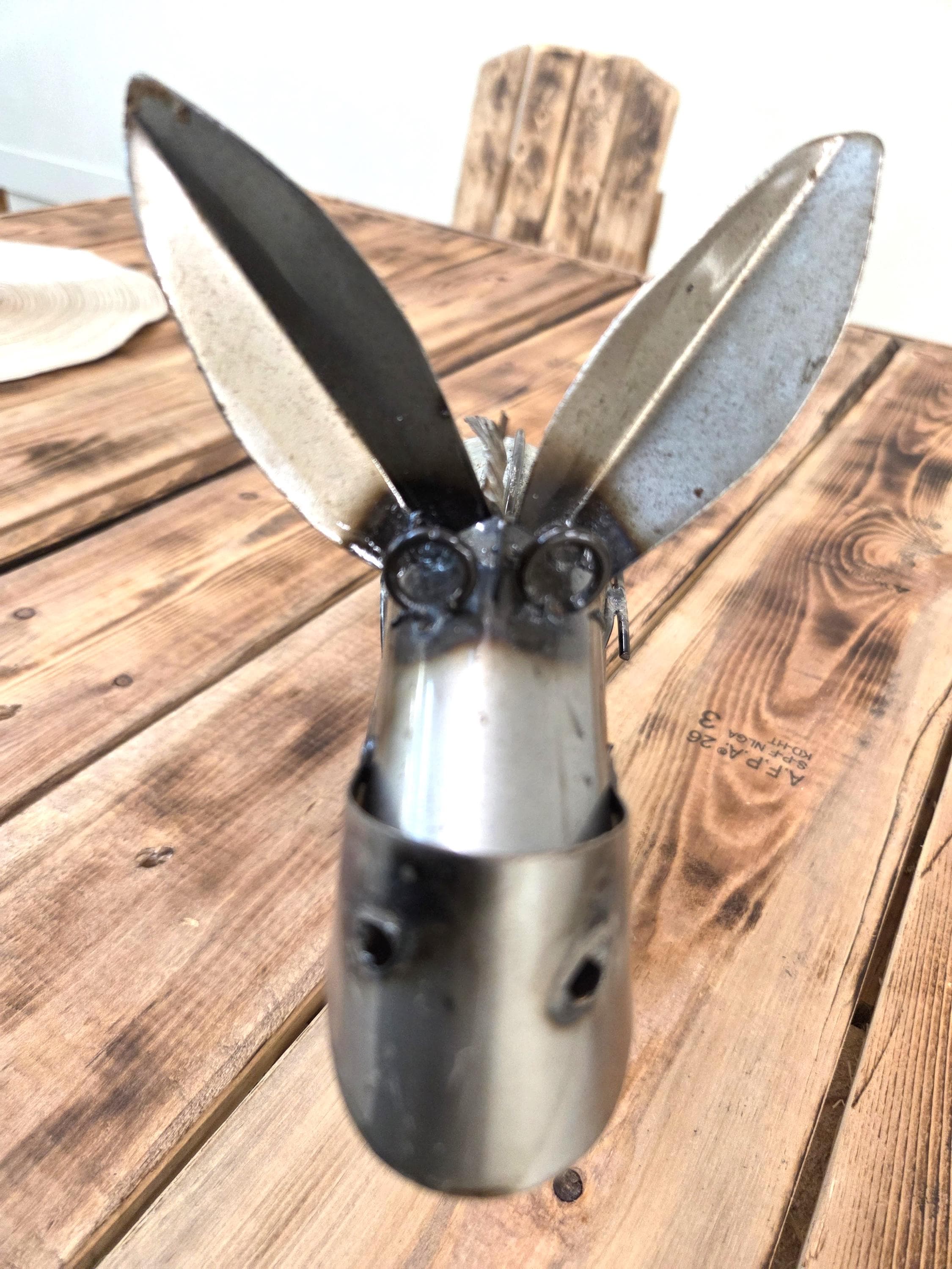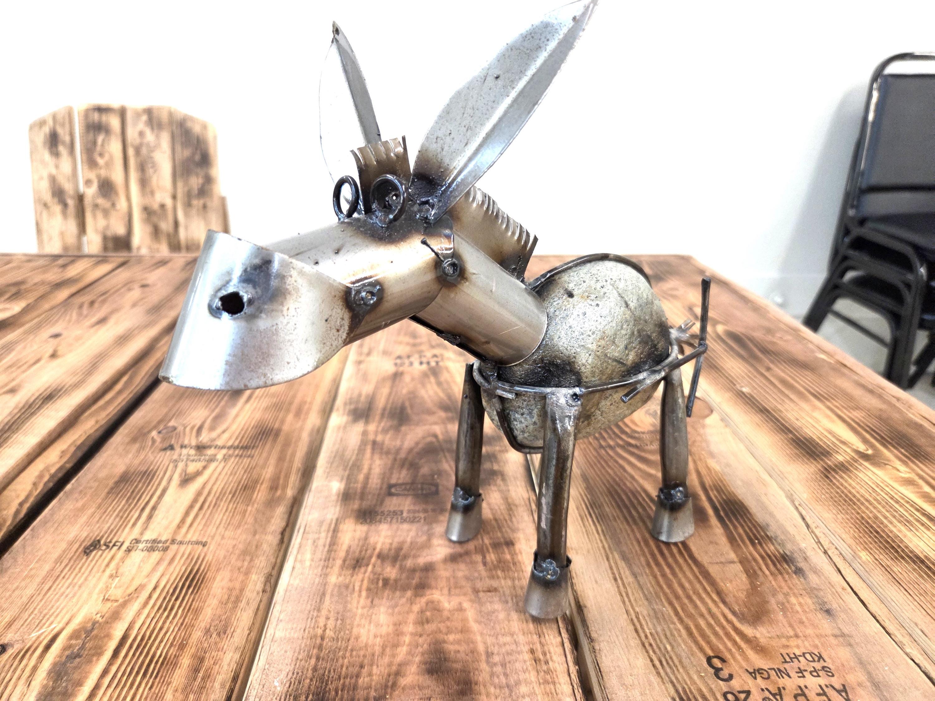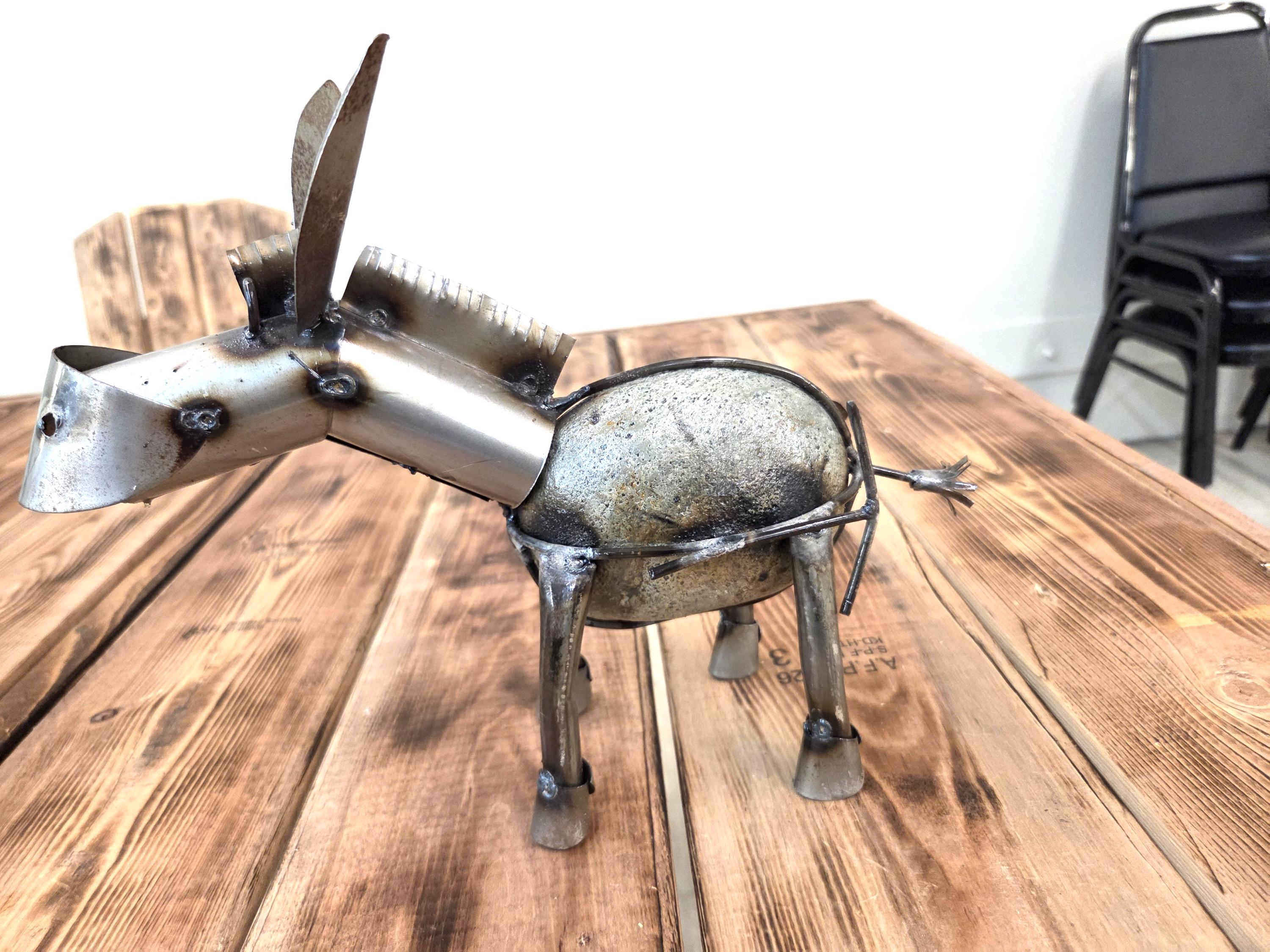 Bring a touch of rugged Western charm to your home or garden with this handmade 12" rustic metal donkey sculpture, crafted to resemble a hardworking miner’s burro carrying its trusty shovel. Every piece is individually cut, shaped, and welded, giving it a wonderfully weathered personality and a sense of motion, as if it just stepped out of an old mining trail. Its sturdy metal construction makes it perfect for outdoor yard art, porch décor, or as a unique accent inside a cabin or farmhouse‑style space. This little burro adds a story, a smile, and a dash of frontier spirit wherever it stands.