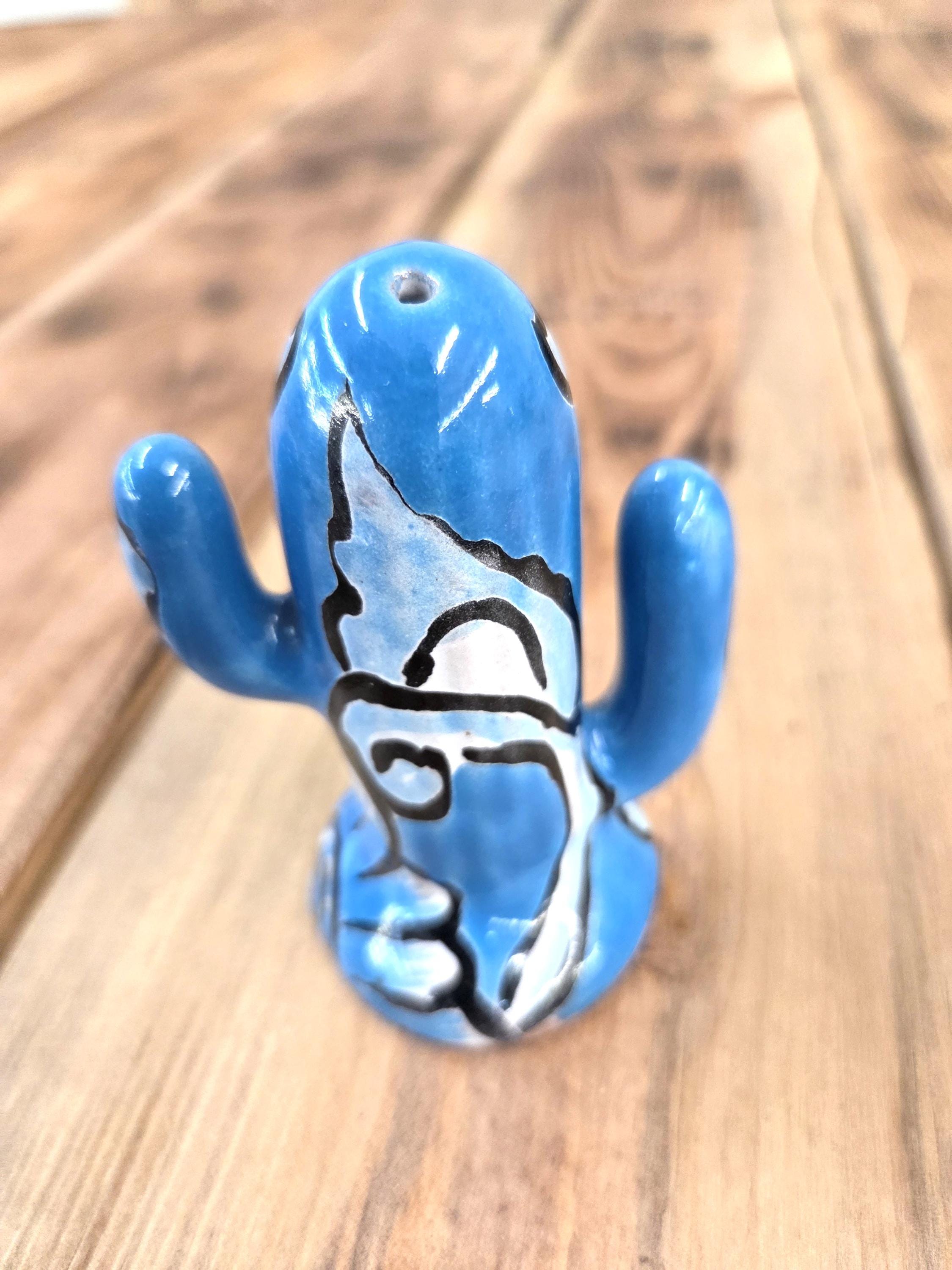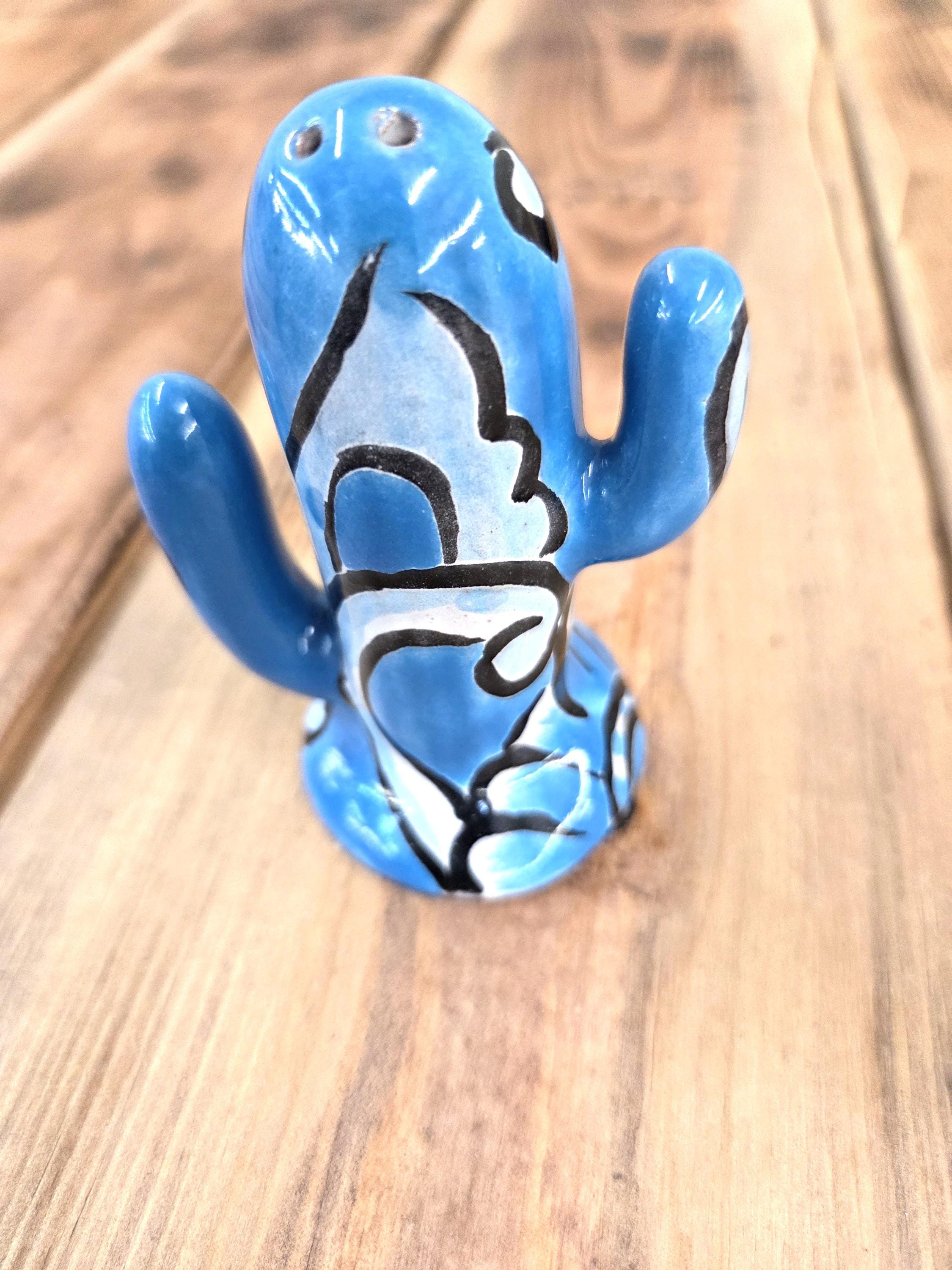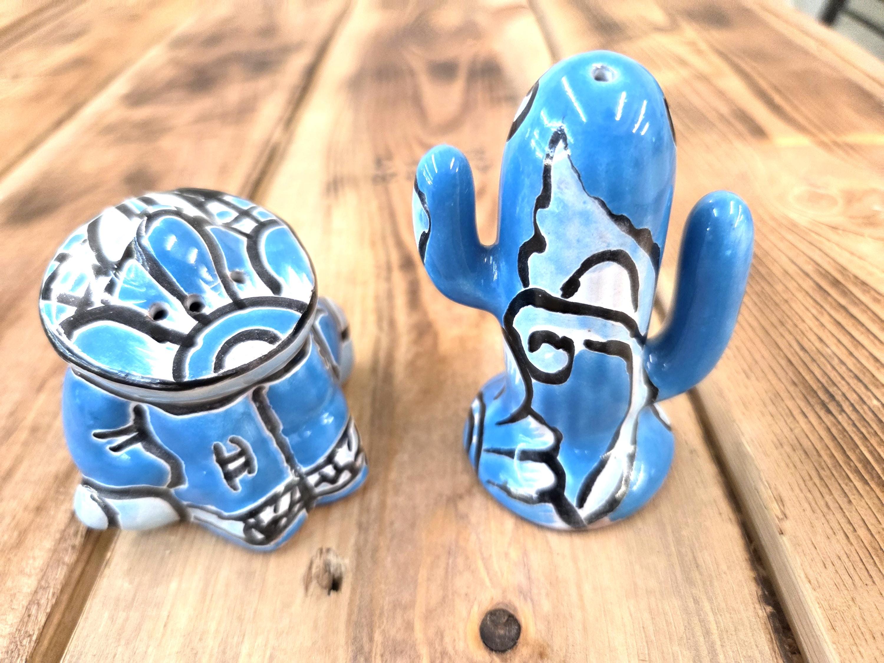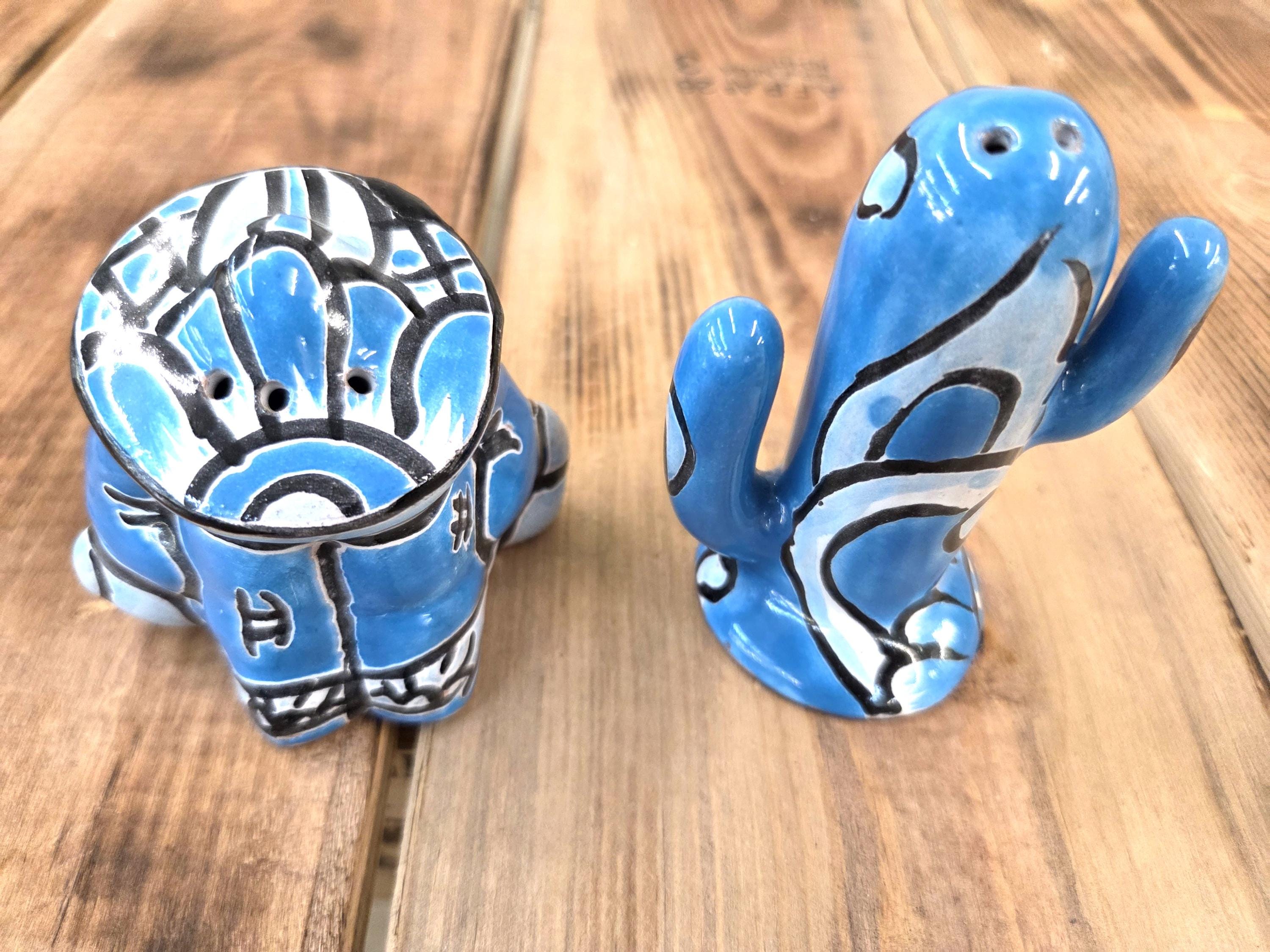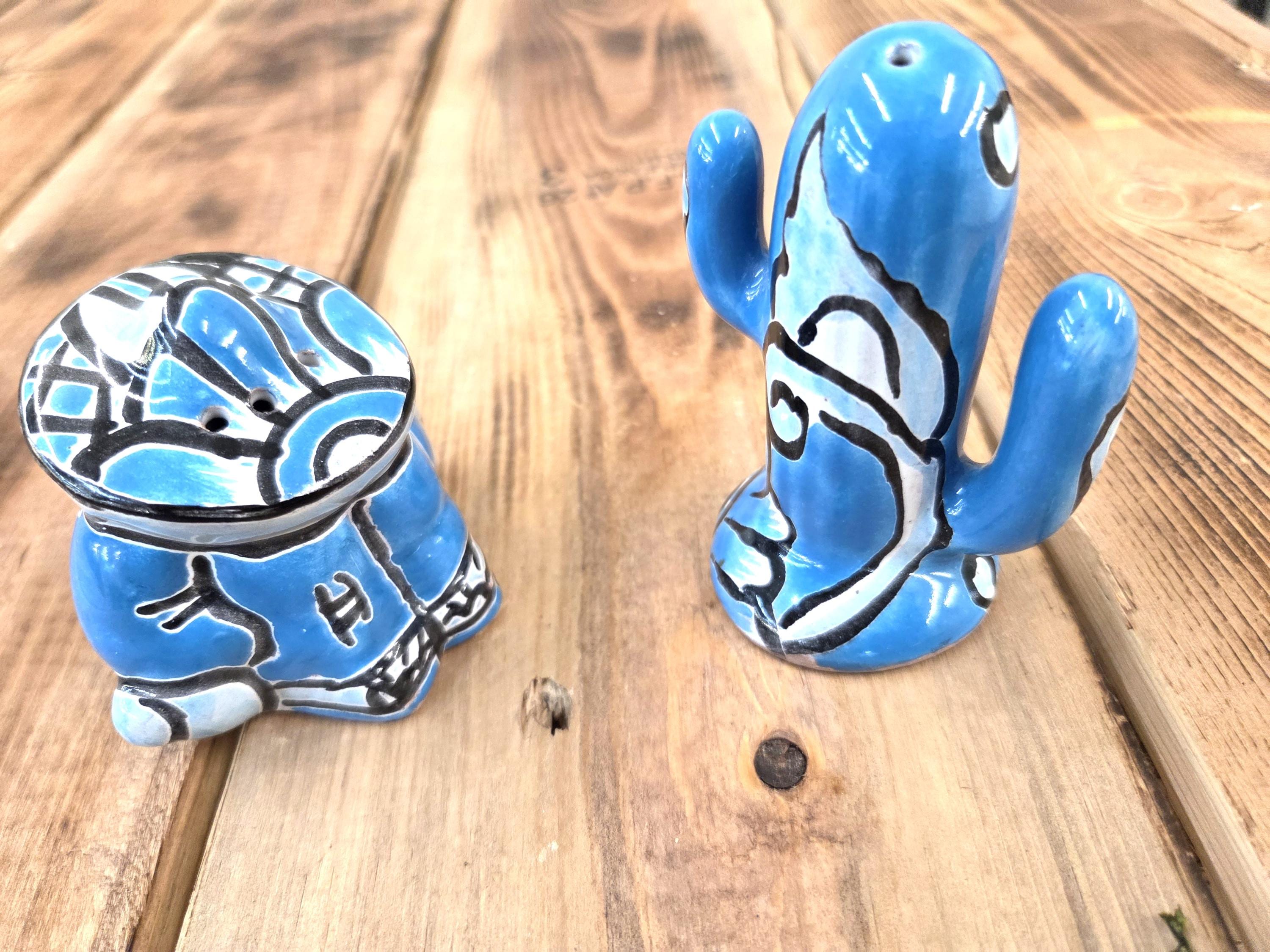 Handmade Talavera Sleeping Poncho & Cactus Salt Pepper Shaker Set – Vibrant Mexican Folk Art Kitchen Decor