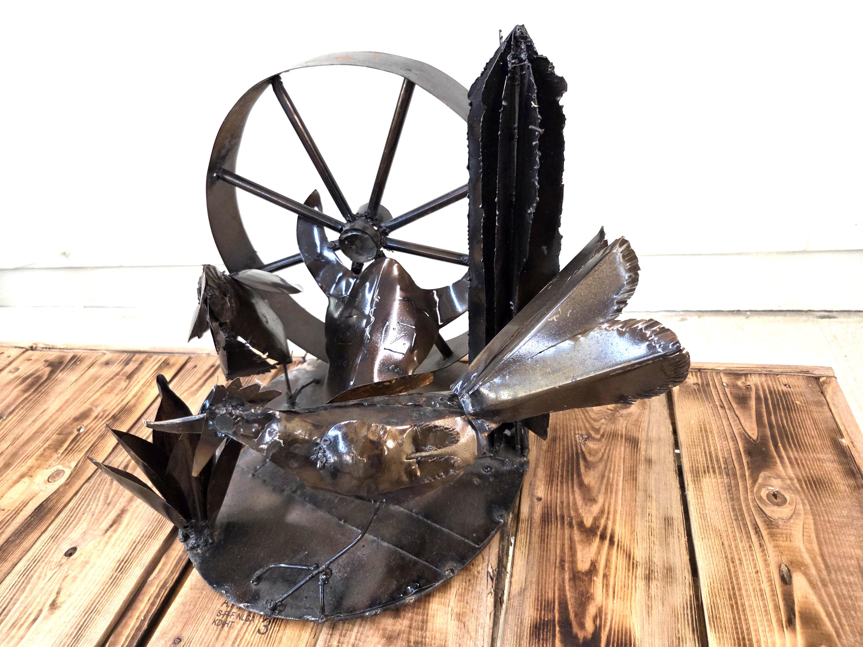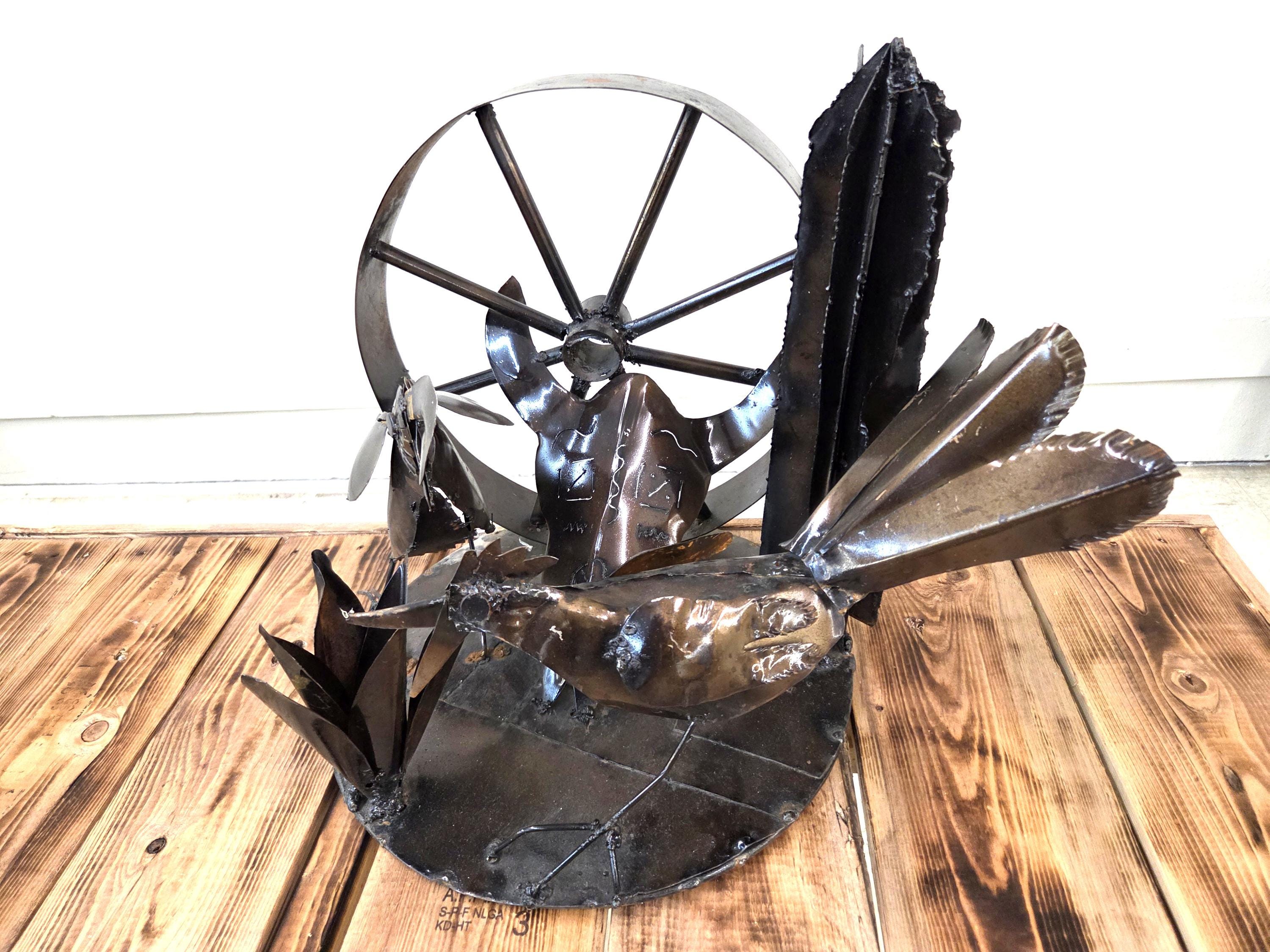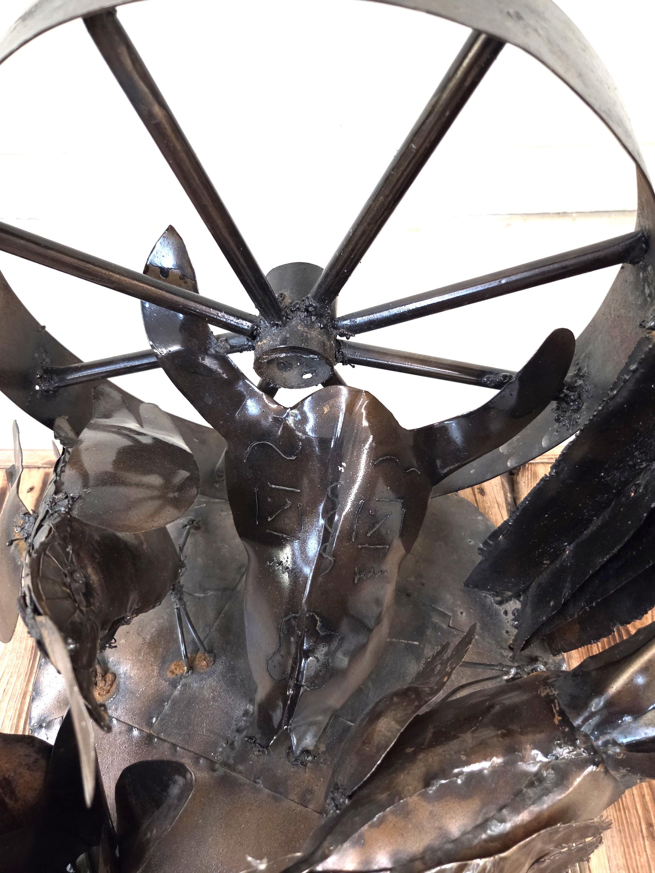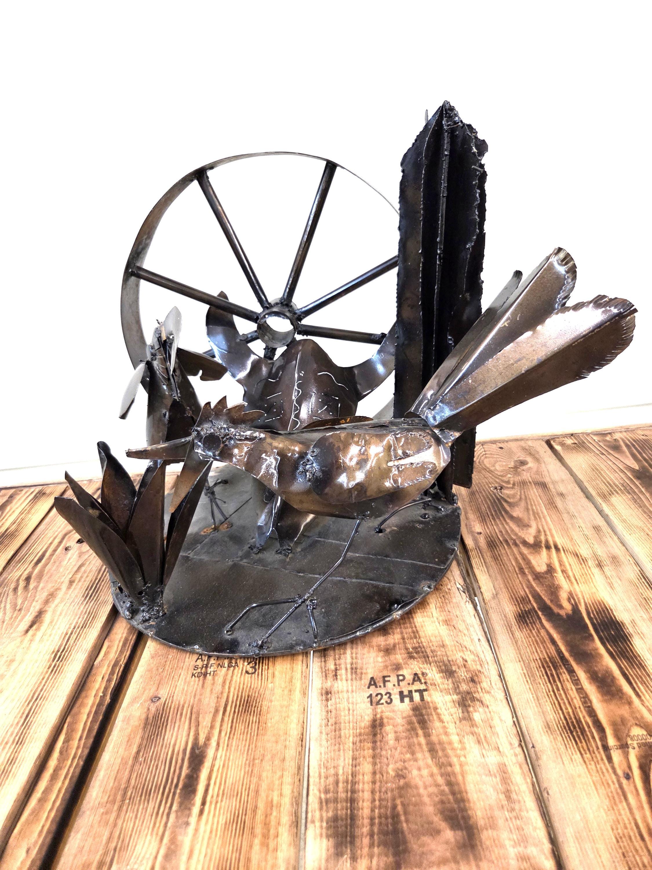 Bring the spirit of the Southwest into your home with this handcrafted rustic metal tabletop art piece, featuring a striking steer skull surrounded by a lively roadrunner, agave, wagon wheel, and saguaro cactus. Each element is cut, shaped, and finished by hand, giving the sculpture its own unique character and a beautifully weathered desert charm. Whether displayed on a shelf, mantel, or entryway table, this piece adds a bold touch of Western artistry and makes a standout gift for anyone who loves desert landscapes, wildlife, or handcrafted metal decor. Why ever just be ordinary? Would look great in your home, office, or place of business! One of a kind. Roughly 17.5" wide, 15.5" tall, & 13.5" deep irregular.
