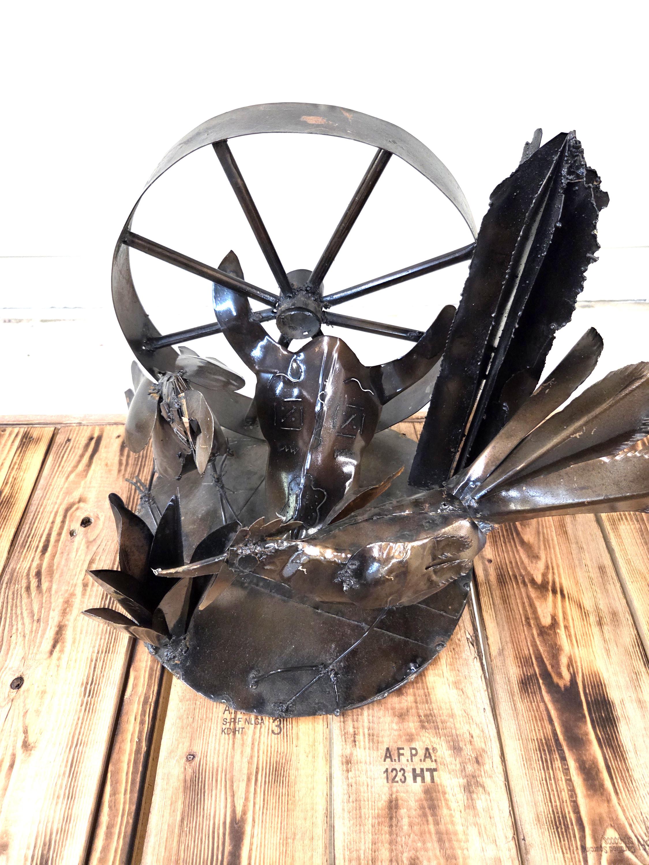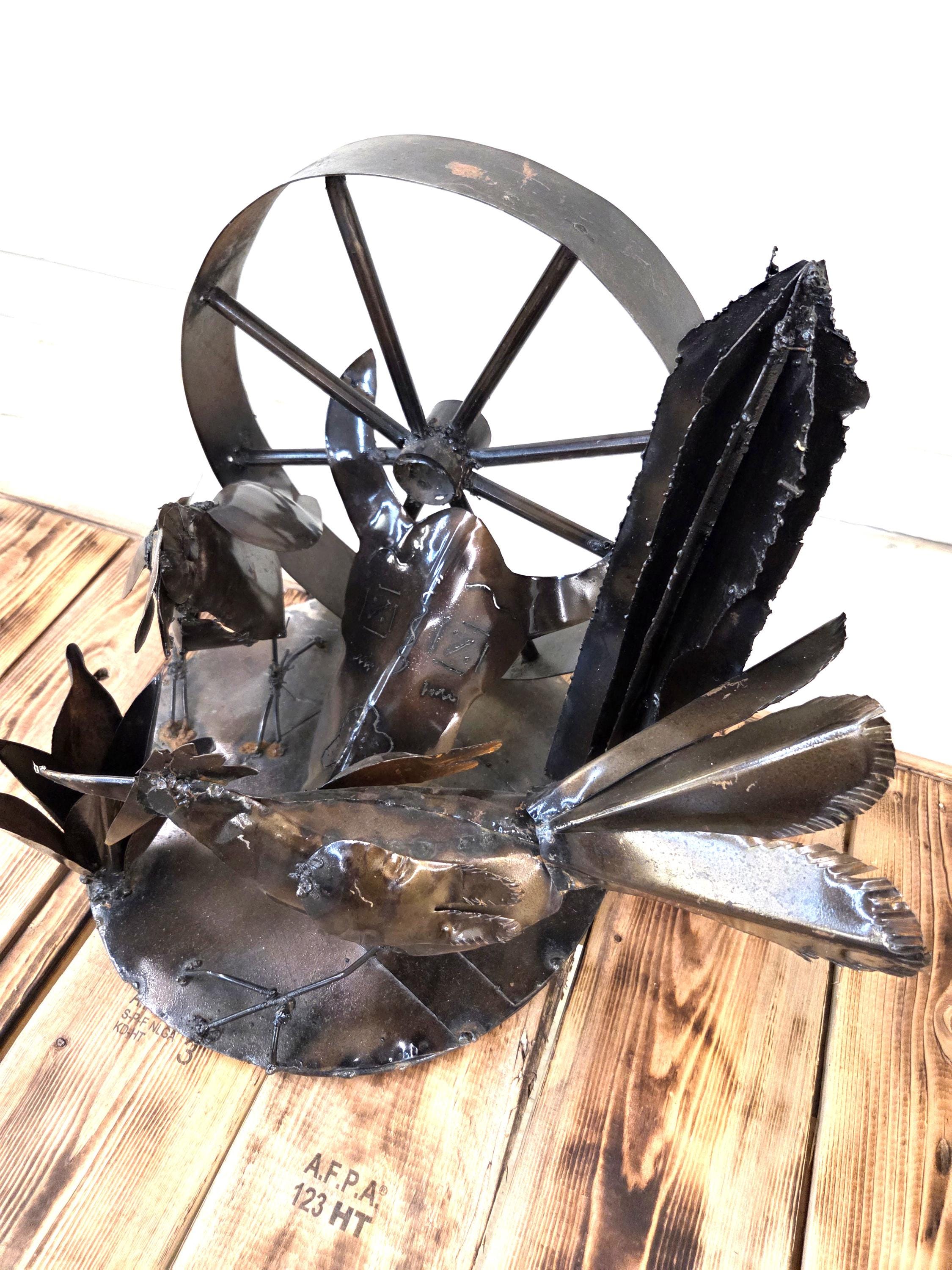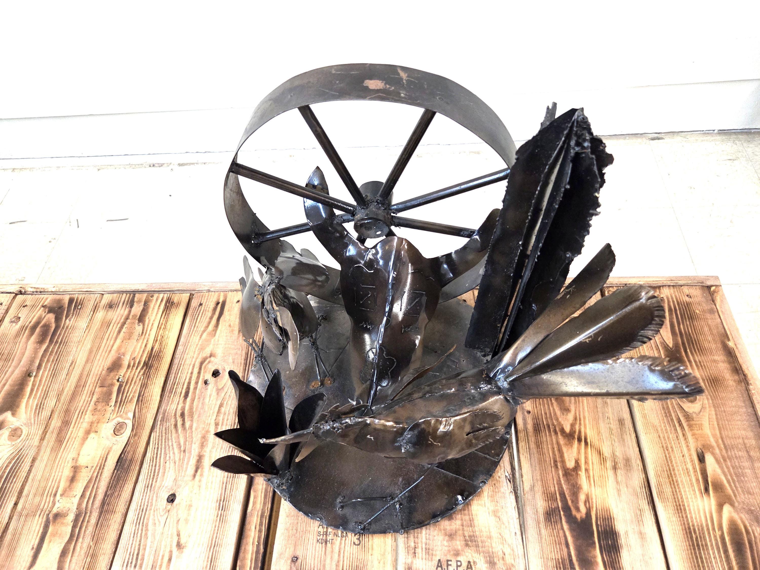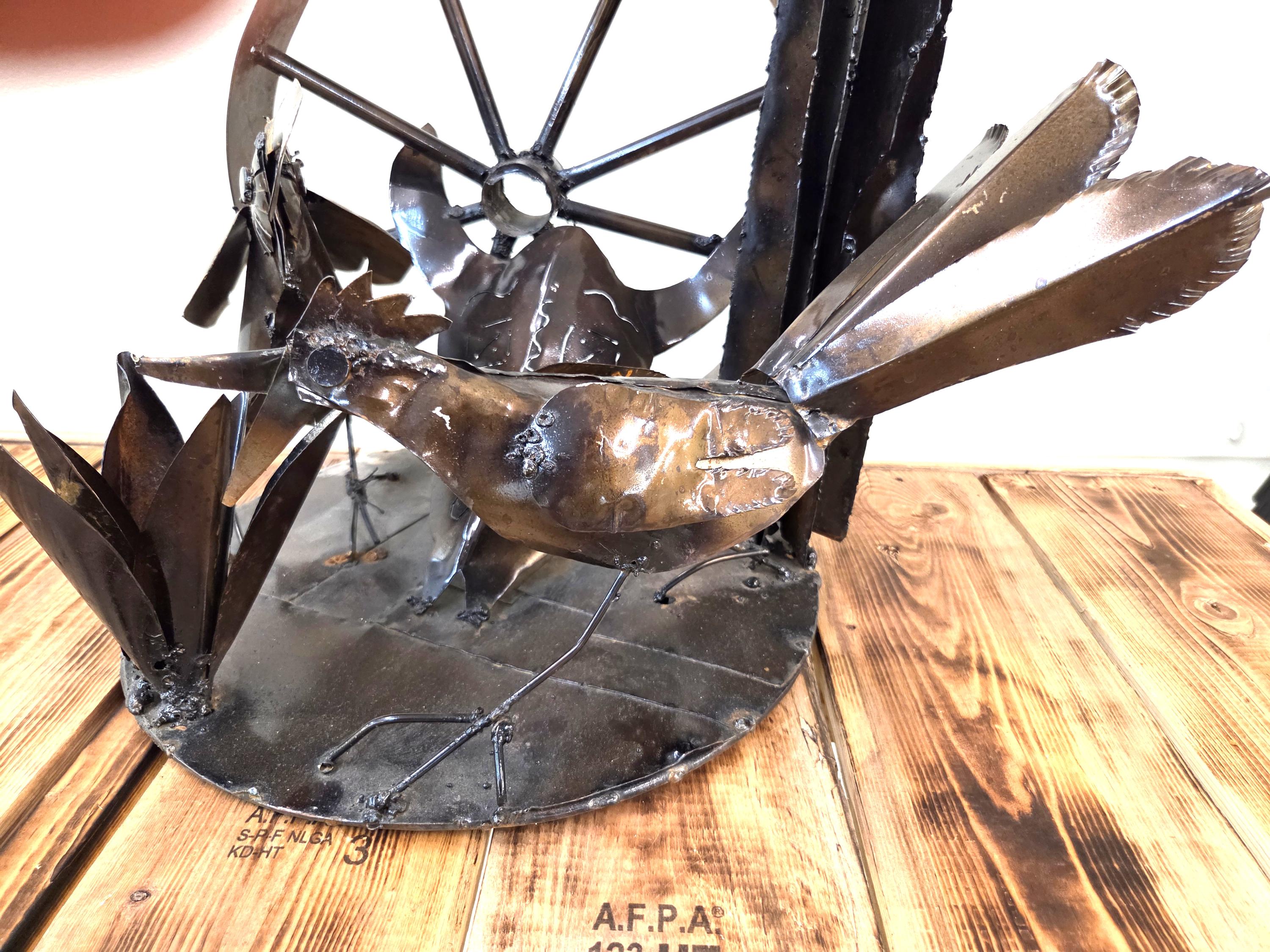 Bring the spirit of the Southwest into your home with this handcrafted rustic metal tabletop art piece, featuring a striking steer skull surrounded by a lively roadrunner, agave, wagon wheel, and saguaro cactus. Each element is cut, shaped, and finished by hand, giving the sculpture its own unique character and a beautifully weathered desert charm. Whether displayed on a shelf, mantel, or entryway table, this piece adds a bold touch of Western artistry and makes a standout gift for anyone who loves desert landscapes, wildlife, or handcrafted metal decor. Why ever just be ordinary? Would look great in your home, office, or place of business! One of a kind. Roughly 17.5" wide, 15.5" tall, & 13.5" deep irregular.