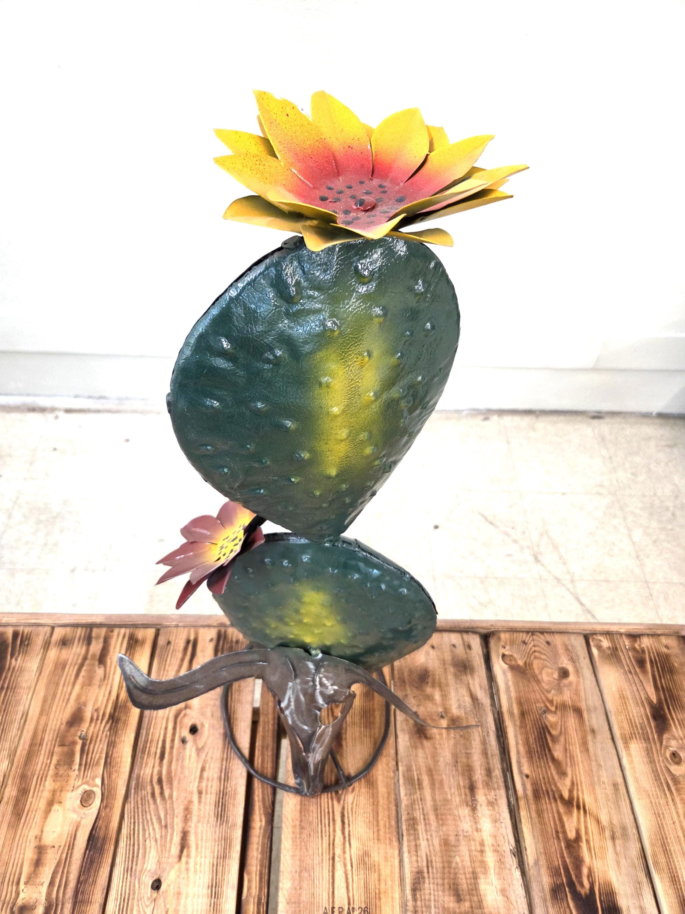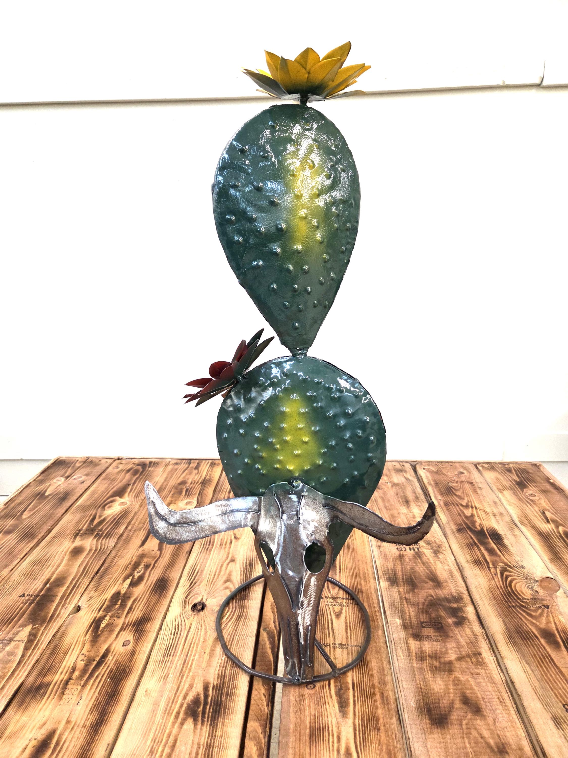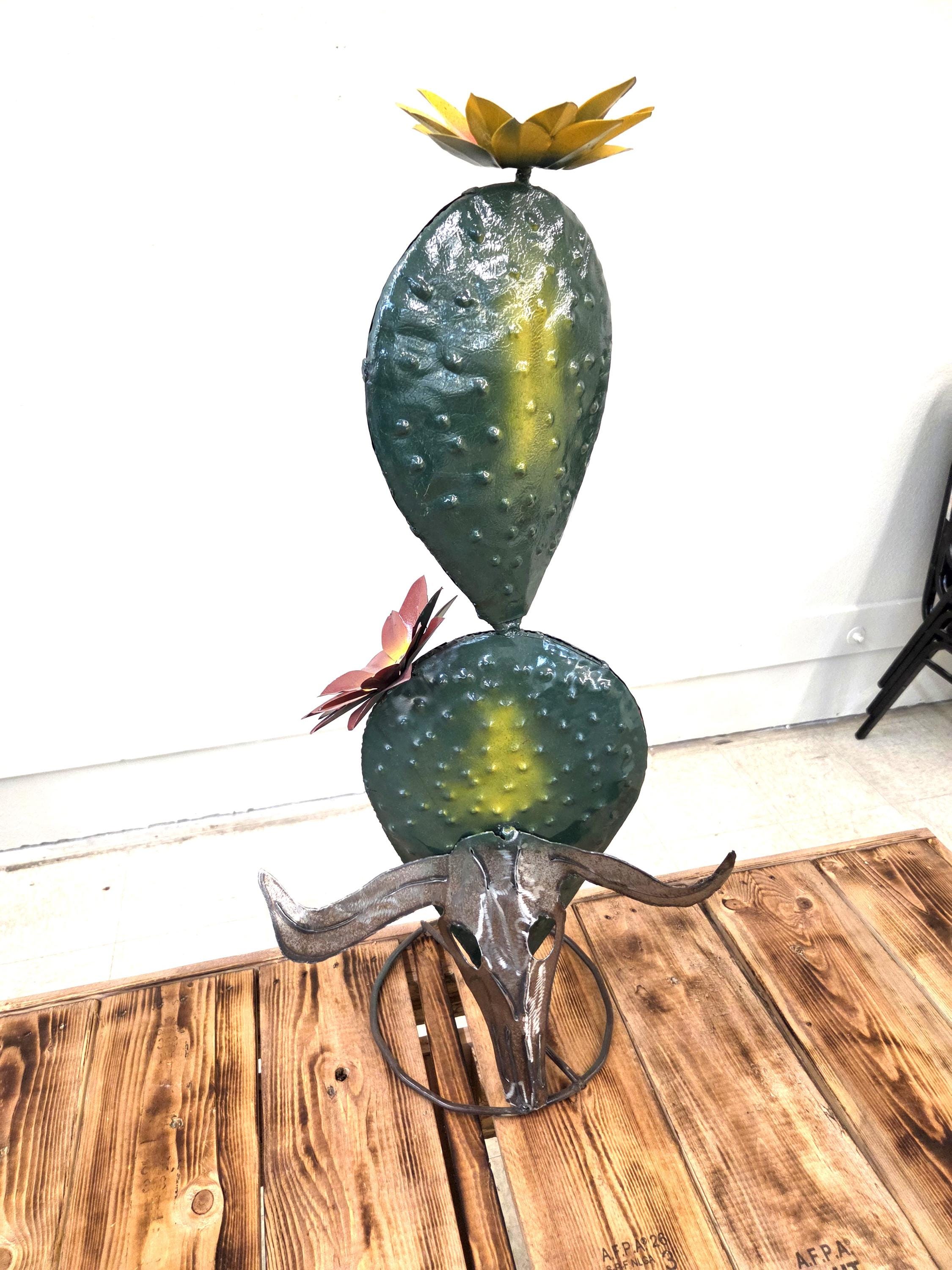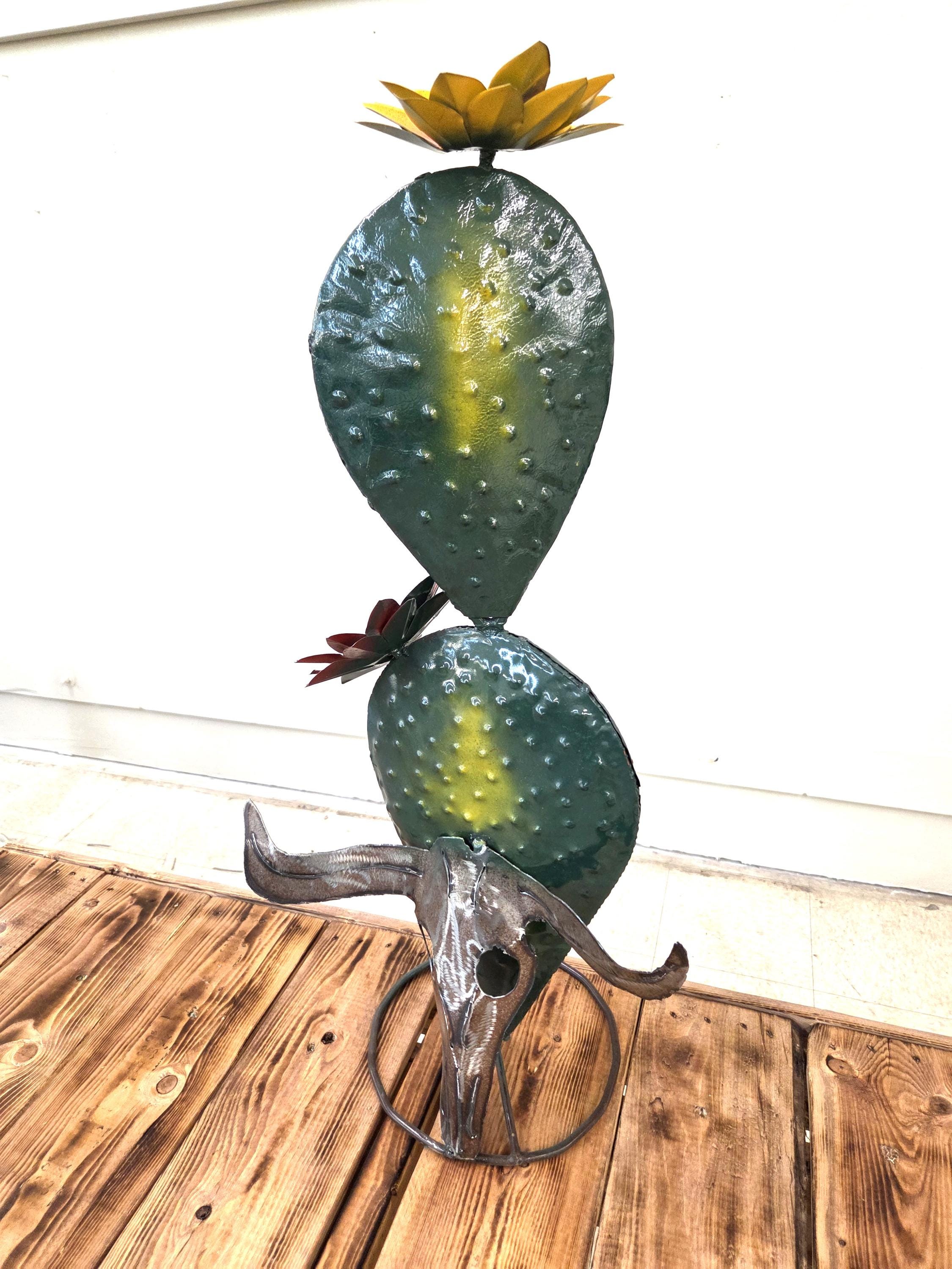 Bring bold Southwestern flair to your outdoor décor with this striking 28" Large Prickly Pear Metal Cactus, complete with a detailed steer skull accent at its base. Inspired by the iconic nopal (Spanish for prickly pear), this handcrafted yard sculpture features beautifully textured metalwork that adds depth, character, and a rugged desert vibe to any garden, patio, or entryway. Its impressive size and artisan detailing make it a standout statement piece for anyone who loves Western décor, cactus art, or unique handmade yard accents. Durable, eye‑catching, and full of personality, this metal cactus brings a touch of desert charm to any space.