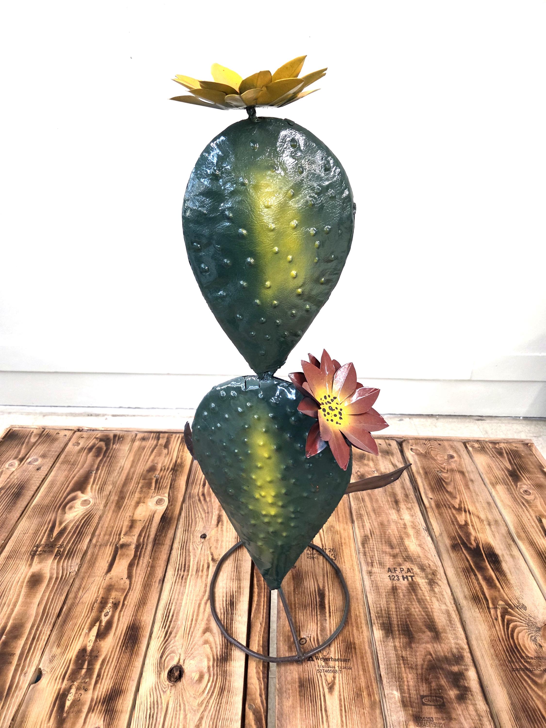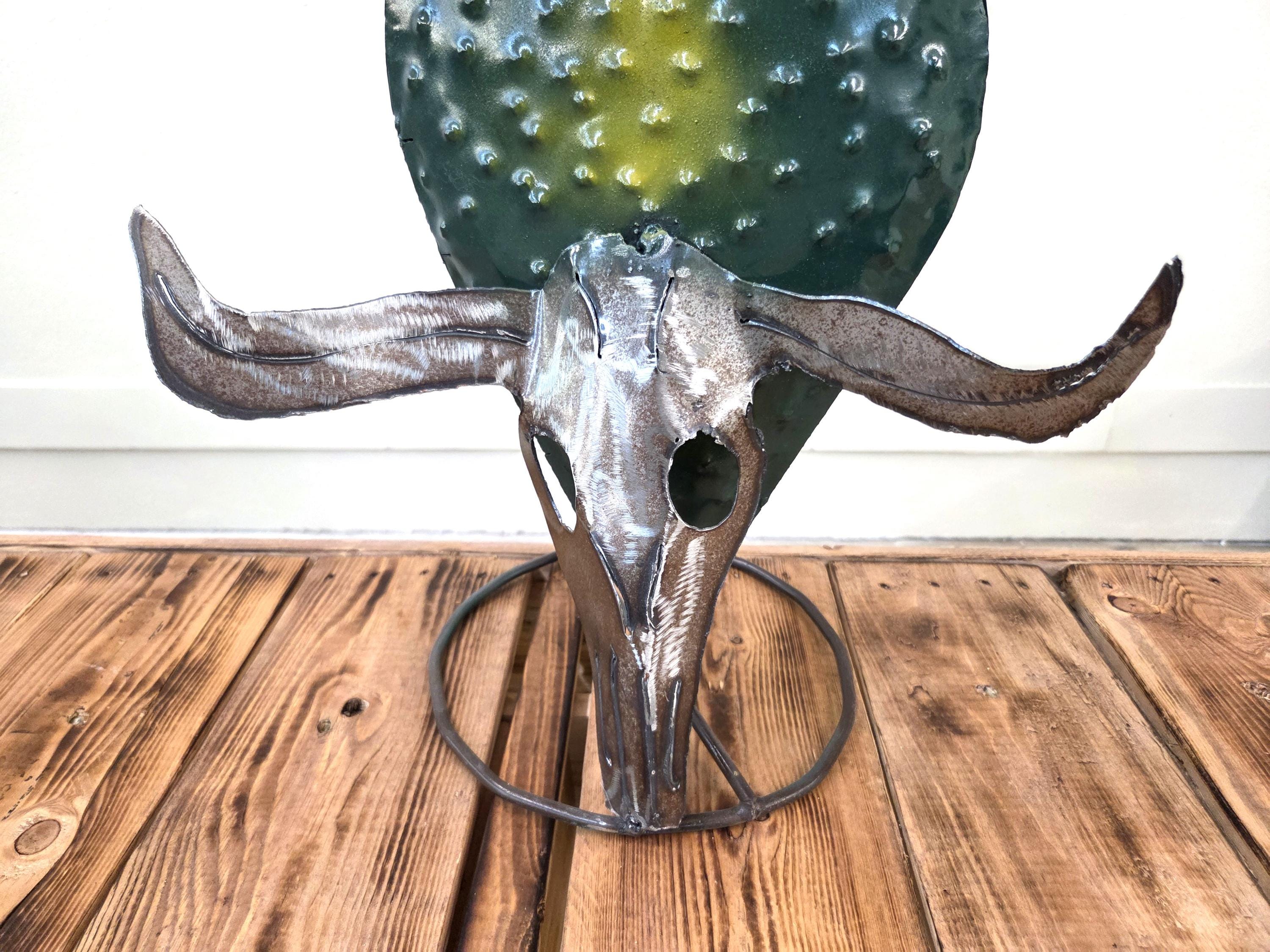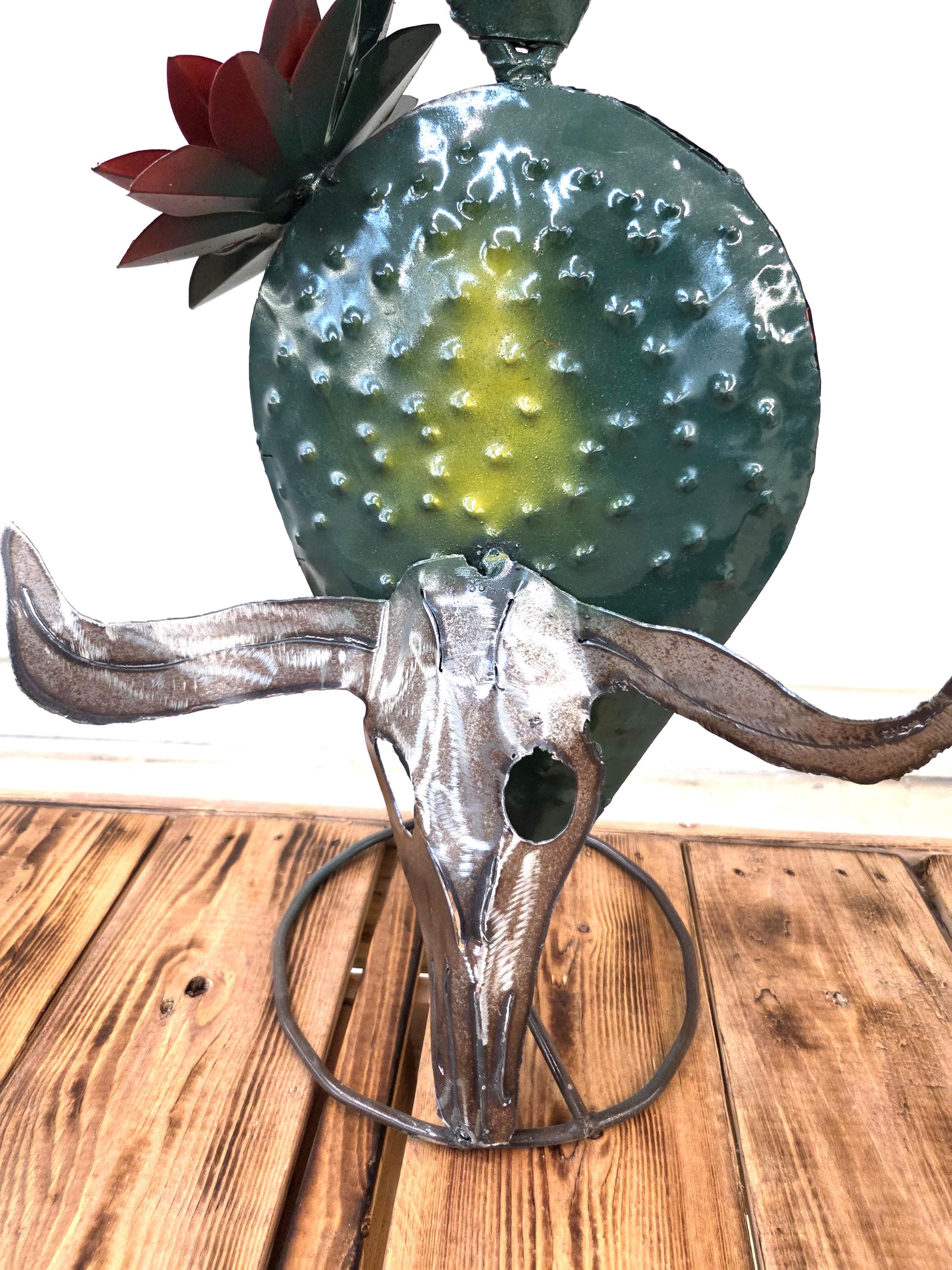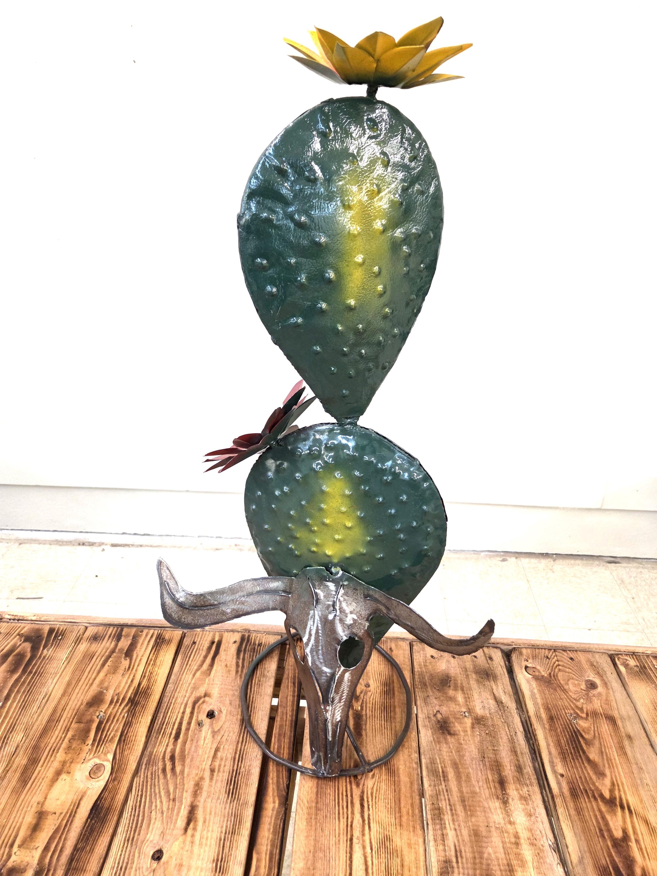 Bring bold Southwestern flair to your outdoor décor with this striking 28" Large Prickly Pear Metal Cactus, complete with a detailed steer skull accent at its base. Inspired by the iconic nopal (Spanish for prickly pear), this handcrafted yard sculpture features beautifully textured metalwork that adds depth, character, and a rugged desert vibe to any garden, patio, or entryway. Its impressive size and artisan detailing make it a standout statement piece for anyone who loves Western décor, cactus art, or unique handmade yard accents. Durable, eye‑catching, and full of personality, this metal cactus brings a touch of desert charm to any space.