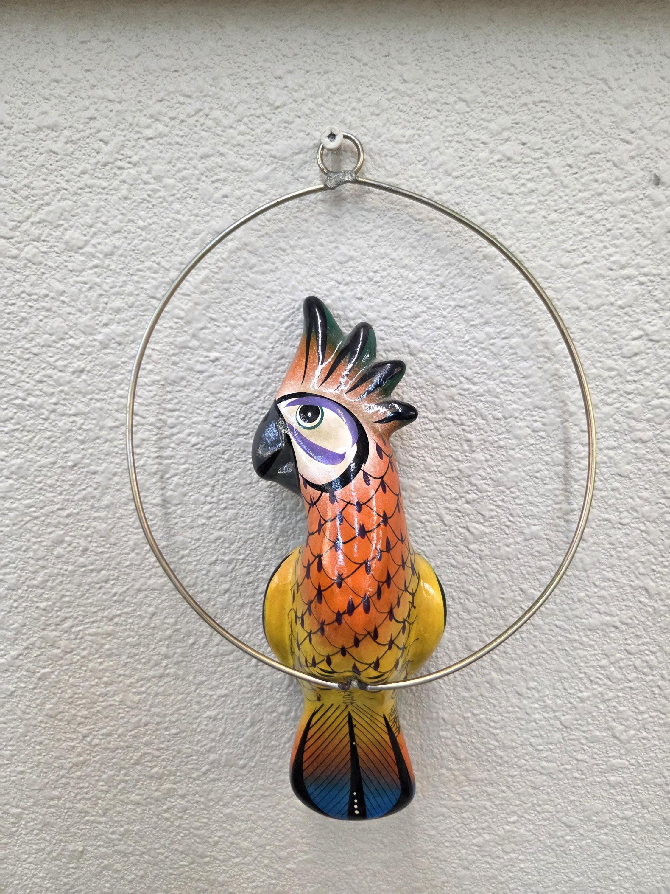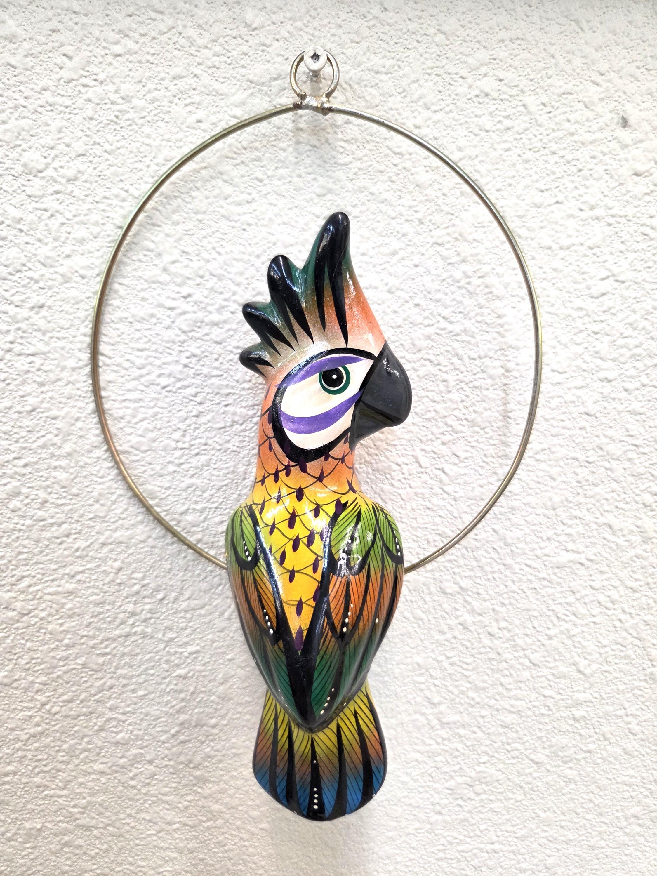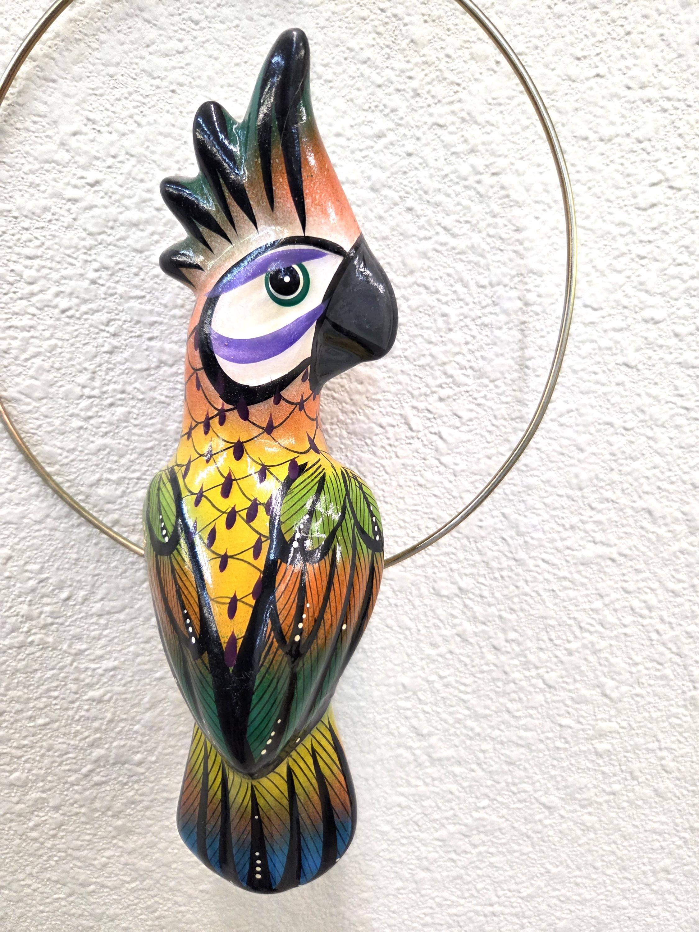 Bring a touch of vibrant Mexican folk art into your home with this beautiful 8½‑inch hanging parrot, lovingly handcrafted and hand‑painted by skilled artisans in Mexico. Perched on a sturdy metal ring, each parrot features bold colors, expressive details, and unique brushwork that make every piece one‑of‑a‑kind. Its cheerful presence adds personality to any space—perfect for brightening up patios, kitchens, sunrooms, or gallery walls. Whether you’re a collector of artisan crafts or simply love colorful décor, this charming hanging parrot brings artistry and joy wherever it’s displayed.