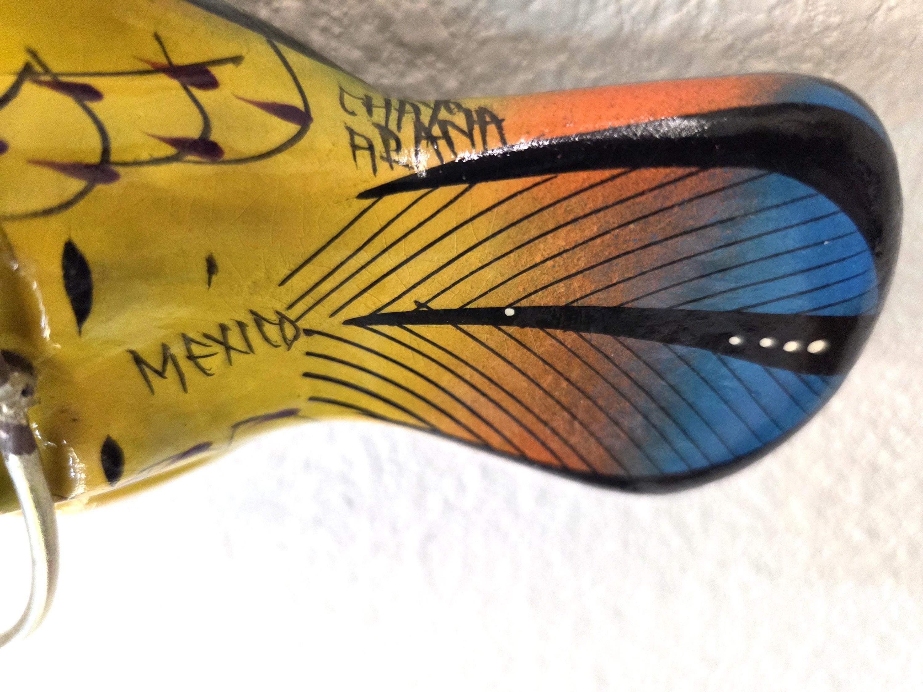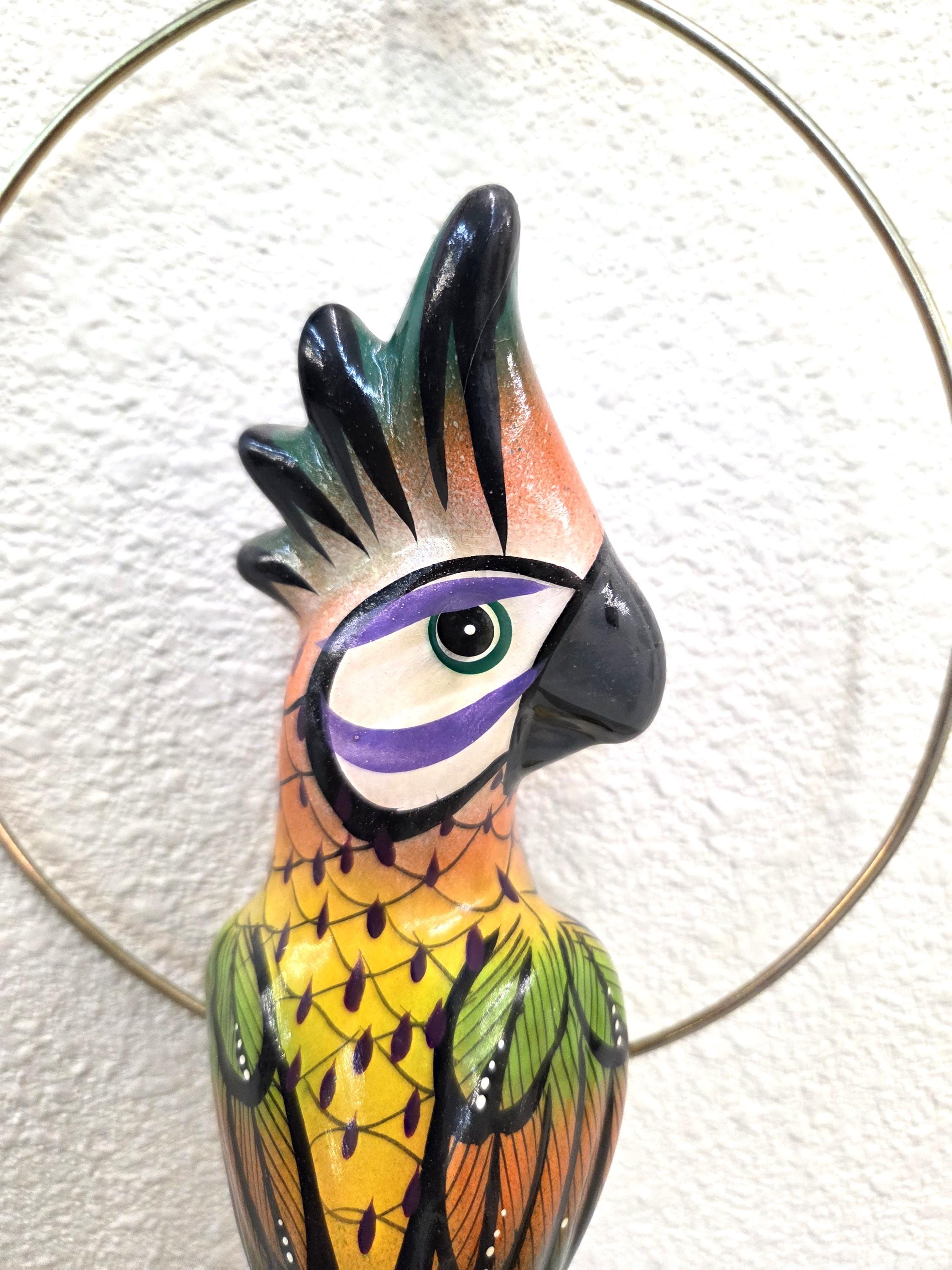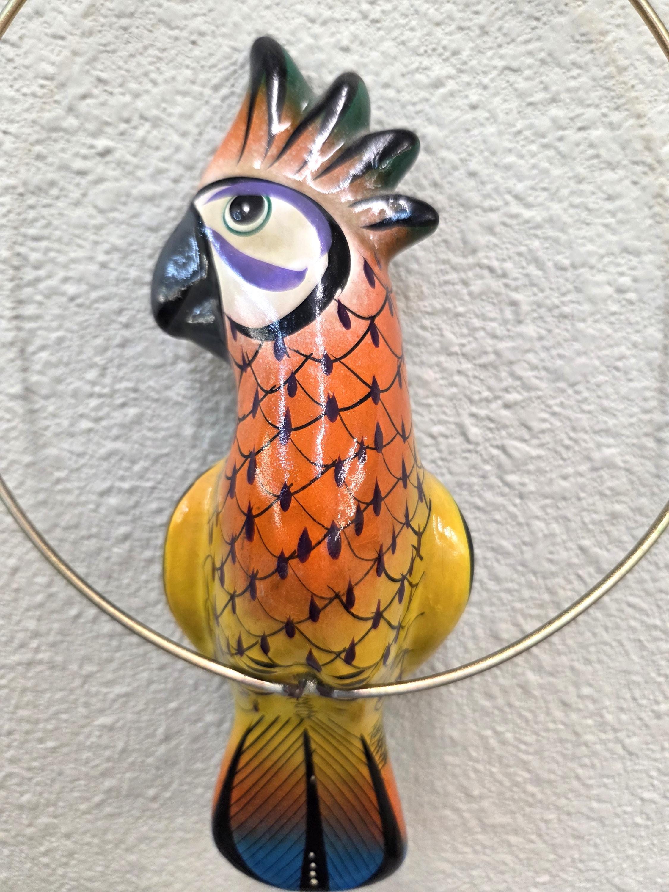 Bring a touch of vibrant Mexican folk art into your home with this beautiful 8½‑inch hanging parrot, lovingly handcrafted and hand‑painted by skilled artisans in Mexico. Perched on a sturdy metal ring, each parrot features bold colors, expressive details, and unique brushwork that make every piece one‑of‑a‑kind. Its cheerful presence adds personality to any space—perfect for brightening up patios, kitchens, sunrooms, or gallery walls. Whether you’re a collector of artisan crafts or simply love colorful décor, this charming hanging parrot brings artistry and joy wherever it’s displayed.