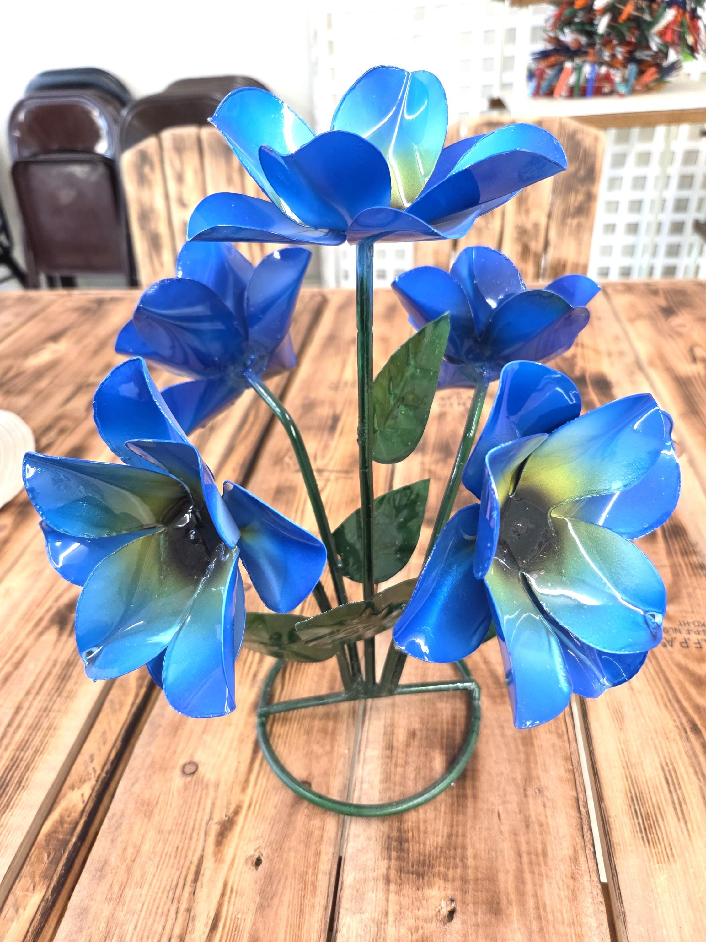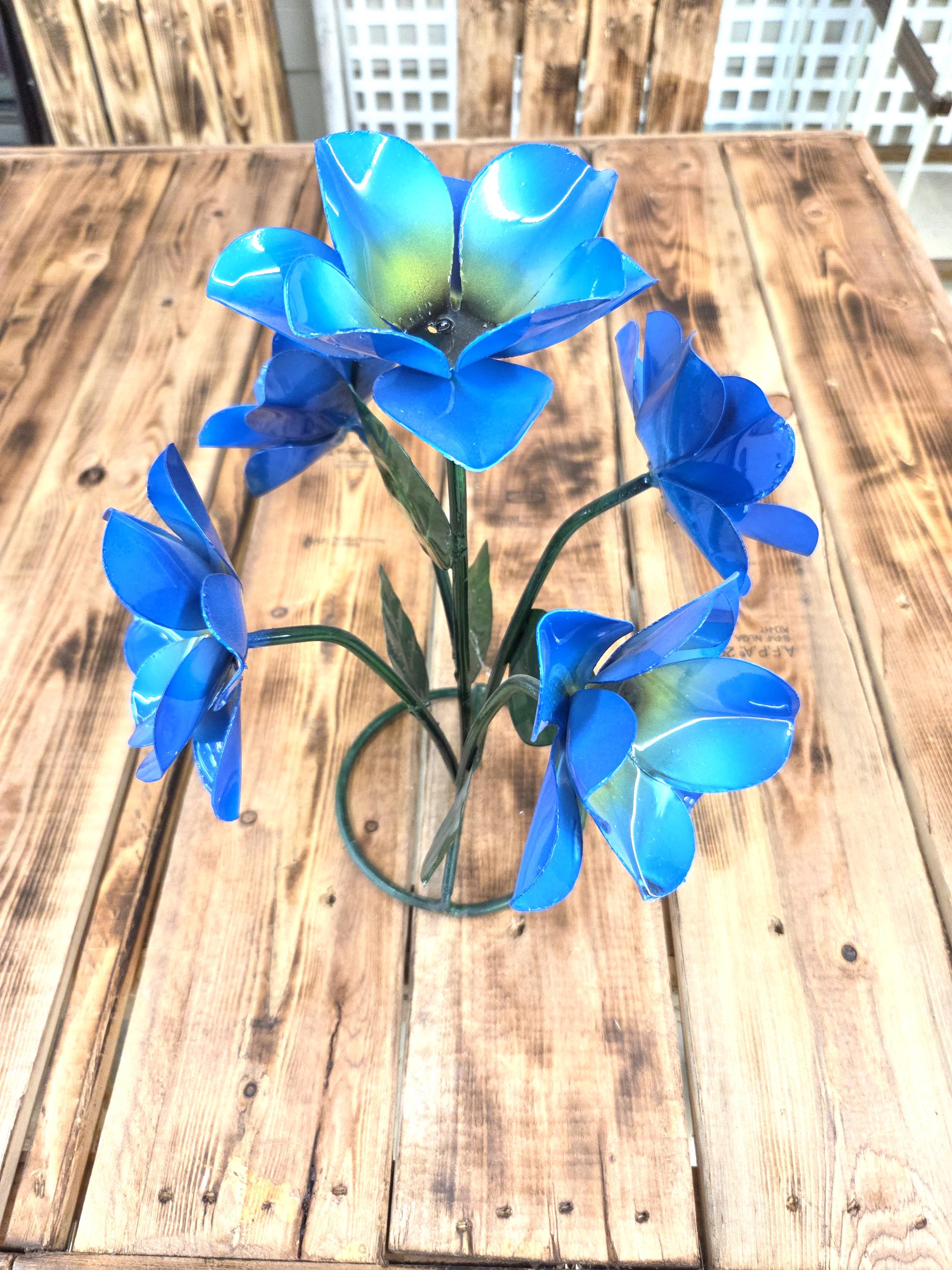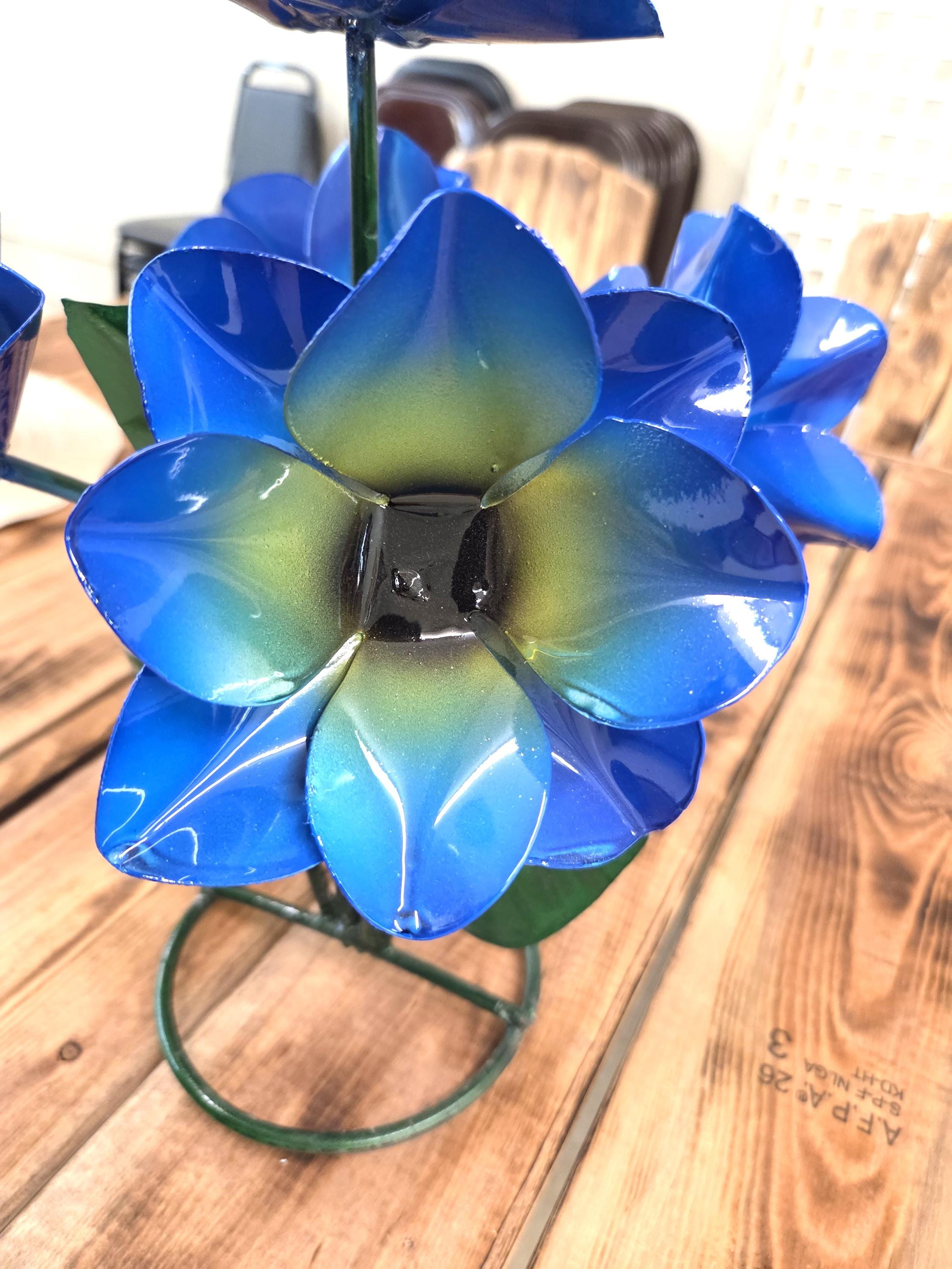 Beautiful Handmade, Hand painted 5 Flower Metal Yard Art with leaves made by a good artisan friend of mine in Mexico. You will be getting the one that is actually shown in the pictures above. These would look so nice in your home, patio, or place of business. This would also make a wonderful gift for your loved ones. So, why ever gift something just ordinary? Shop where so many home decorators do their shopping for unique items. They are very roughly 14" tall and about 10 1/2" wide irregular.