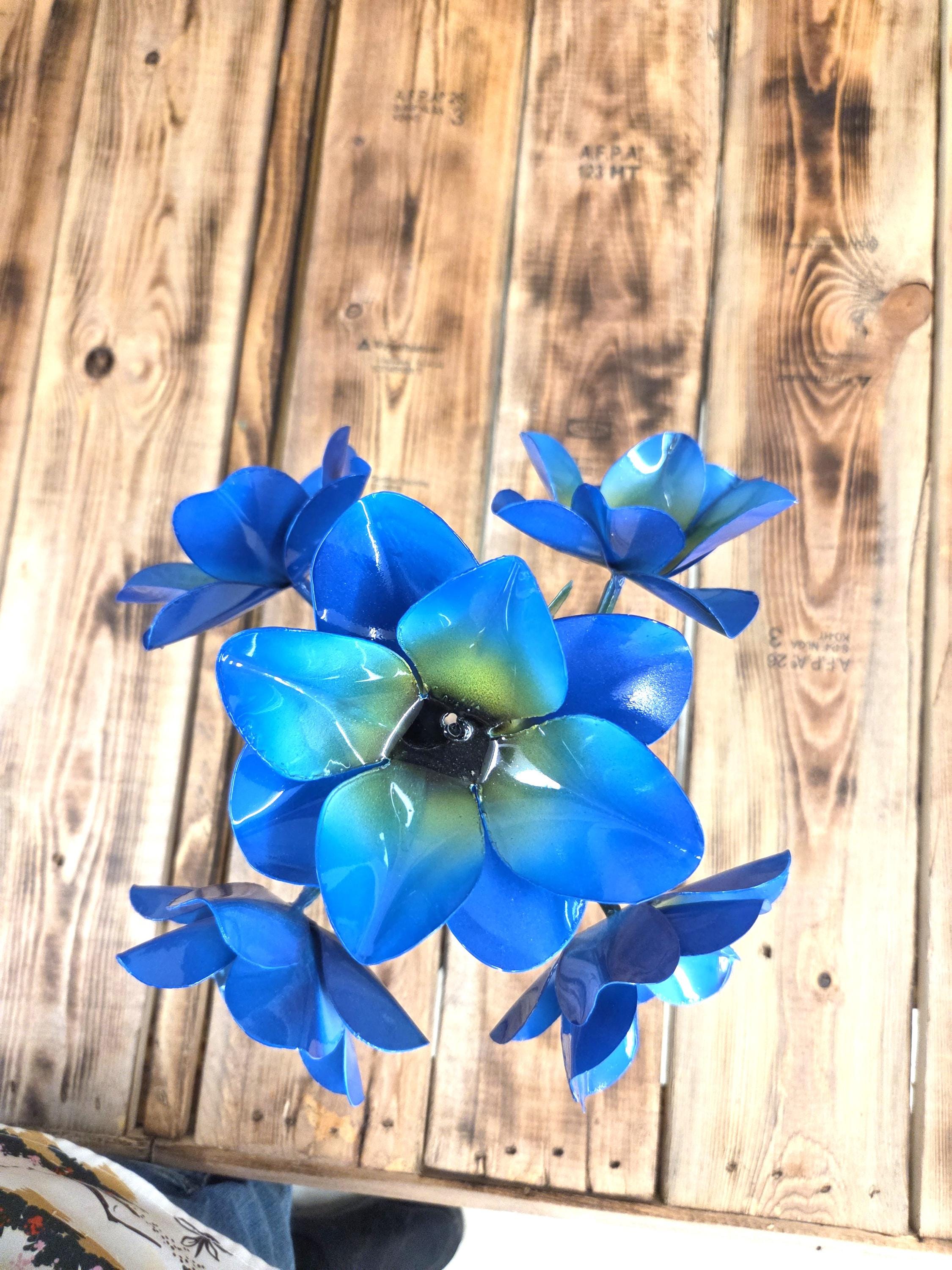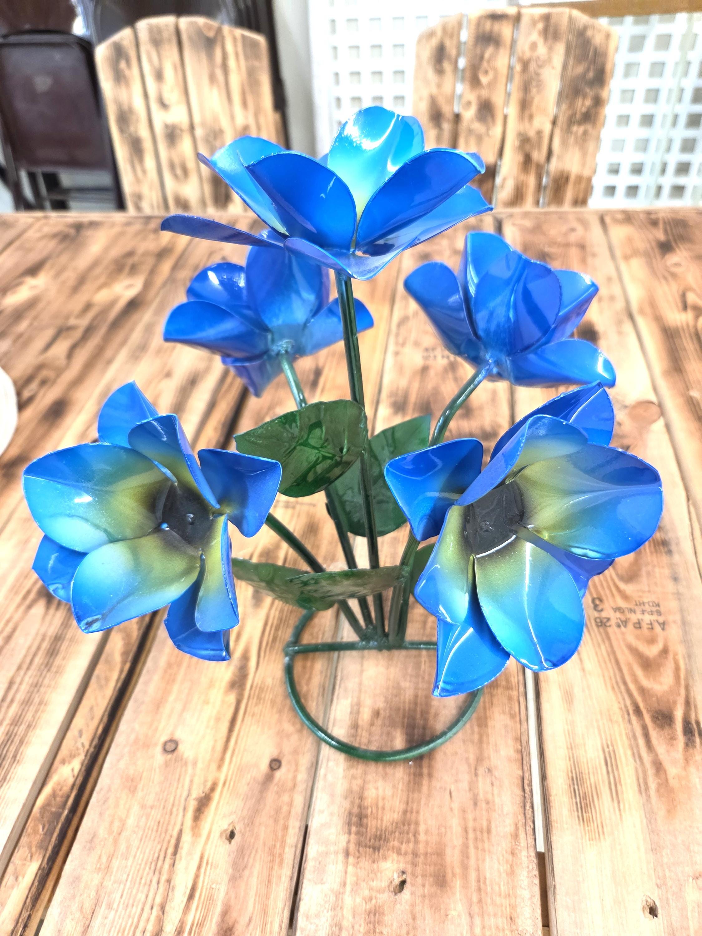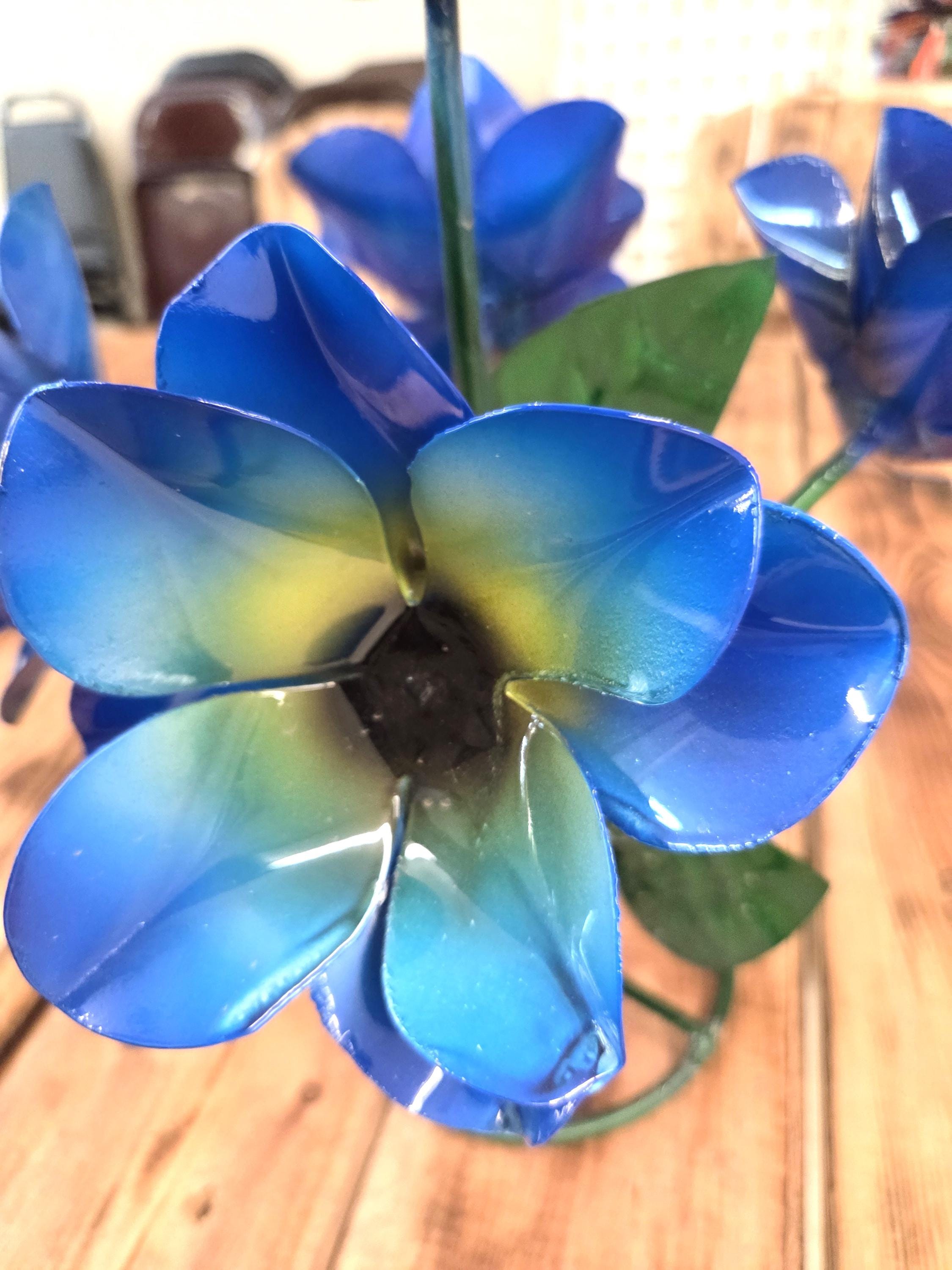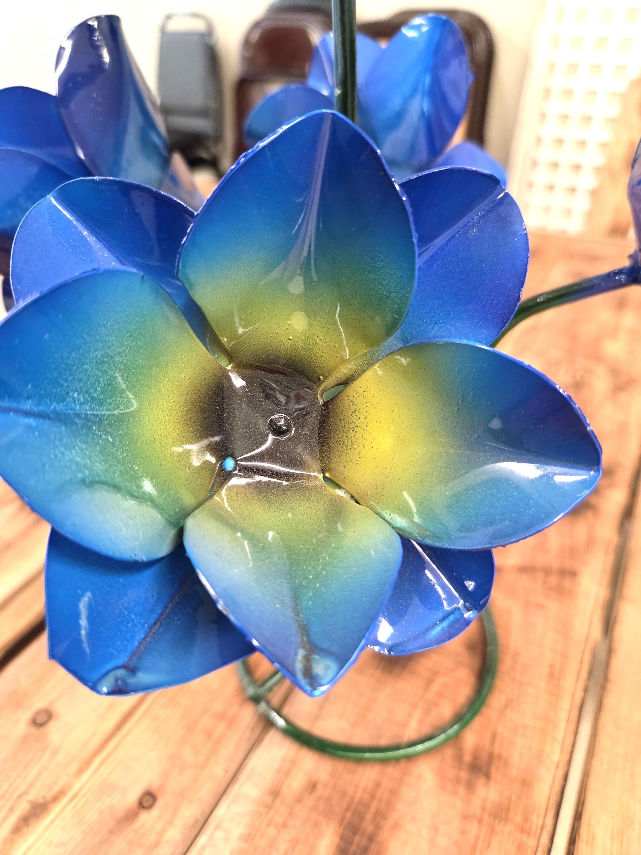 Beautiful Handmade, Hand painted 5 Flower Metal Yard Art with leaves made by a good artisan friend of mine in Mexico. You will be getting the one that is actually shown in the pictures above. These would look so nice in your home, patio, or place of business. This would also make a wonderful gift for your loved ones. So, why ever gift something just ordinary? Shop where so many home decorators do their shopping for unique items. They are very roughly 14" tall and about 10 1/2" wide irregular.