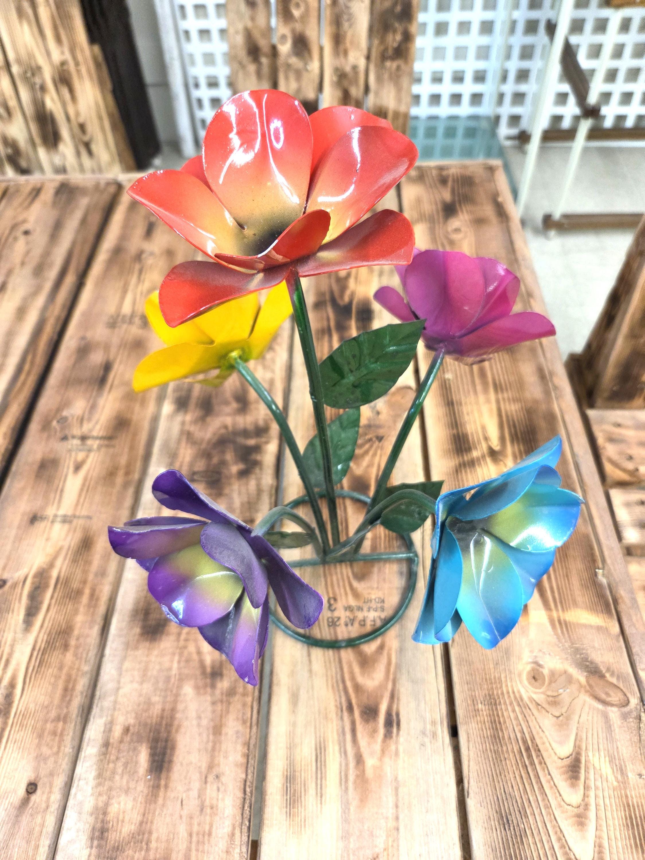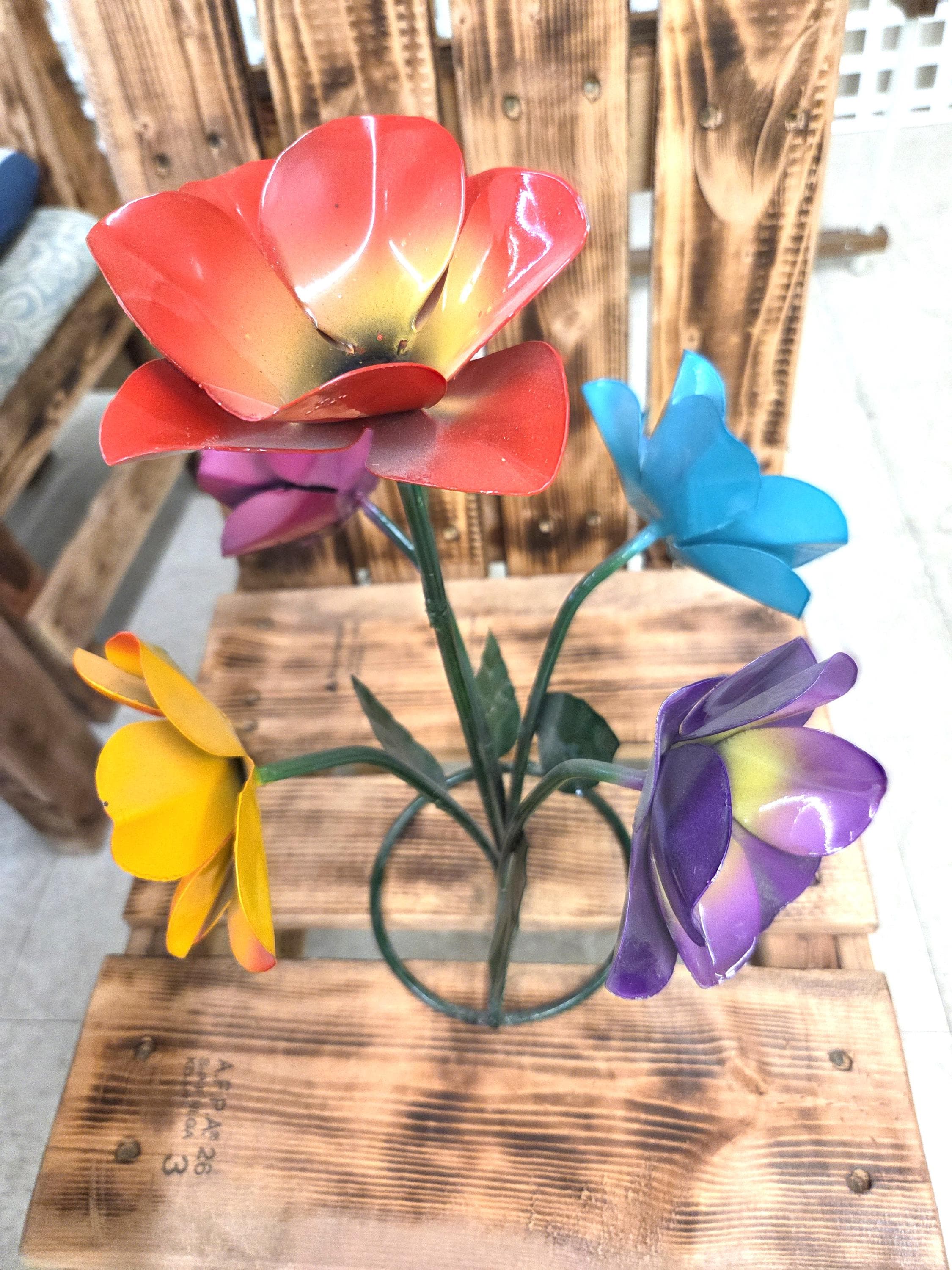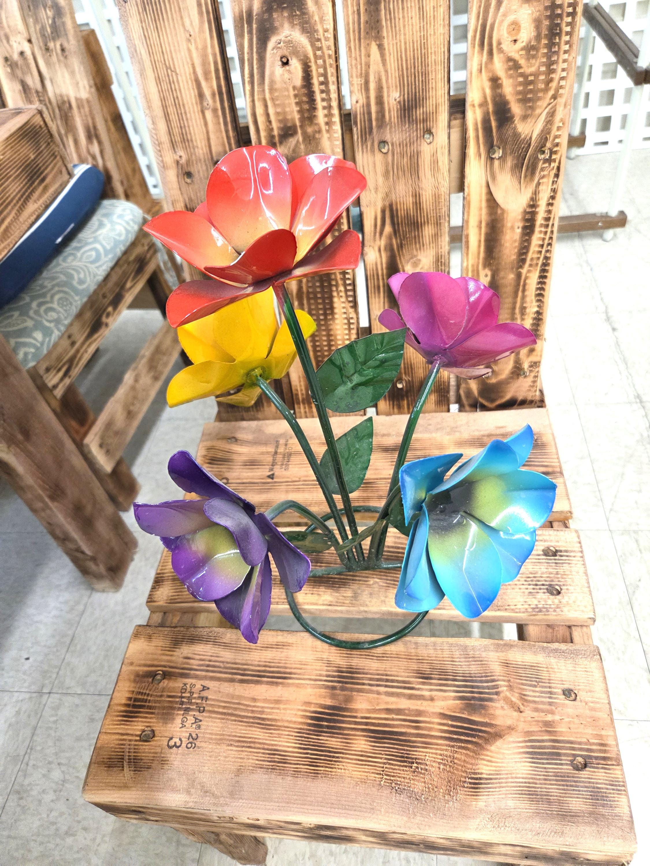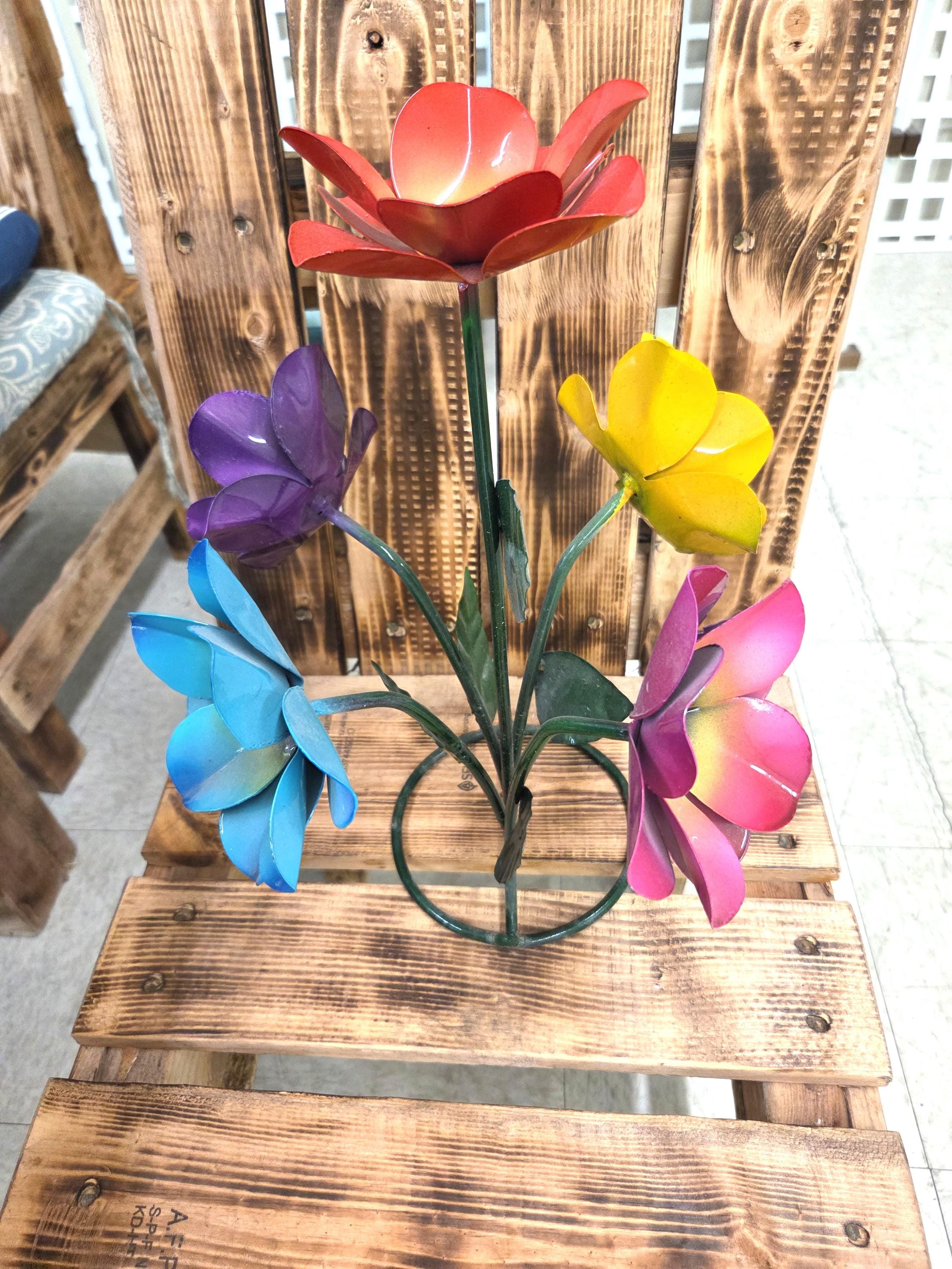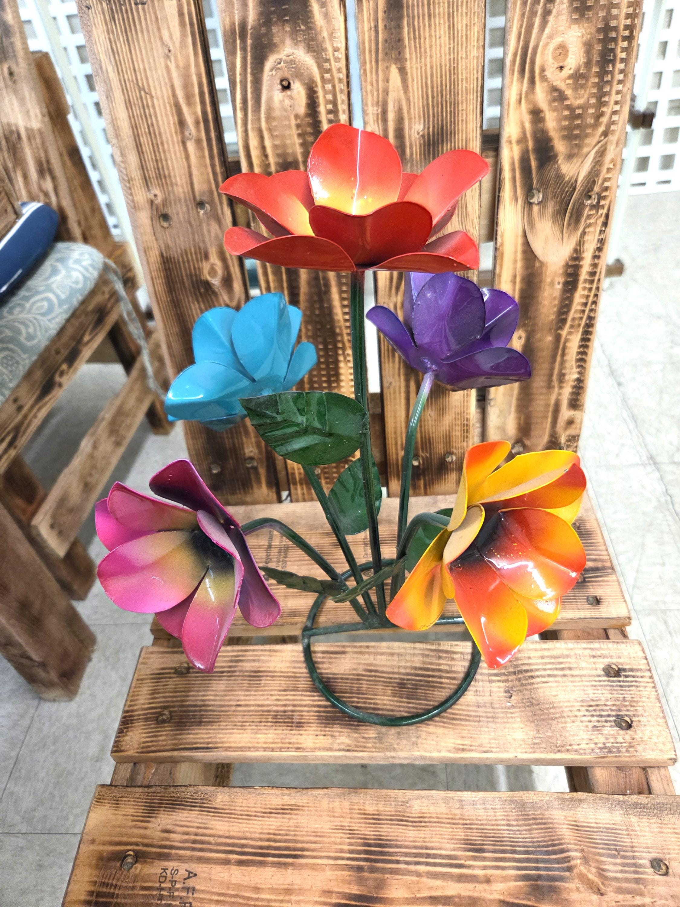 Beautiful Handmade, Hand painted 5 Flower Metal Yard Art with leaves made by a good artisan friend of mine in Mexico. You will be getting the one that is actually shown in the pictures above. These would look so nice in your home, patio, or place of business. This would also make a wonderful gift for your loved ones. So, why ever gift something just ordinary? Shop where so many home decorators do their shopping for unique items. They are very roughly 14 1/2" tall and about 10 3/4" wide irregular.