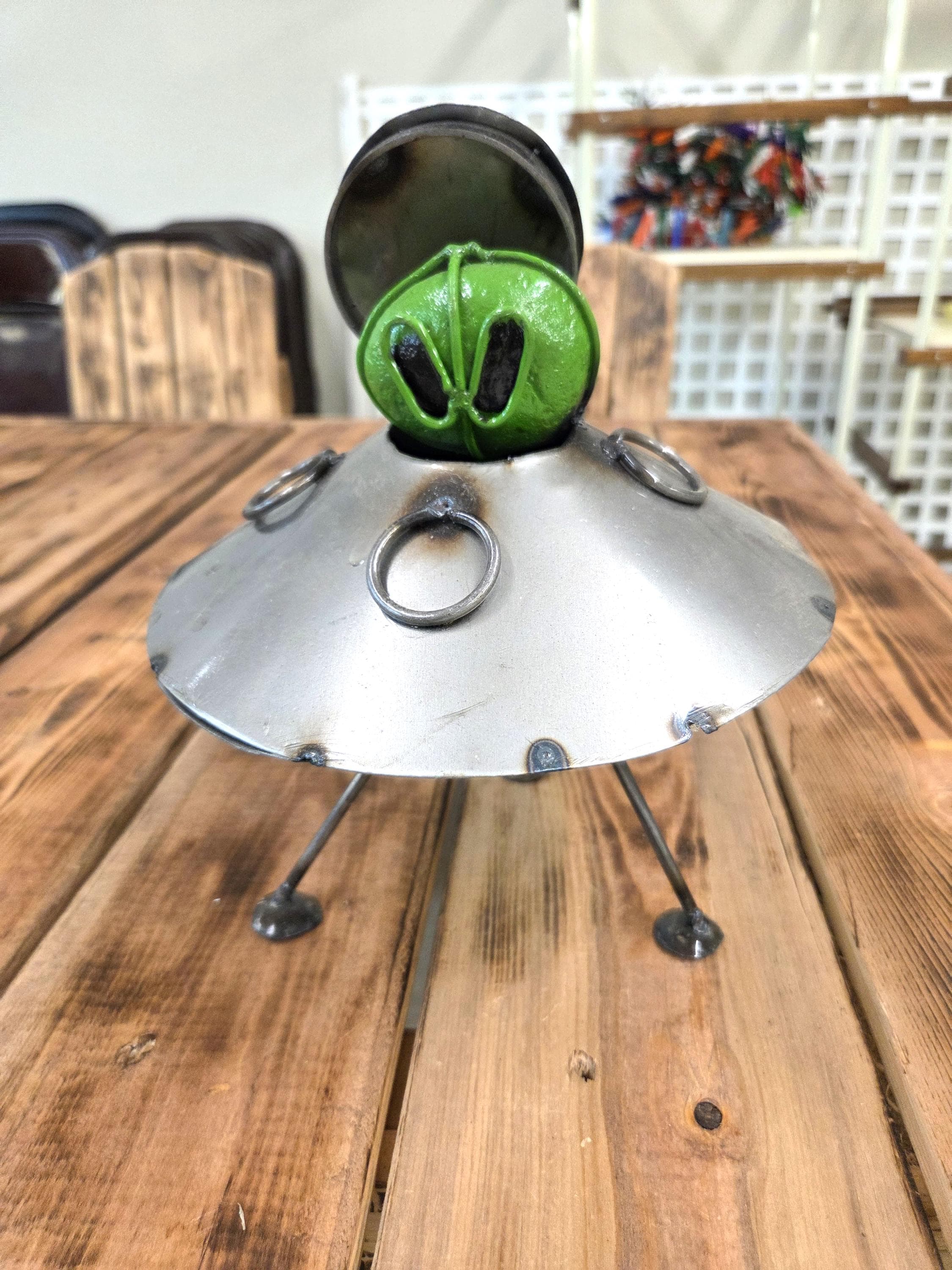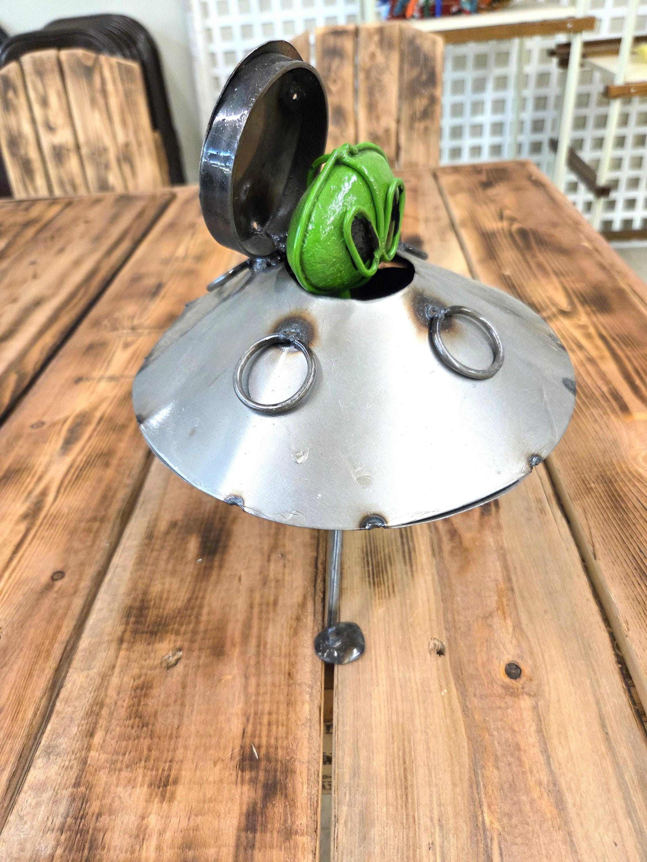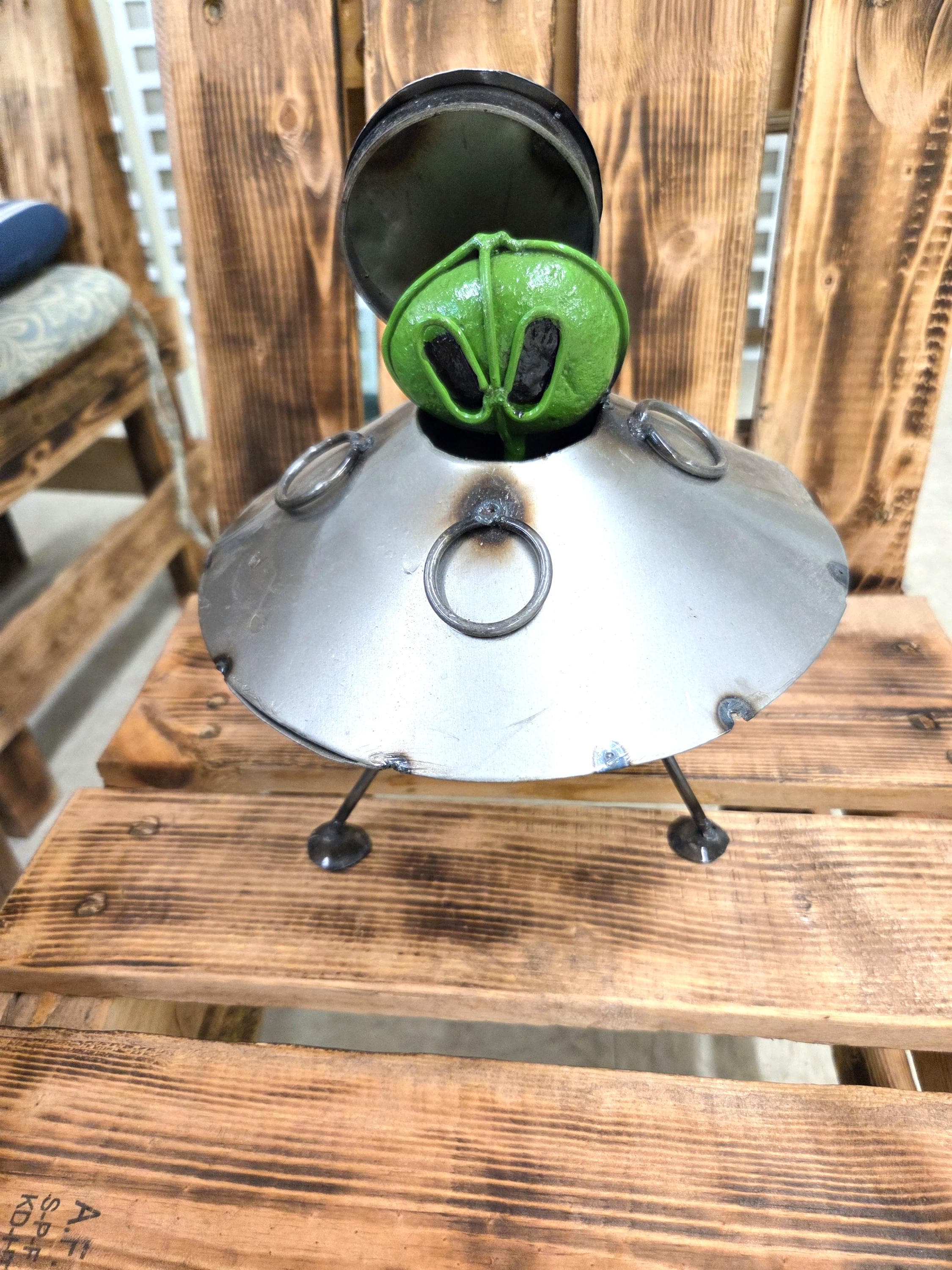Bring a touch of whimsical sci‑fi charm to your space with this Rustic Green Martian Spaceman in a Flying Saucer, a 12‑inch tall metal art sculpture that feels straight out of a retro space adventure. Hand‑crafted with a weathered, rustic finish, this quirky little alien sits proudly in his UFO, ready to hover on your shelf, desk, or garden nook. Its playful design and vintage character make it a standout piece for collectors, sci‑fi lovers, or anyone who enjoys unique, conversation‑starting decor. Whether displayed indoors or outside, this Martian brings personality, imagination, and a hint of cosmic mischief to any setting.
