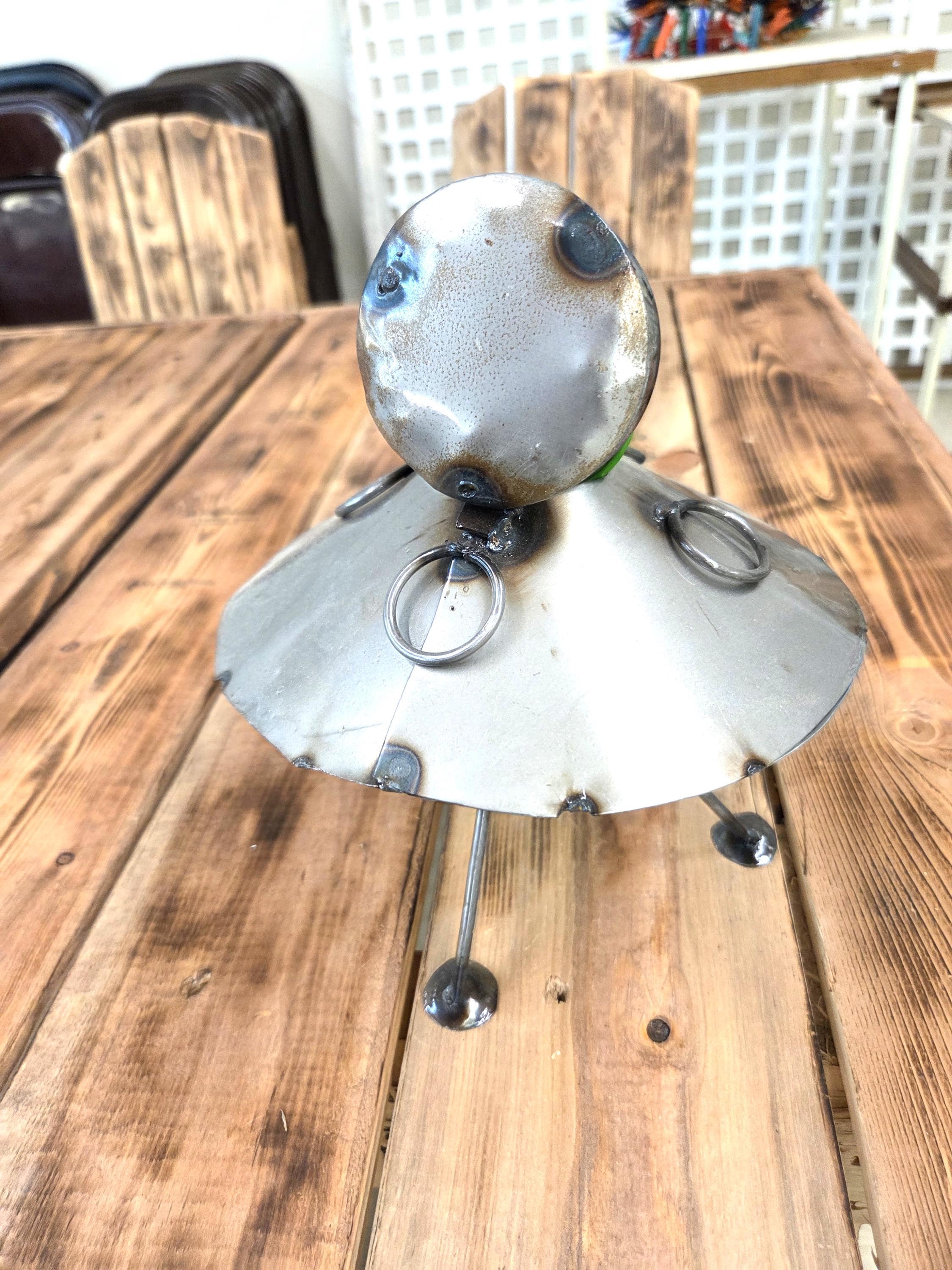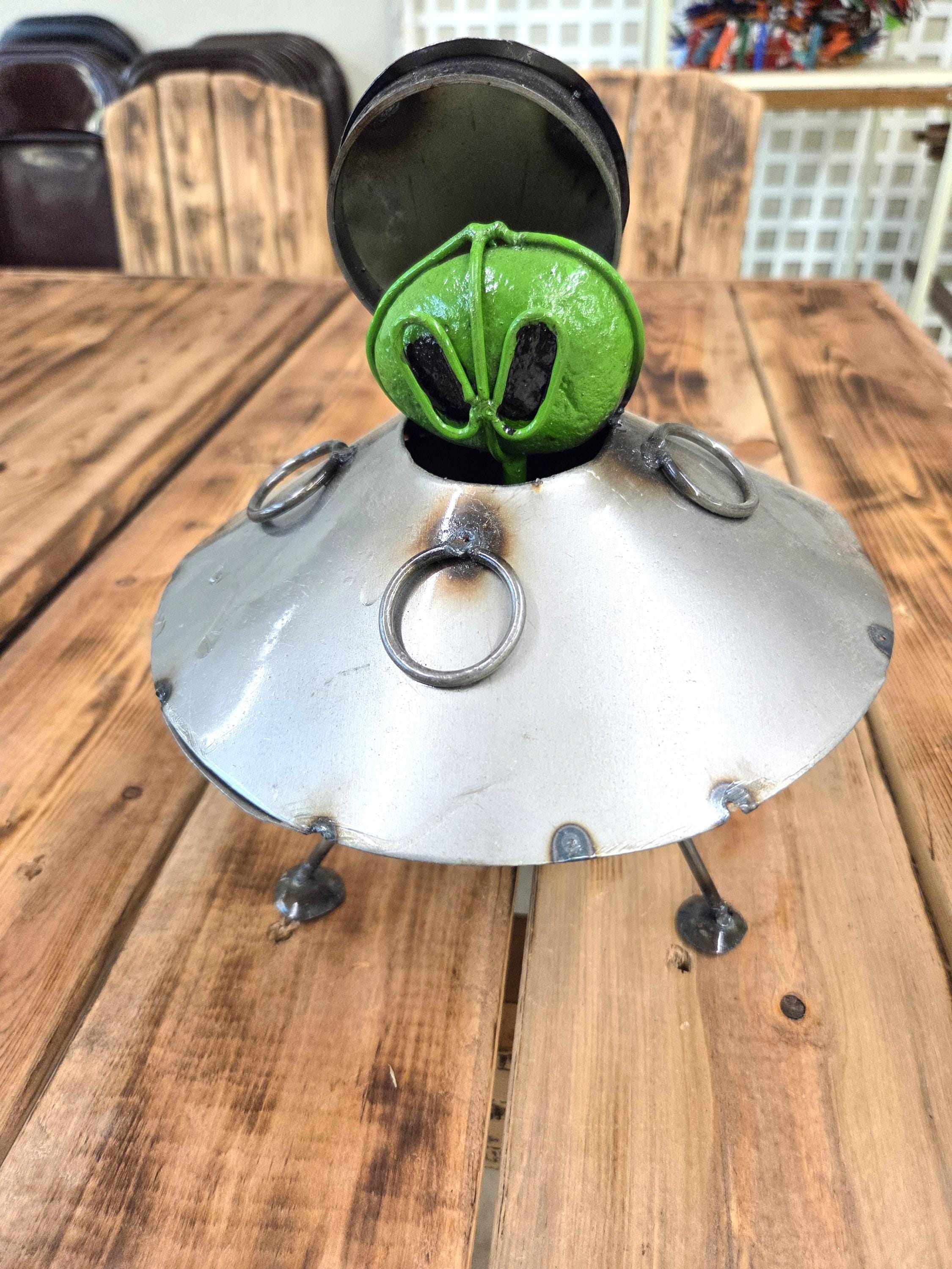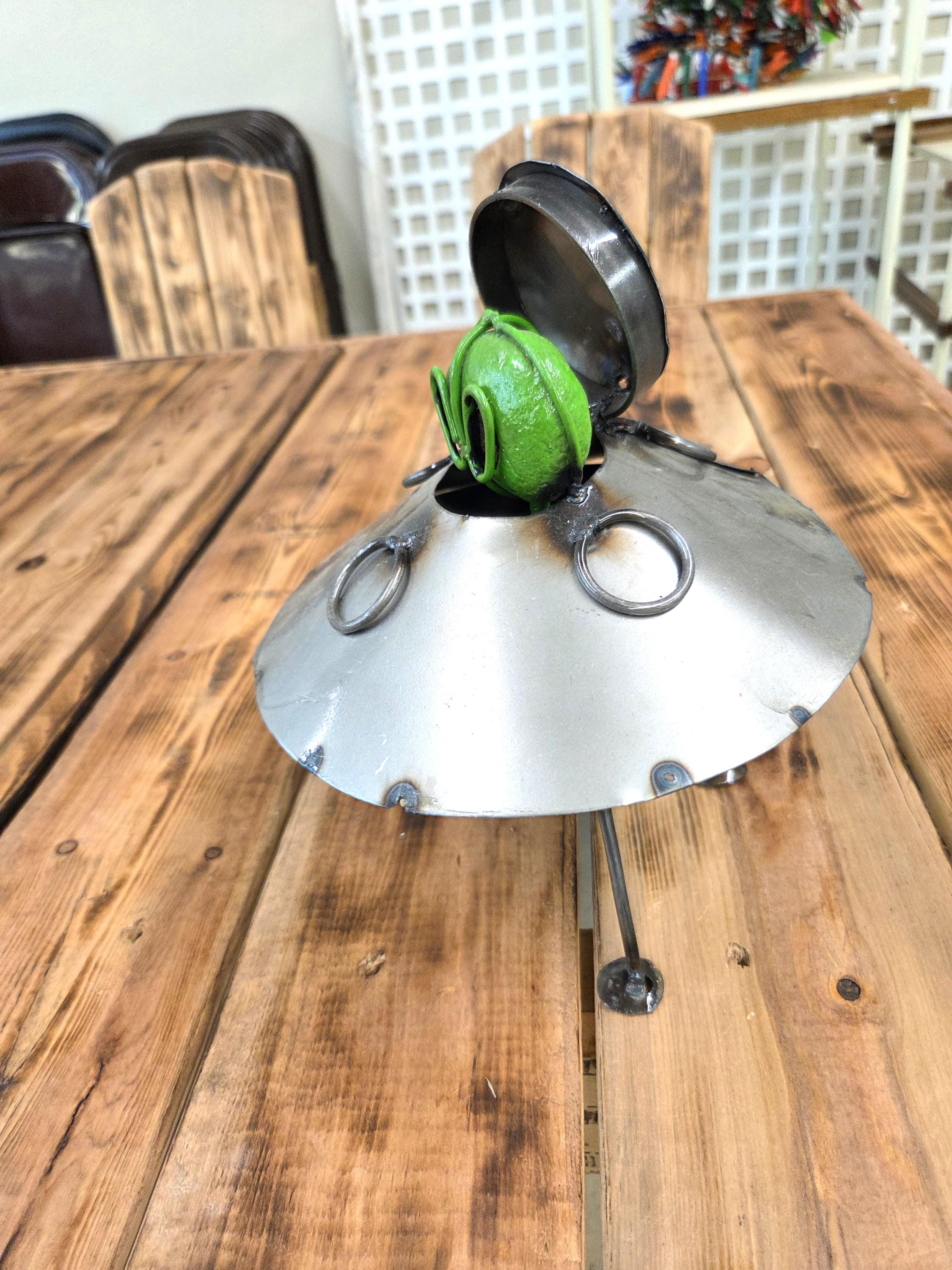 Bring a touch of whimsical sci‑fi charm to your space with this Rustic Green Martian Spaceman in a Flying Saucer, a 12‑inch tall metal art sculpture that feels straight out of a retro space adventure. Hand‑crafted with a weathered, rustic finish, this quirky little alien sits proudly in his UFO, ready to hover on your shelf, desk, or garden nook. Its playful design and vintage character make it a standout piece for collectors, sci‑fi lovers, or anyone who enjoys unique, conversation‑starting decor. Whether displayed indoors or outside, this Martian brings personality, imagination, and a hint of cosmic mischief to any setting.