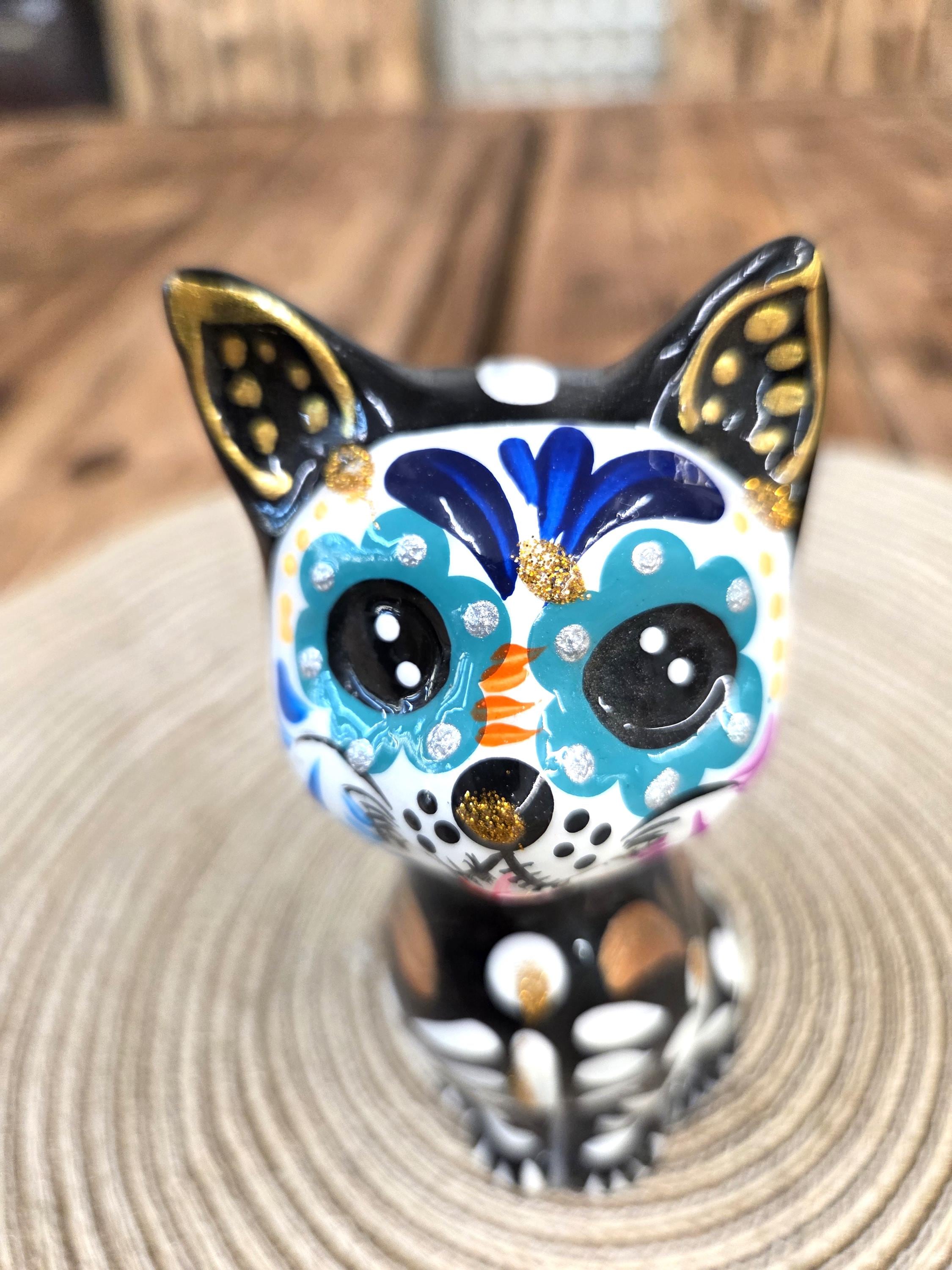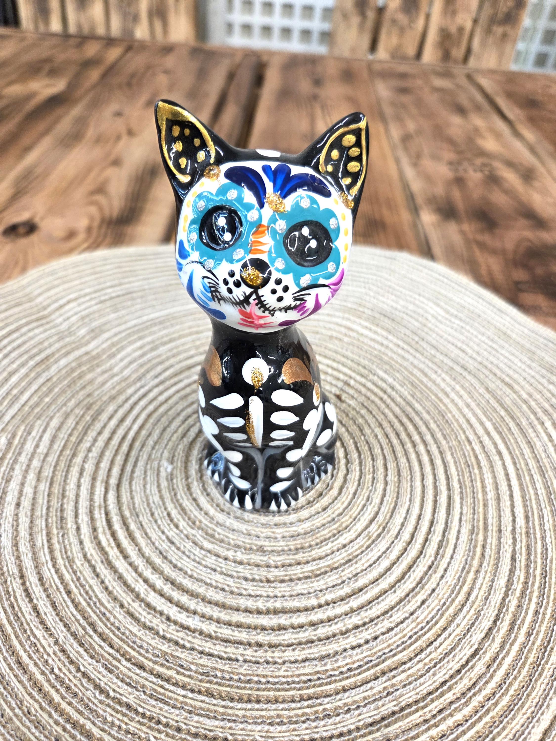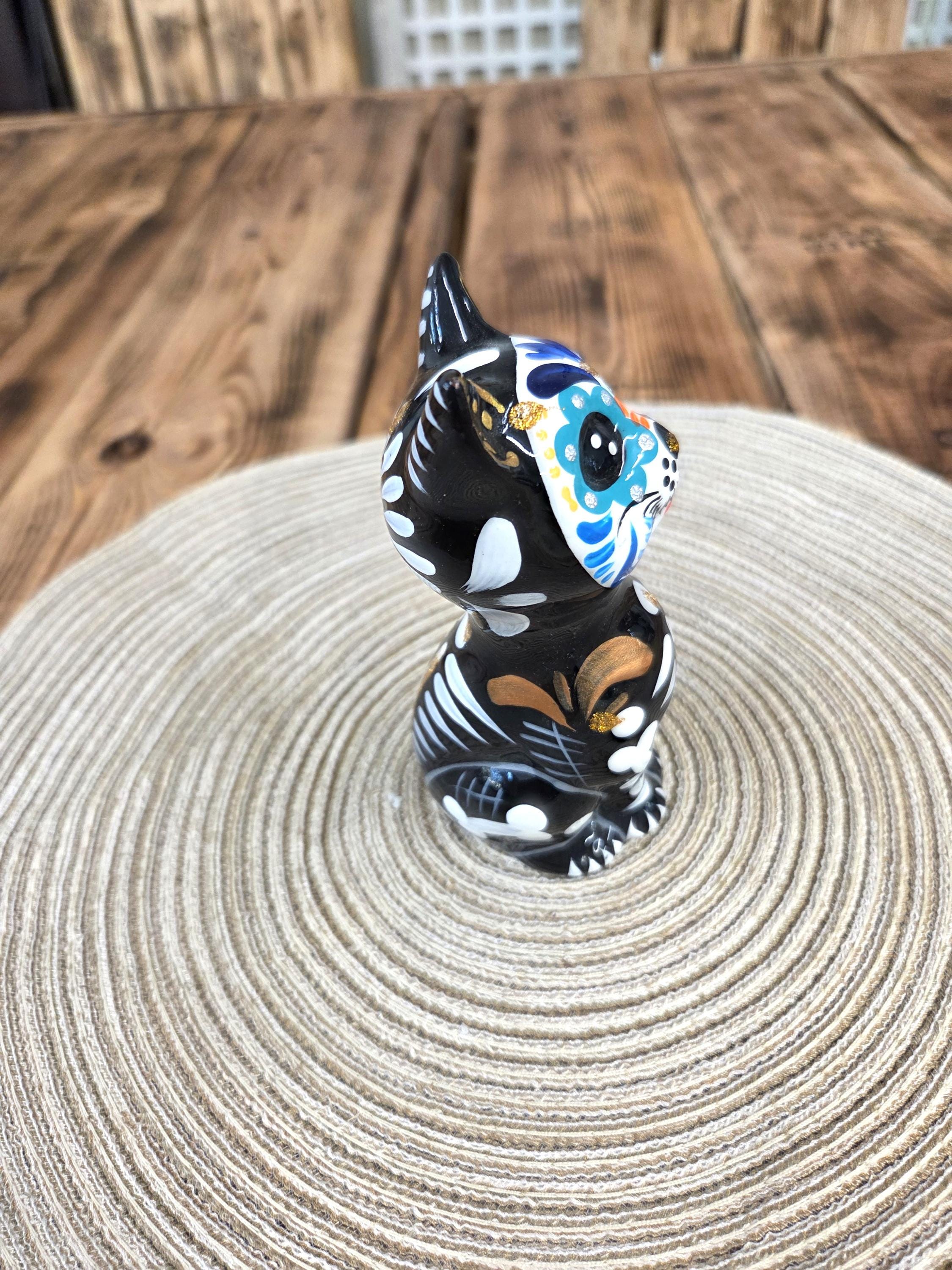 This charming handmade 5-inch ceramic kitty cat (gato) is a vibrant piece of authentic Mexican folk art, lovingly crafted and hand‑painted by skilled artisans in Mexico. Every figurine is unique, showcasing detailed brushwork, bold colors, and the joyful artistic style traditional to Mexican ceramic craftsmanship. Its compact size makes it perfect for displaying on shelves, desks, or altars, and it adds a warm, playful touch to any home décor. Whether you're a cat lover, a collector of folk art, or searching for a meaningful handmade gift, this delightful kitty brings personality, culture, and artisan beauty into any space.