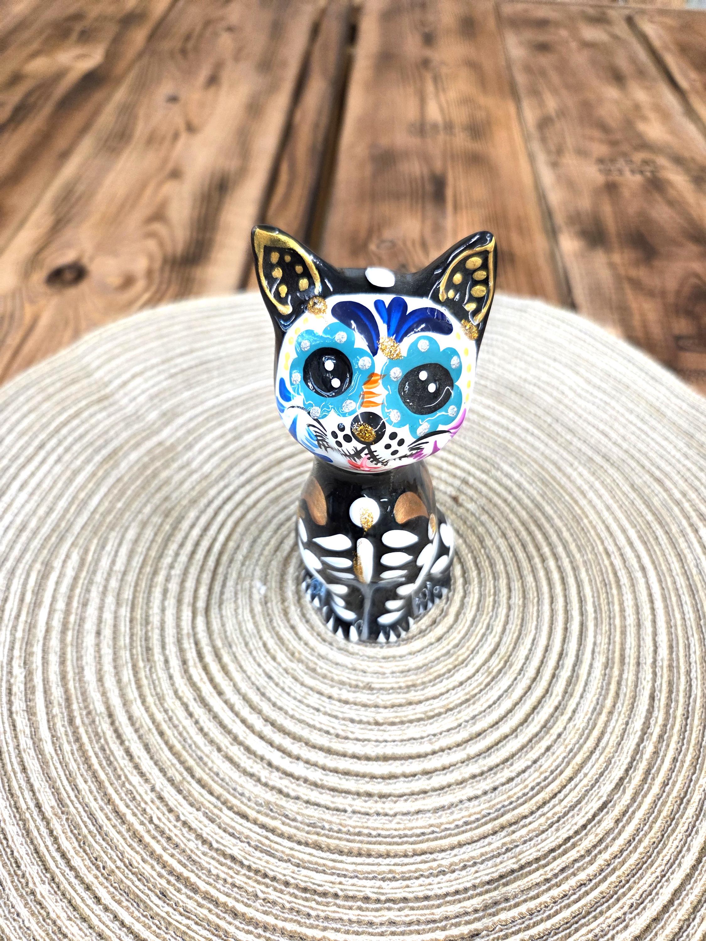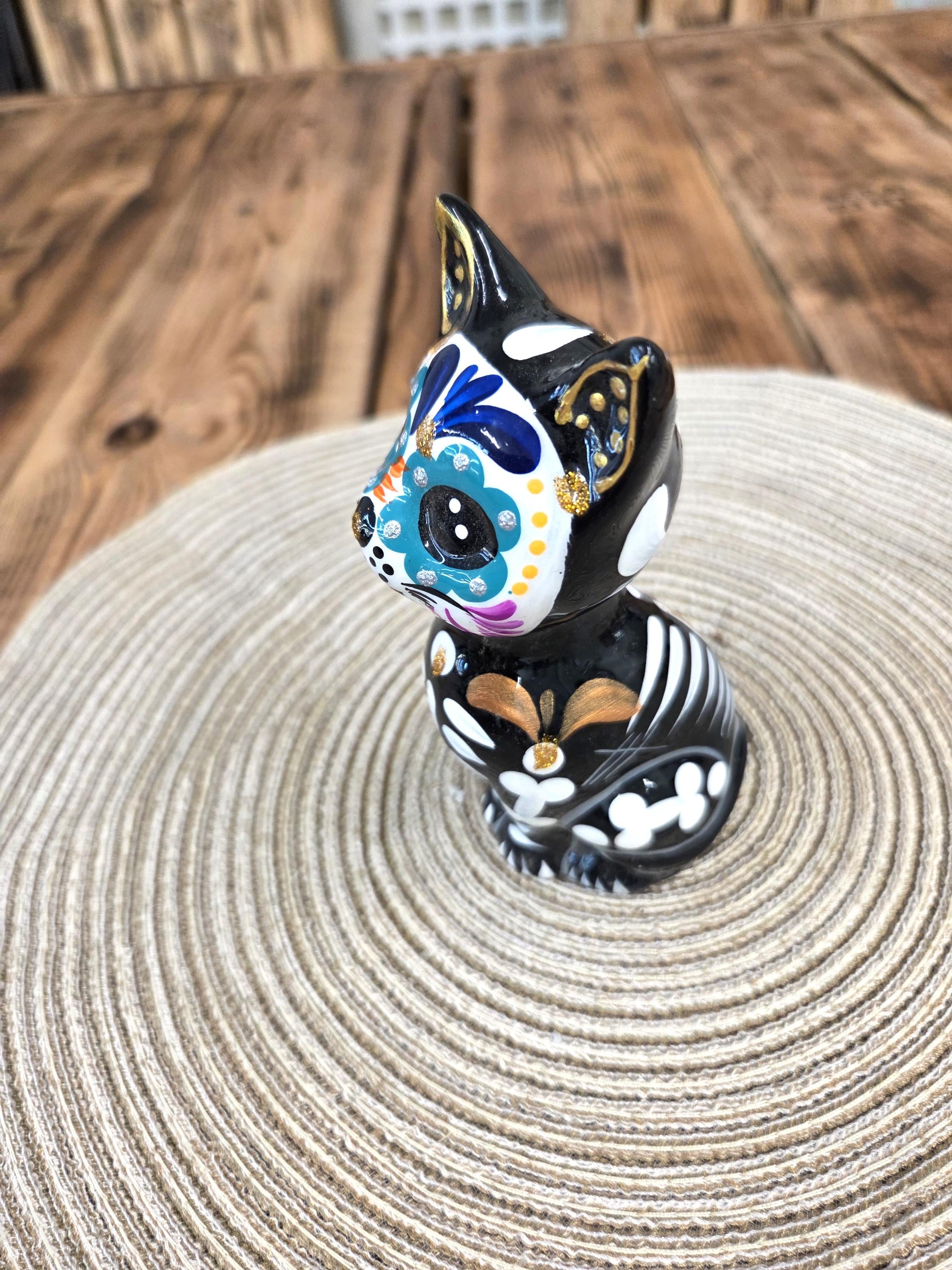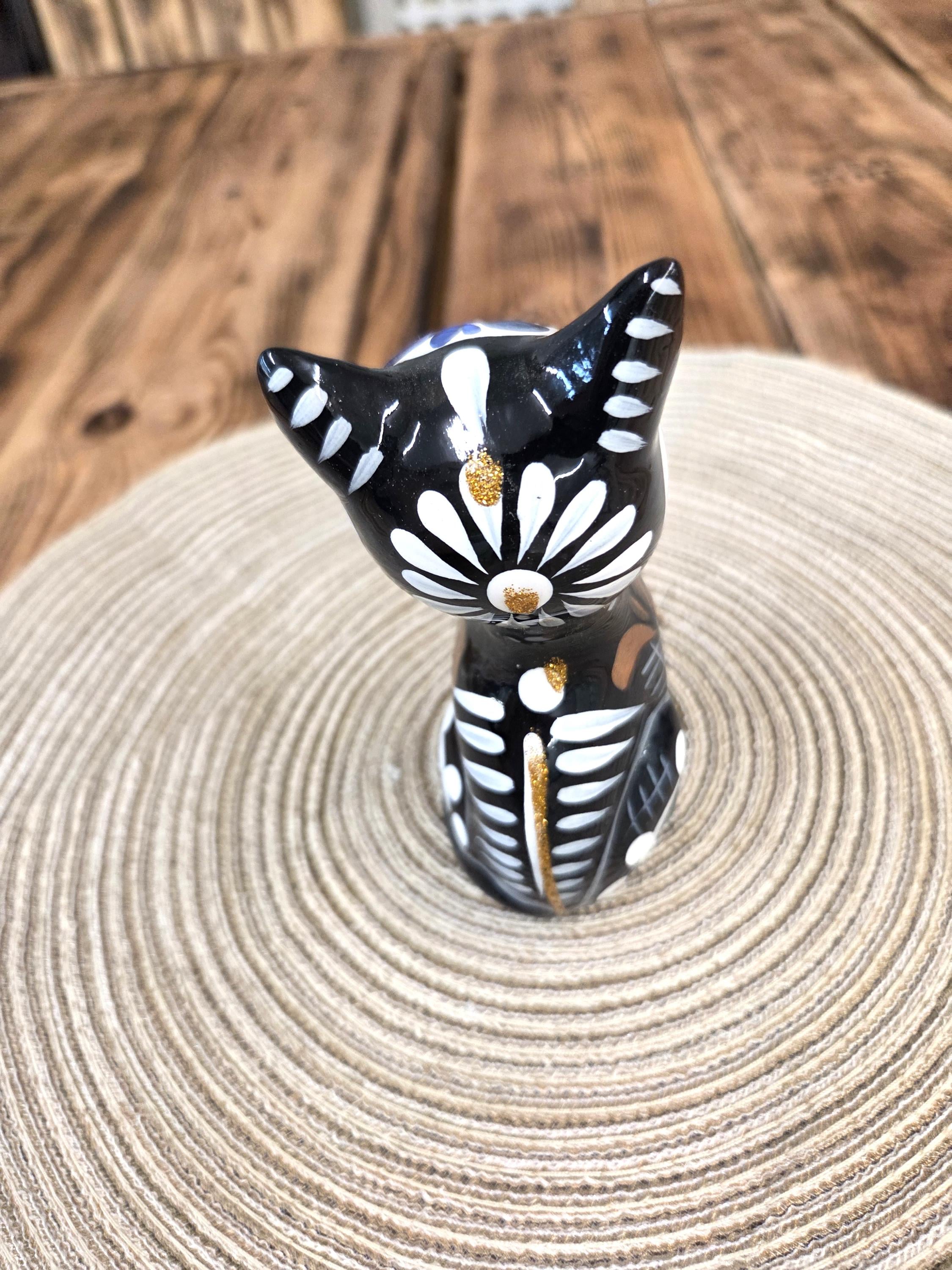 This charming handmade 5-inch ceramic kitty cat (gato) is a vibrant piece of authentic Mexican folk art, lovingly crafted and hand‑painted by skilled artisans in Mexico. Every figurine is unique, showcasing detailed brushwork, bold colors, and the joyful artistic style traditional to Mexican ceramic craftsmanship. Its compact size makes it perfect for displaying on shelves, desks, or altars, and it adds a warm, playful touch to any home décor. Whether you're a cat lover, a collector of folk art, or searching for a meaningful handmade gift, this delightful kitty brings personality, culture, and artisan beauty into any space.