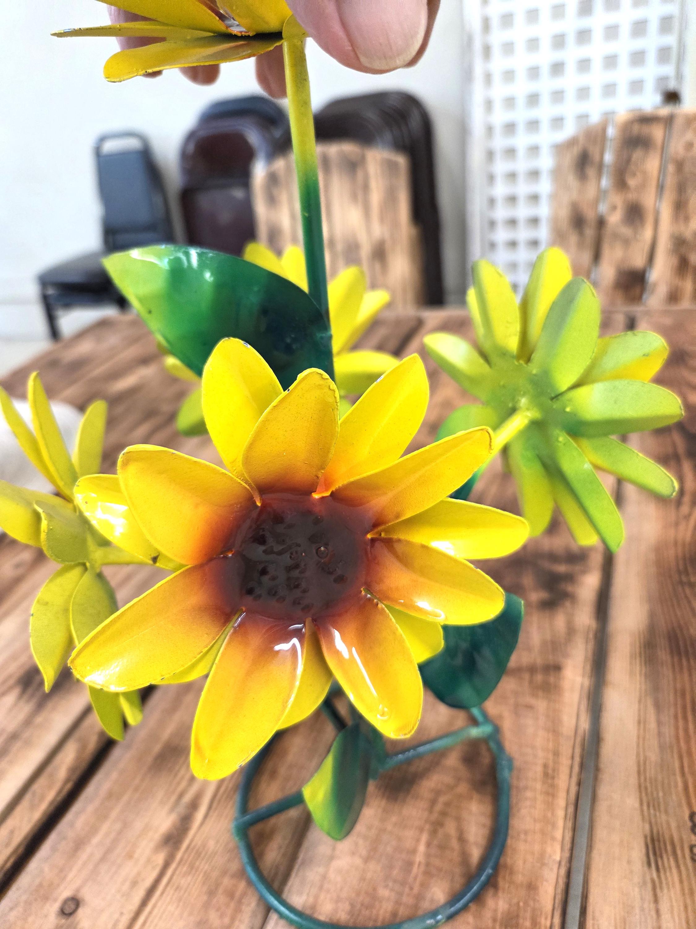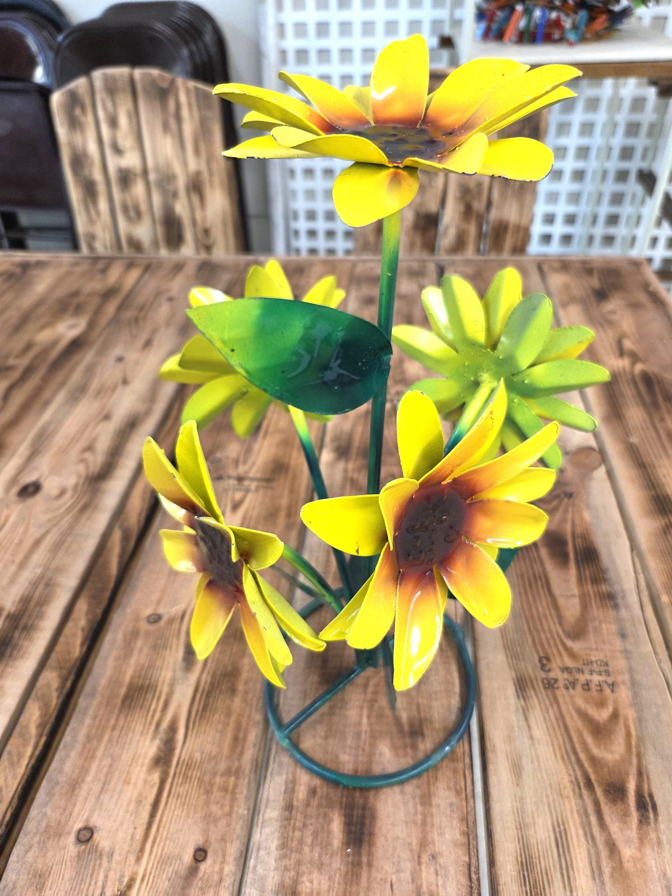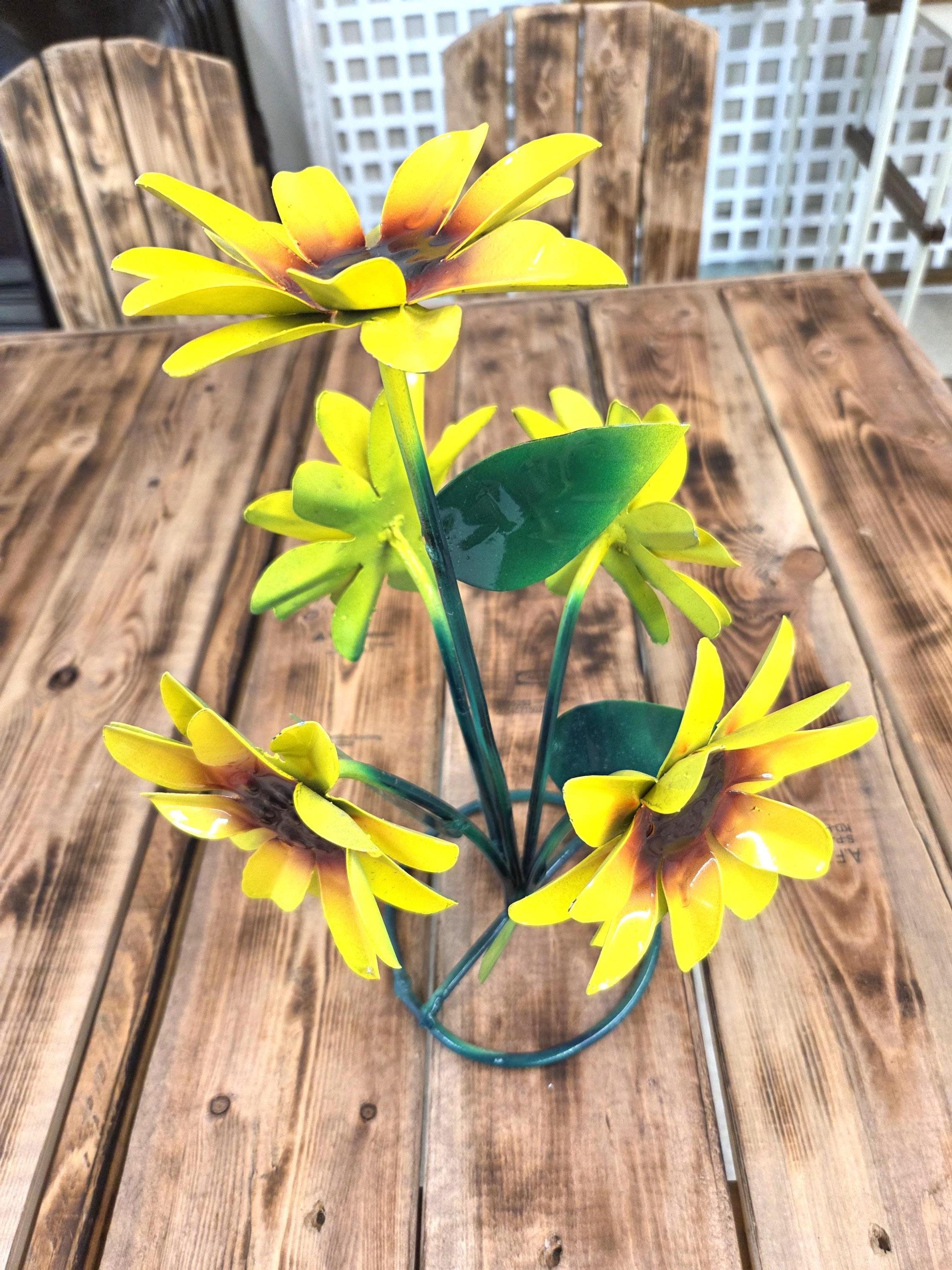 Beautiful Handmade, Hand painted 5 Flower Metal Yard Art with leaves made by a good artisan friend of mine in Mexico. You will be getting the one that is actually shown in the pictures above. These would look so nice in your home, patio, or place of business. This would also make a wonderful gift for your loved ones. So, why ever gift something just ordinary? Shop where so many home decorators do their shopping for unique items. They are very roughly 15" tall and about 9" wide irregular.
