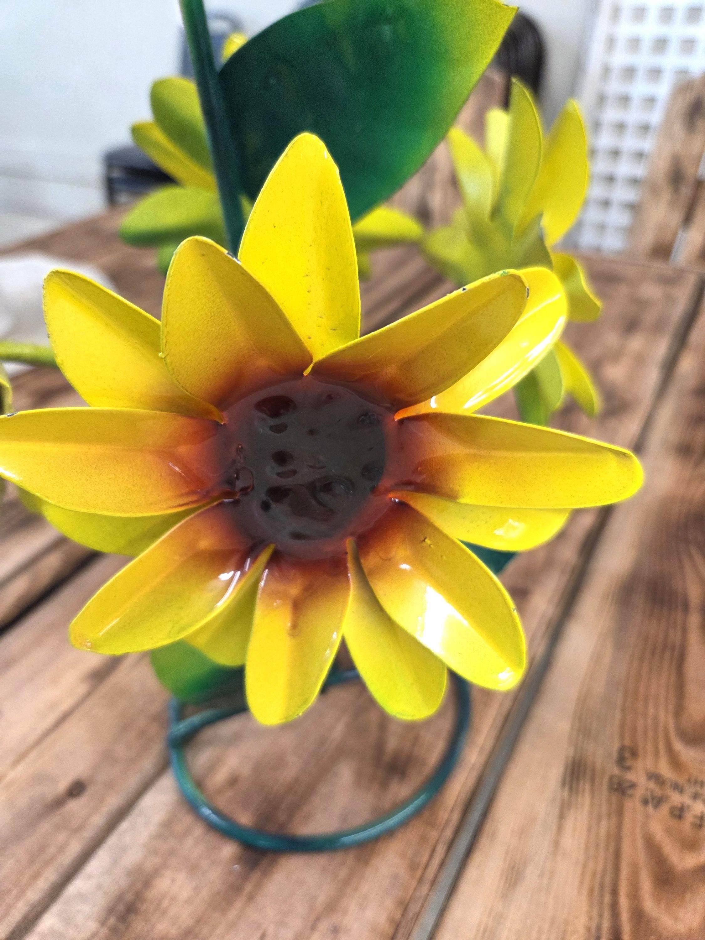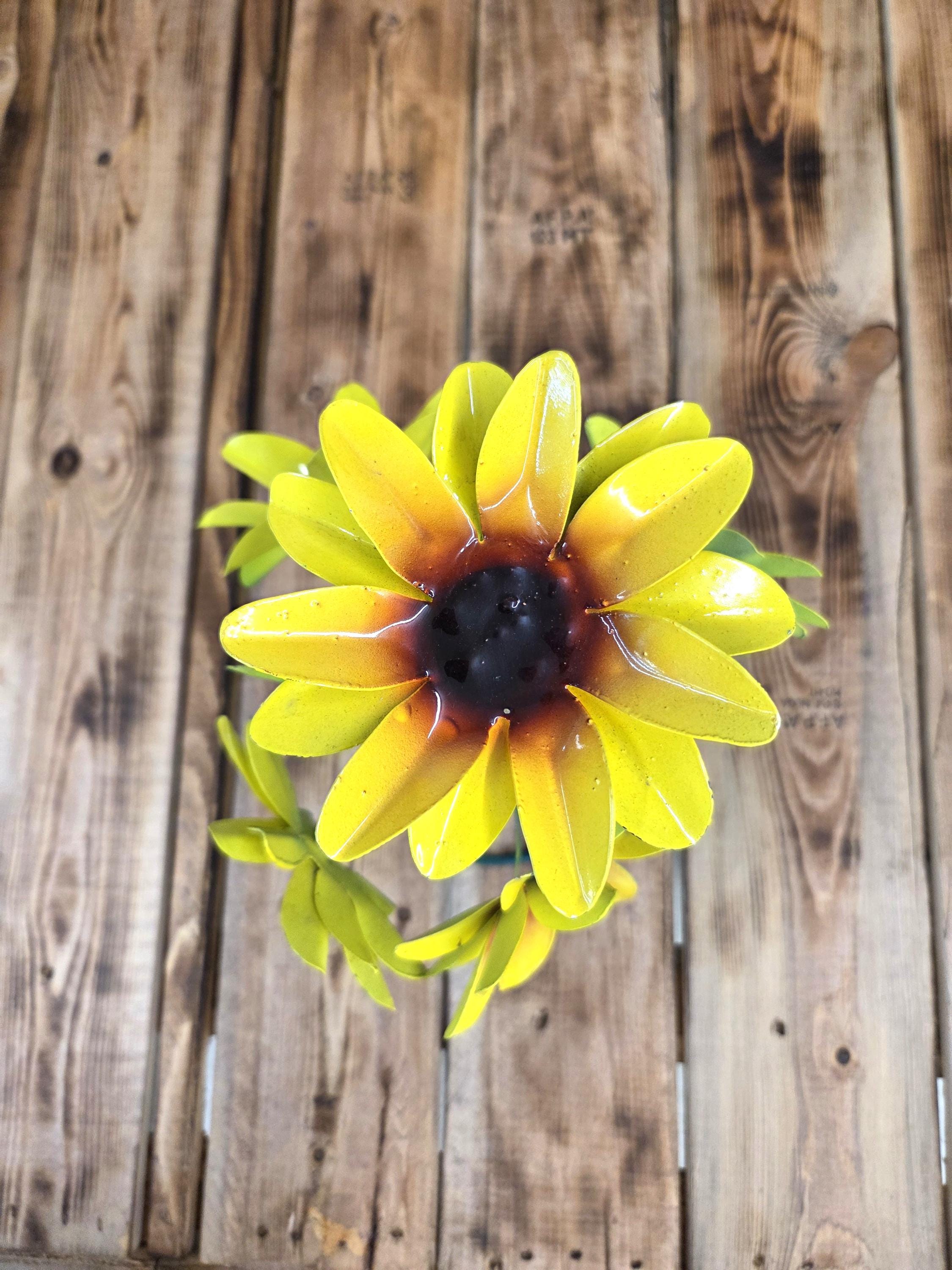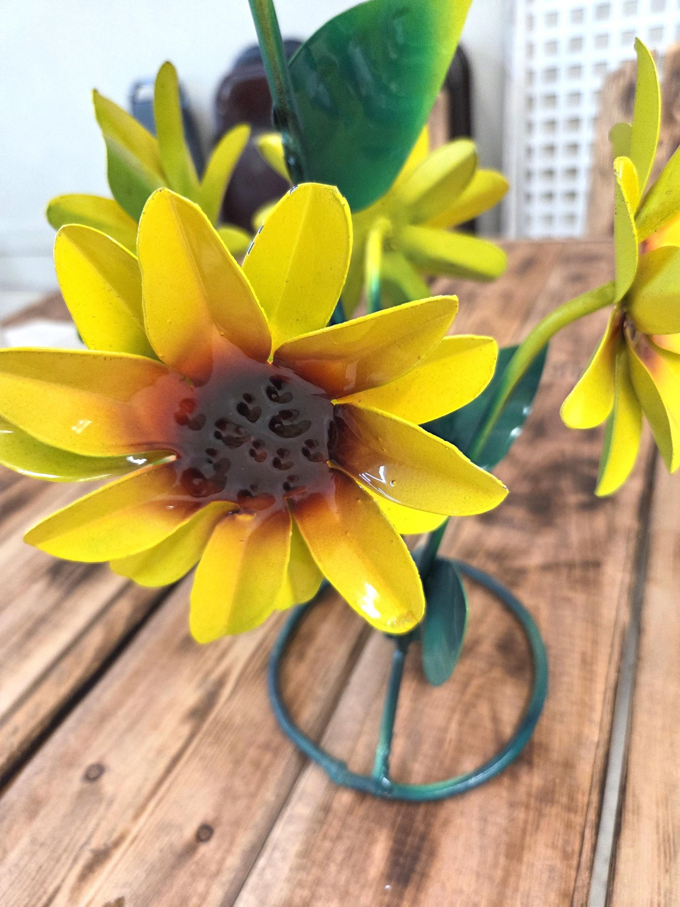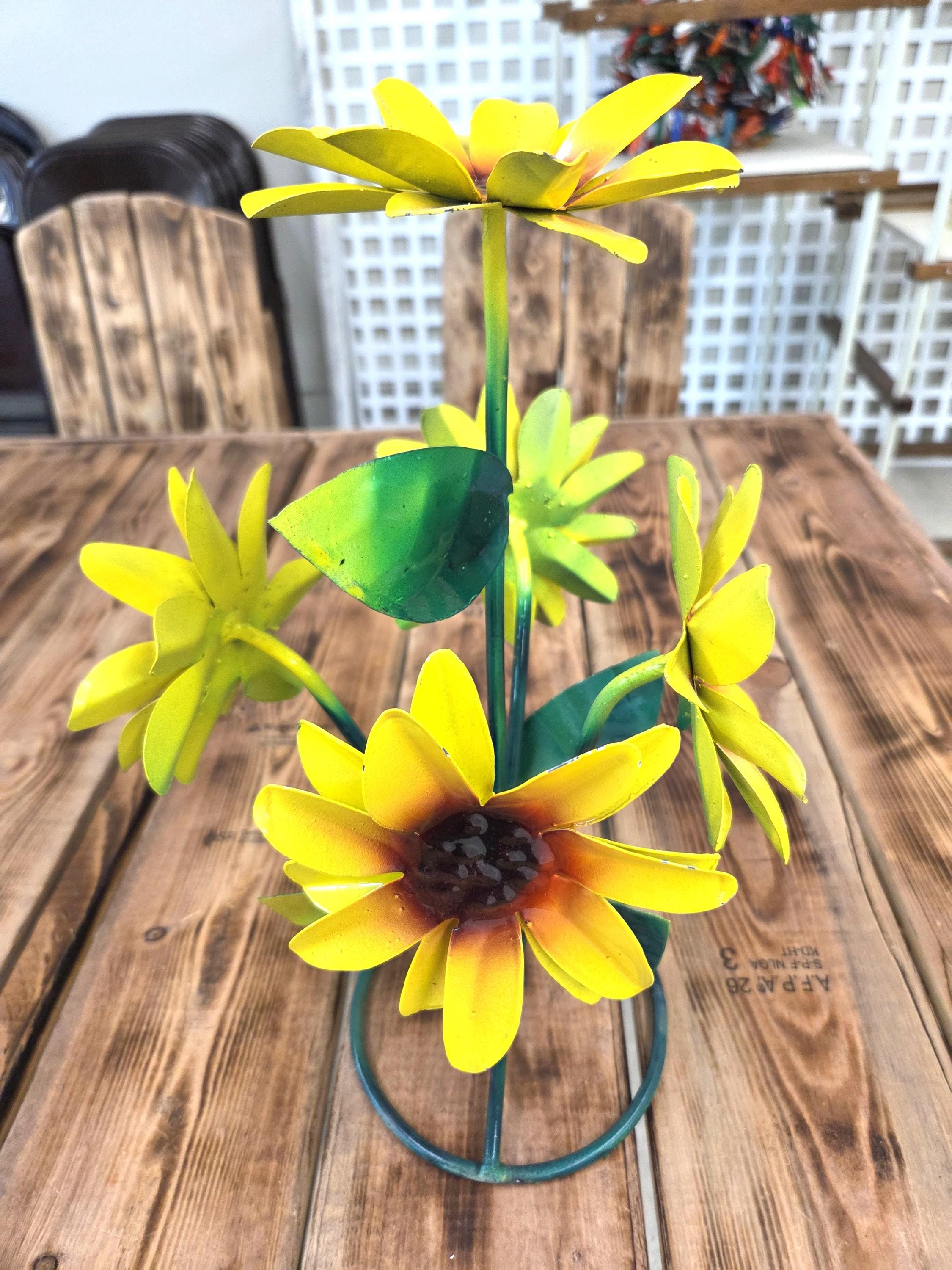 Beautiful Handmade, Hand painted 5 Flower Metal Yard Art with leaves made by a good artisan friend of mine in Mexico. You will be getting the one that is actually shown in the pictures above. These would look so nice in your home, patio, or place of business. This would also make a wonderful gift for your loved ones. So, why ever gift something just ordinary? Shop where so many home decorators do their shopping for unique items. They are very roughly 15" tall and about 9" wide irregular.