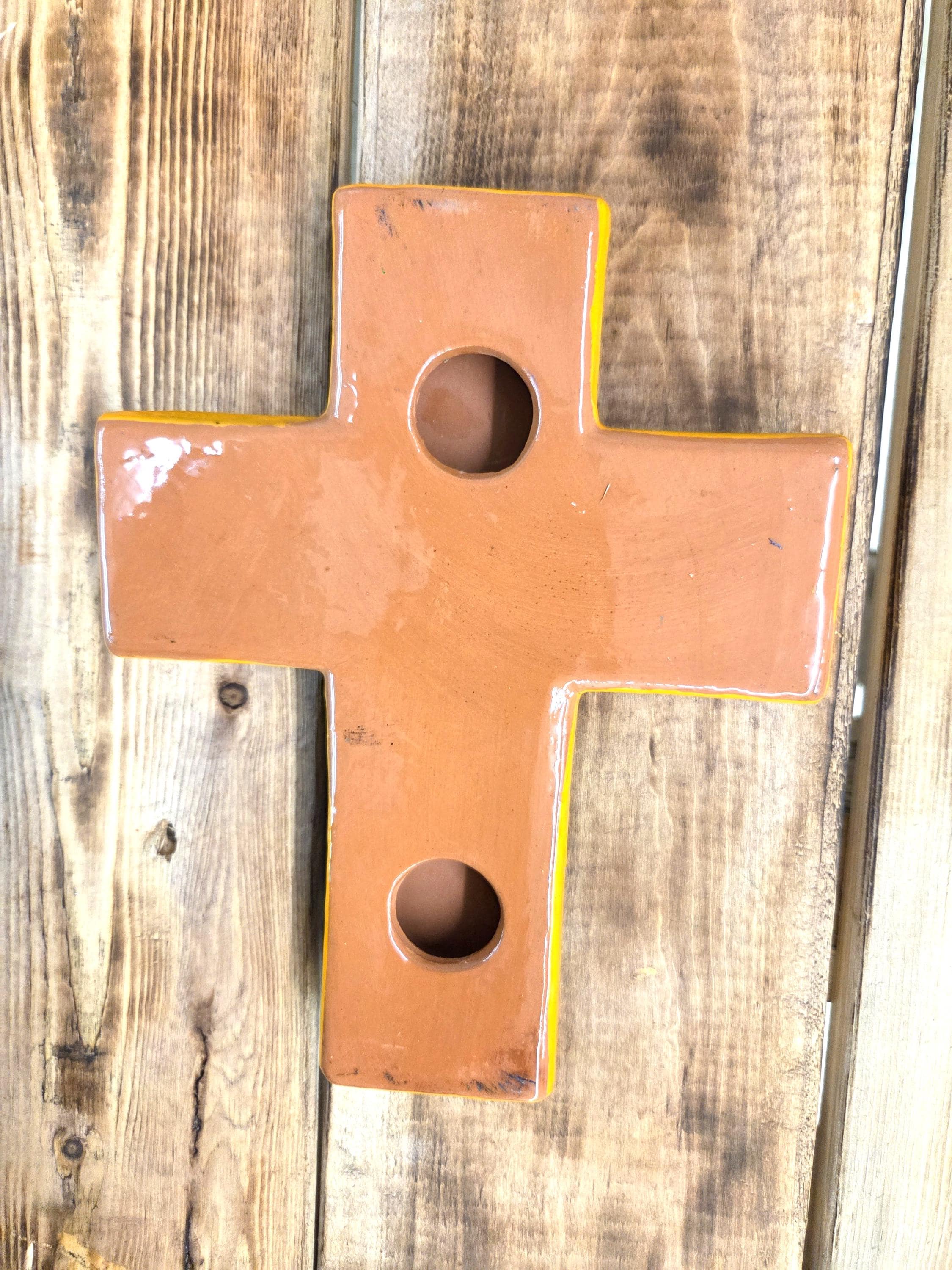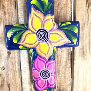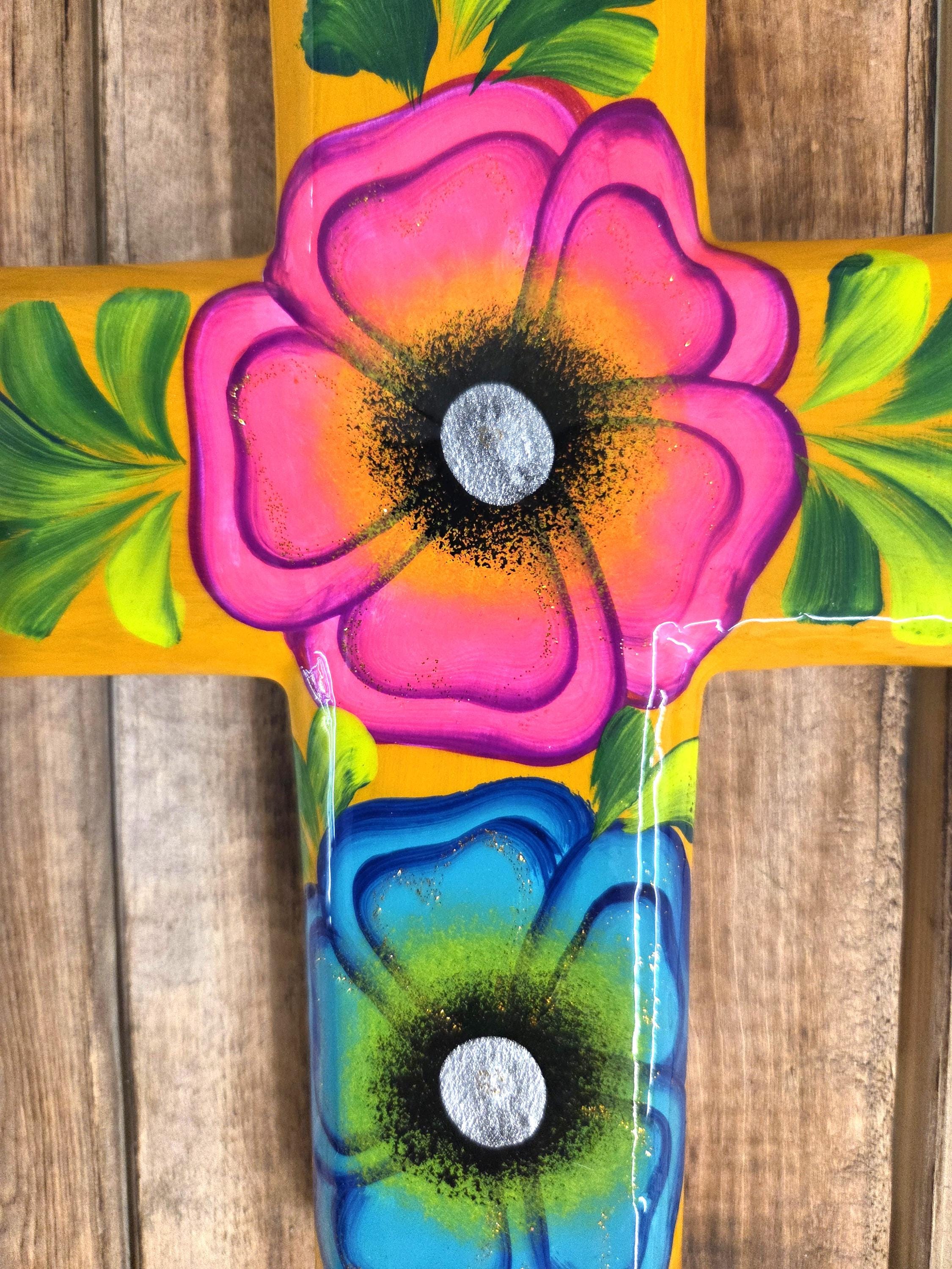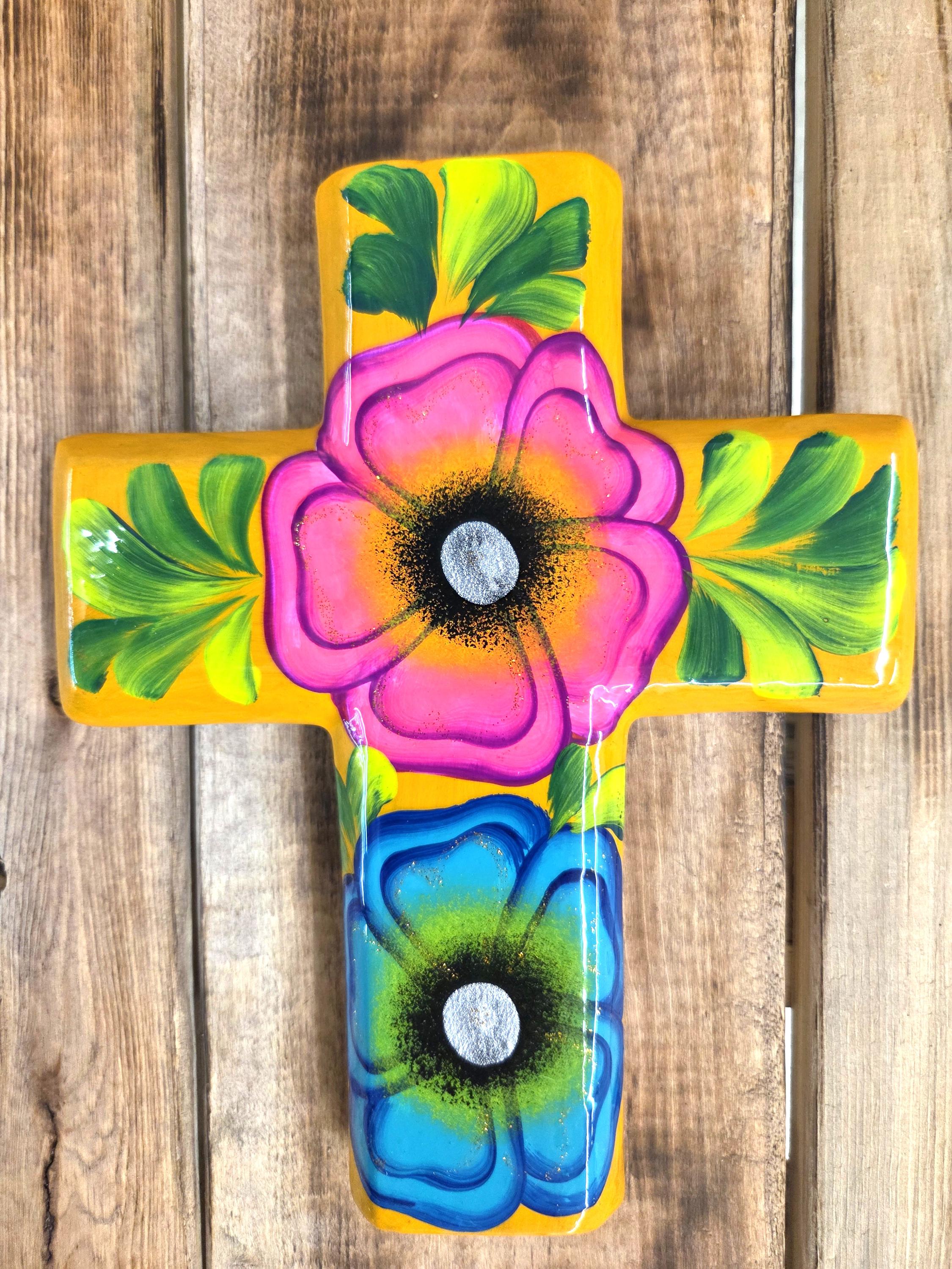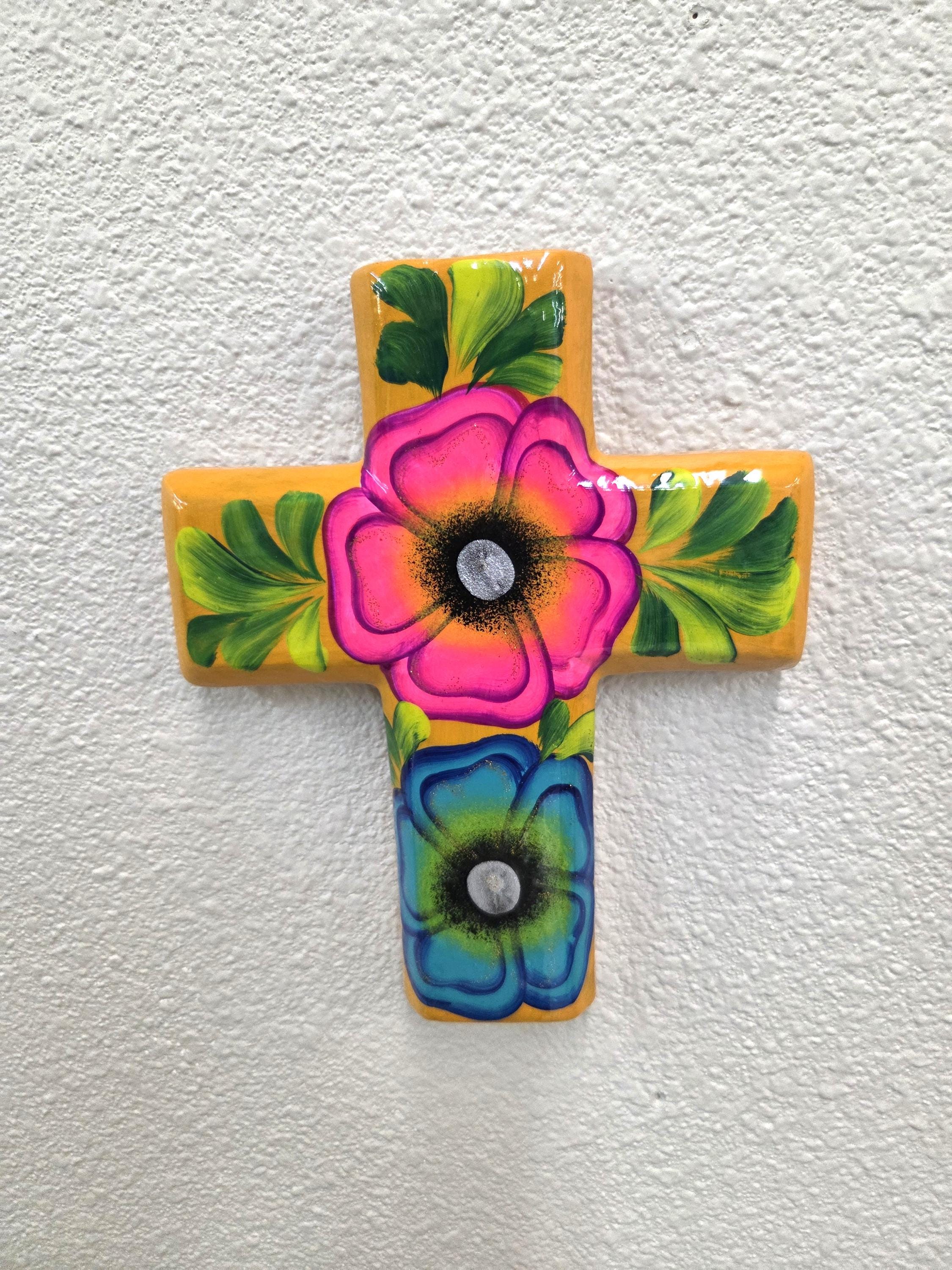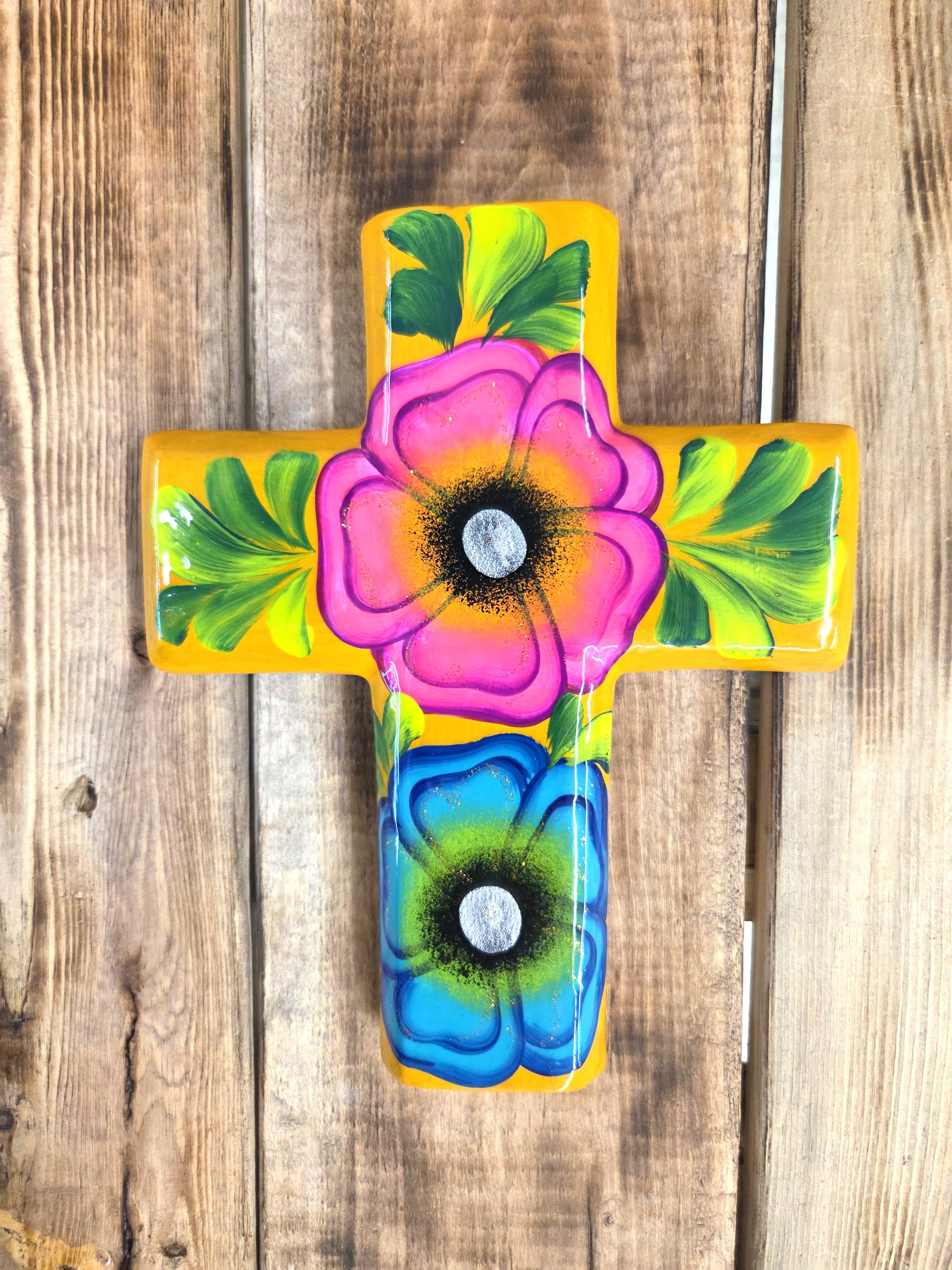 Add a touch of authentic Mexican artistry to your home with this one‑of‑a‑kind hand‑painted cross, crafted by skilled artisans in Mexico. Standing approximately 8¼" tall and 6½" wide, each piece features unique, irregular shaping and beautifully detailed hand‑painted designs that celebrate traditional craftsmanship. Because every cross is handmade rather than machine‑produced, slight imperfections may appear—these natural variations are part of its charm and ensure that no two pieces are ever alike. The cross includes a convenient hole on the back for easy wall hanging, making it a meaningful and eye‑catching addition to any room or a thoughtful gift for someone special.