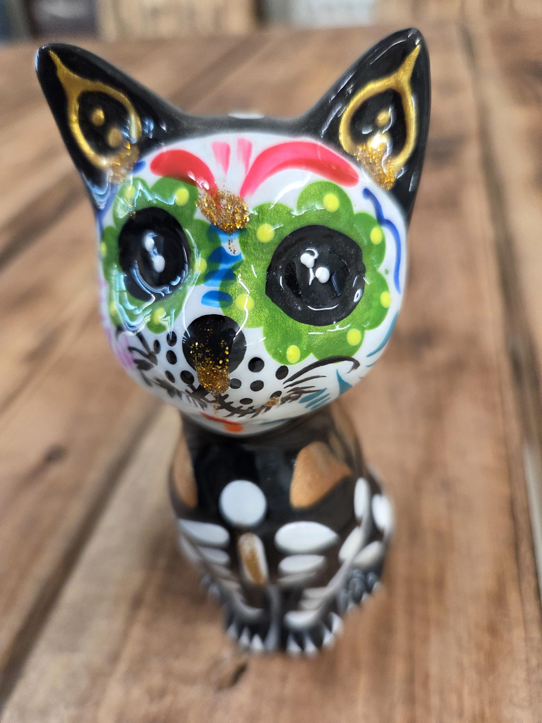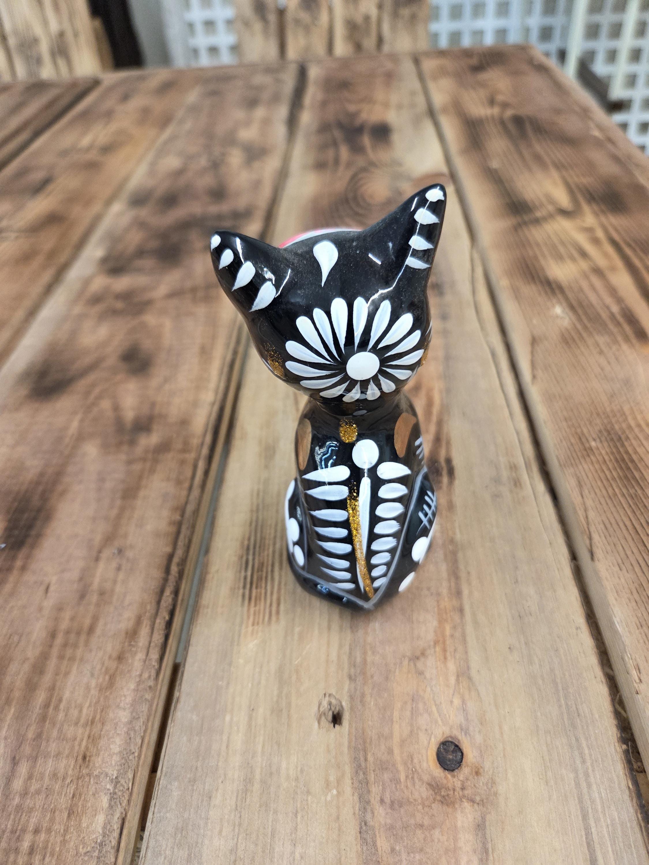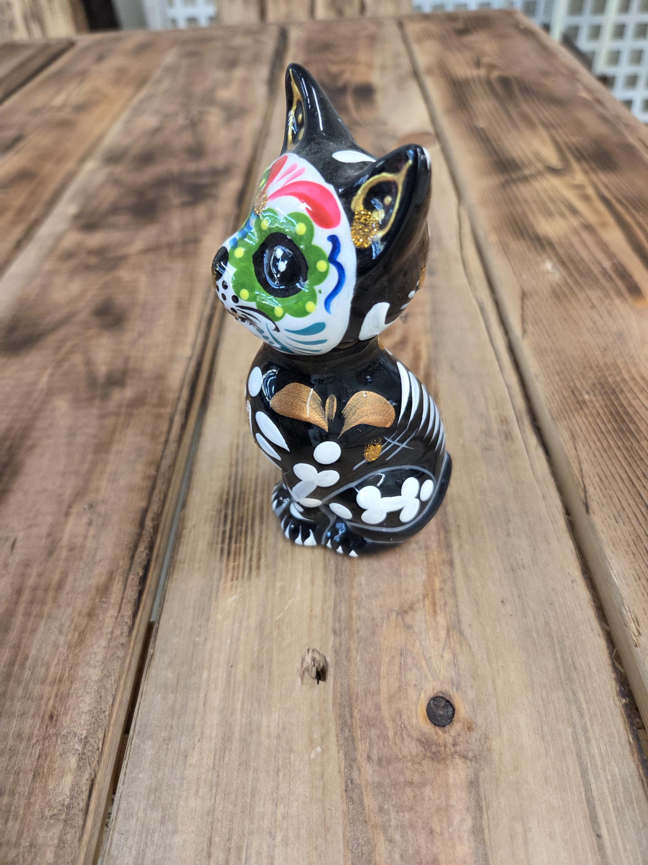 This charming handmade 5-inch ceramic kitty cat (gato) is a vibrant piece of authentic Mexican folk art, lovingly crafted and hand‑painted by skilled artisans in Mexico. Every figurine is unique, showcasing detailed brushwork, bold colors, and the joyful artistic style traditional to Mexican ceramic craftsmanship. Its compact size makes it perfect for displaying on shelves, desks, or altars, and it adds a warm, playful touch to any home décor. Whether you're a cat lover, a collector of folk art, or searching for a meaningful handmade gift, this delightful kitty brings personality, culture, and artisan beauty into any space.