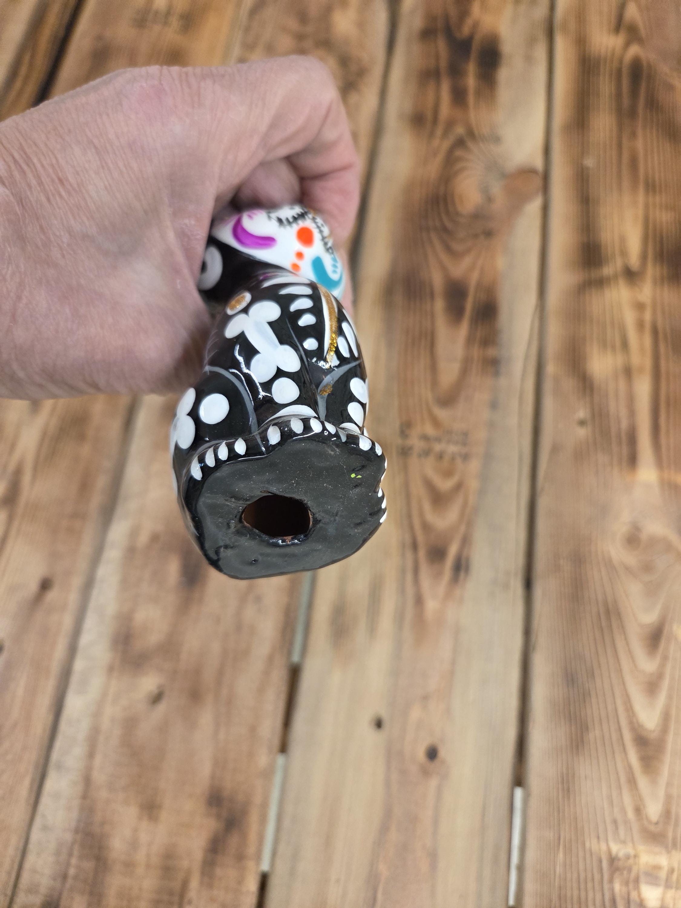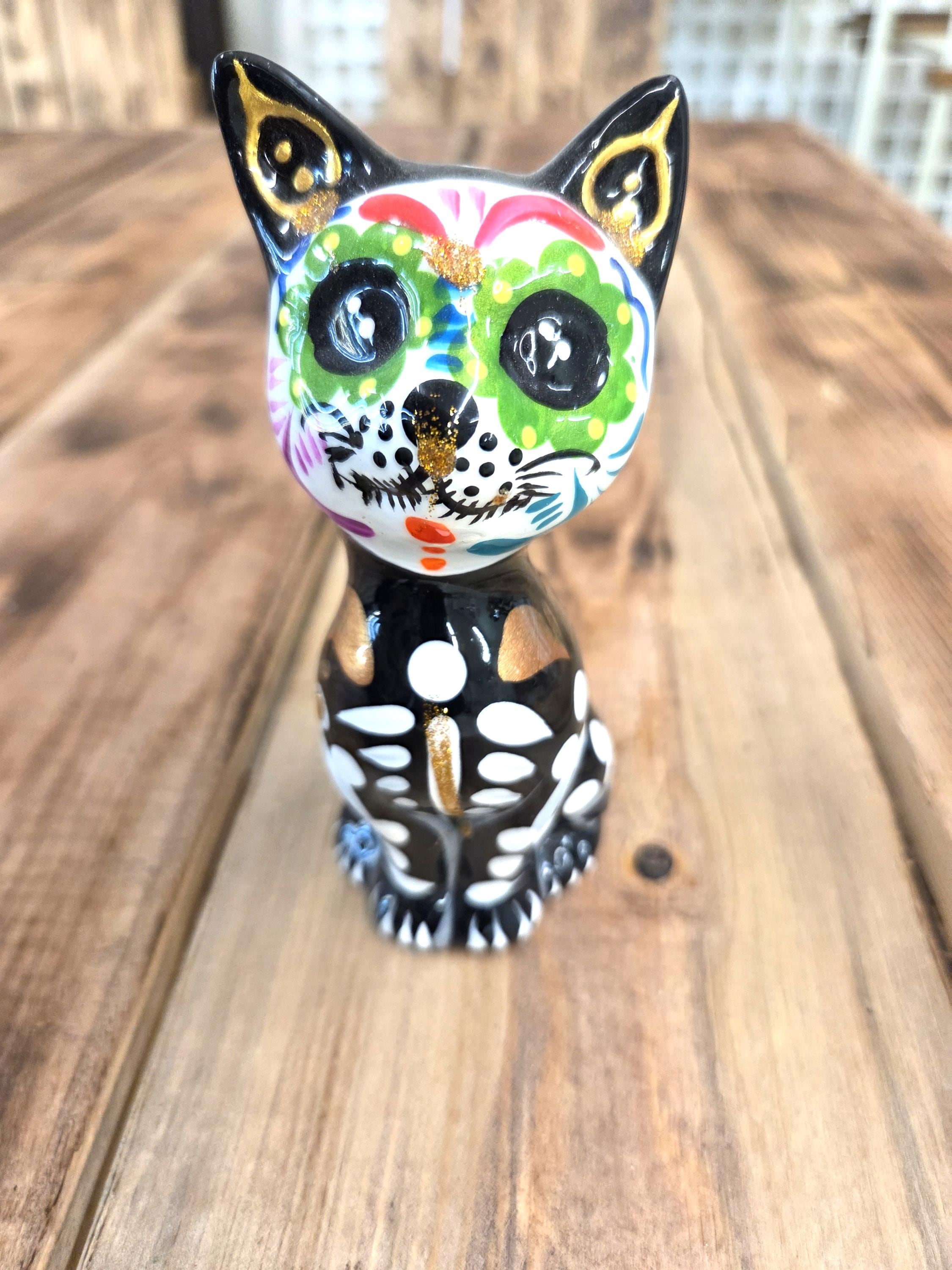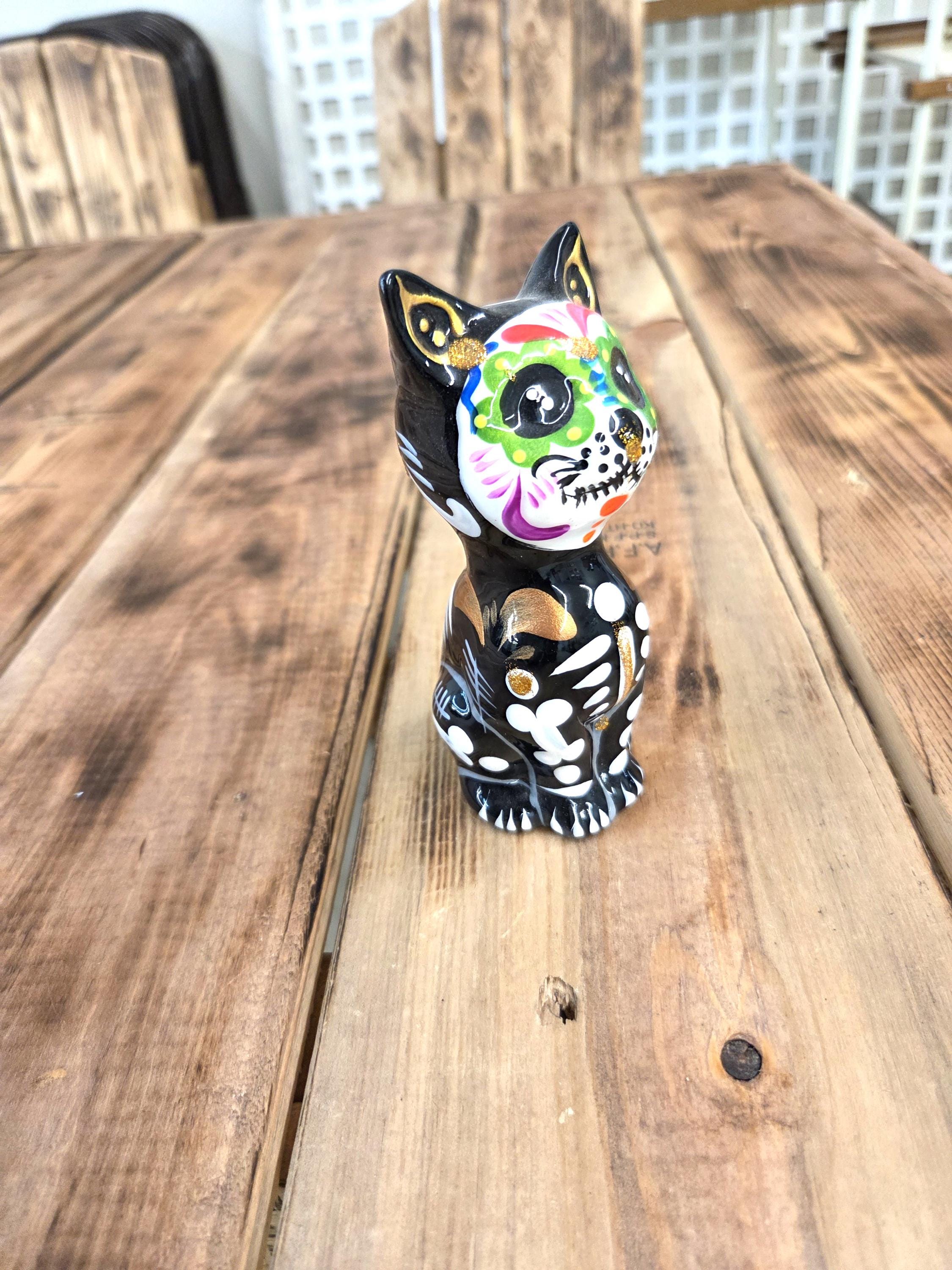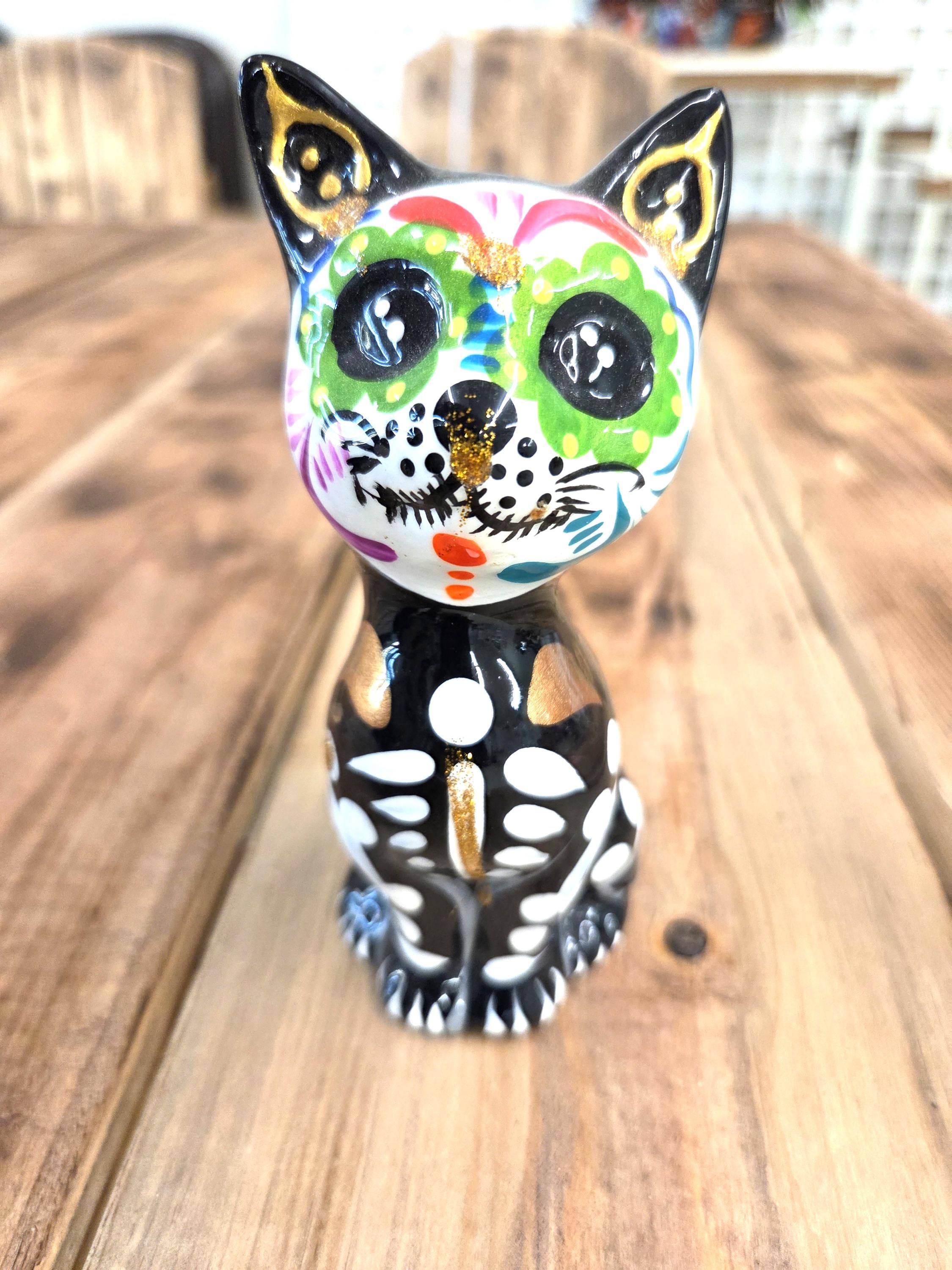 This charming handmade 5-inch ceramic kitty cat (gato) is a vibrant piece of authentic Mexican folk art, lovingly crafted and hand‑painted by skilled artisans in Mexico. Every figurine is unique, showcasing detailed brushwork, bold colors, and the joyful artistic style traditional to Mexican ceramic craftsmanship. Its compact size makes it perfect for displaying on shelves, desks, or altars, and it adds a warm, playful touch to any home décor. Whether you're a cat lover, a collector of folk art, or searching for a meaningful handmade gift, this delightful kitty brings personality, culture, and artisan beauty into any space.
