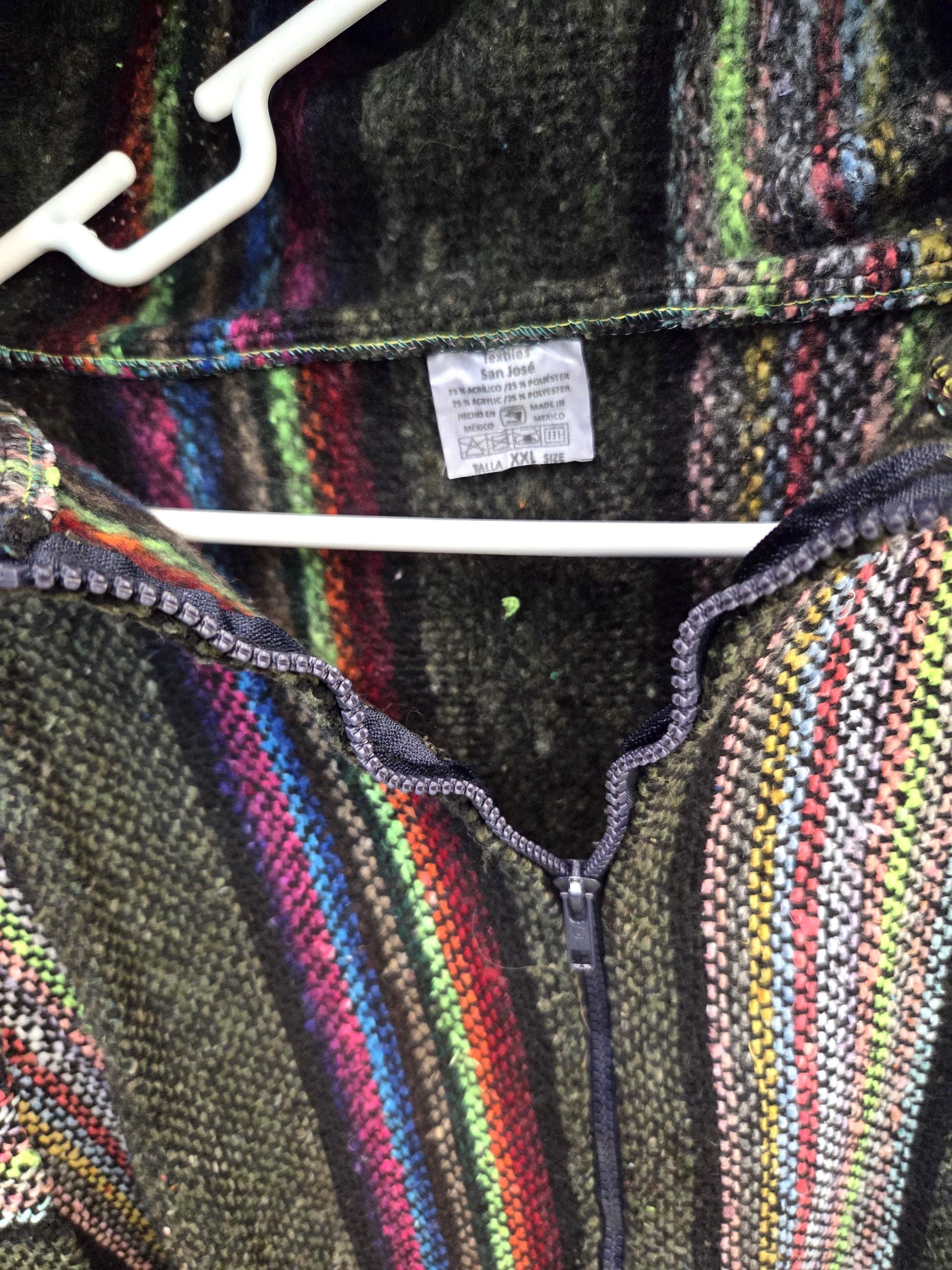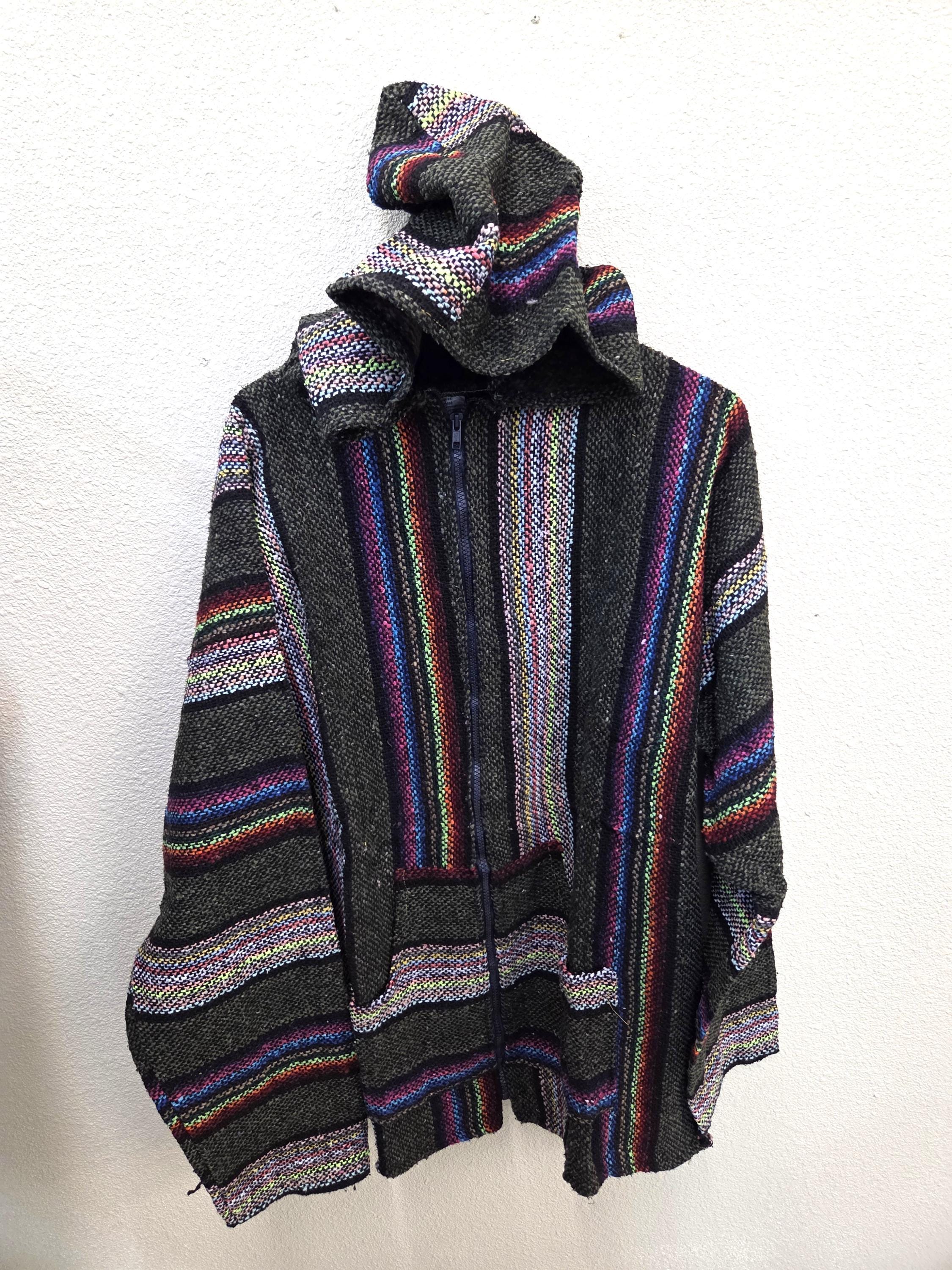 This 2X zipper Baja hoodie delivers the classic drug‑rug look with the comfort and convenience of a full front zip. Looks great on the guys but even nicer on our lovely lady friends. Hand‑woven in Mexico with soft, durable fibers, it’s a perfect everyday layer for beach days, festivals, cool evenings, or casual wear. The serape‑inspired pattern gives it that authentic Baja vibe while the roomy unisex fit makes it easy to throw on over any outfit. A great choice for anyone who wants a lightweight, breathable poncho‑style hoodie with real Mexican craftsmanship.